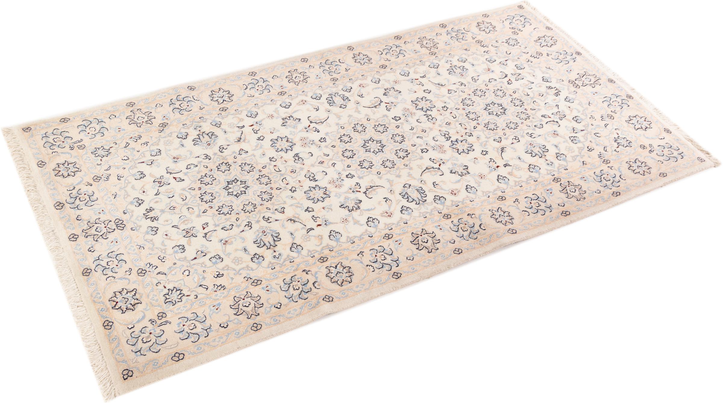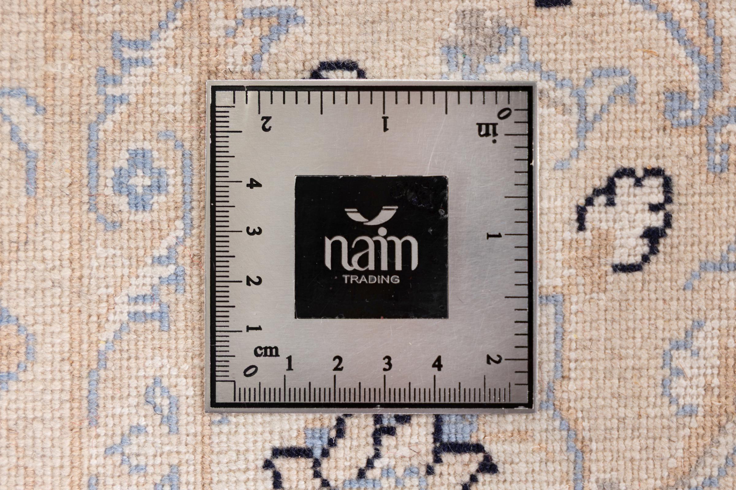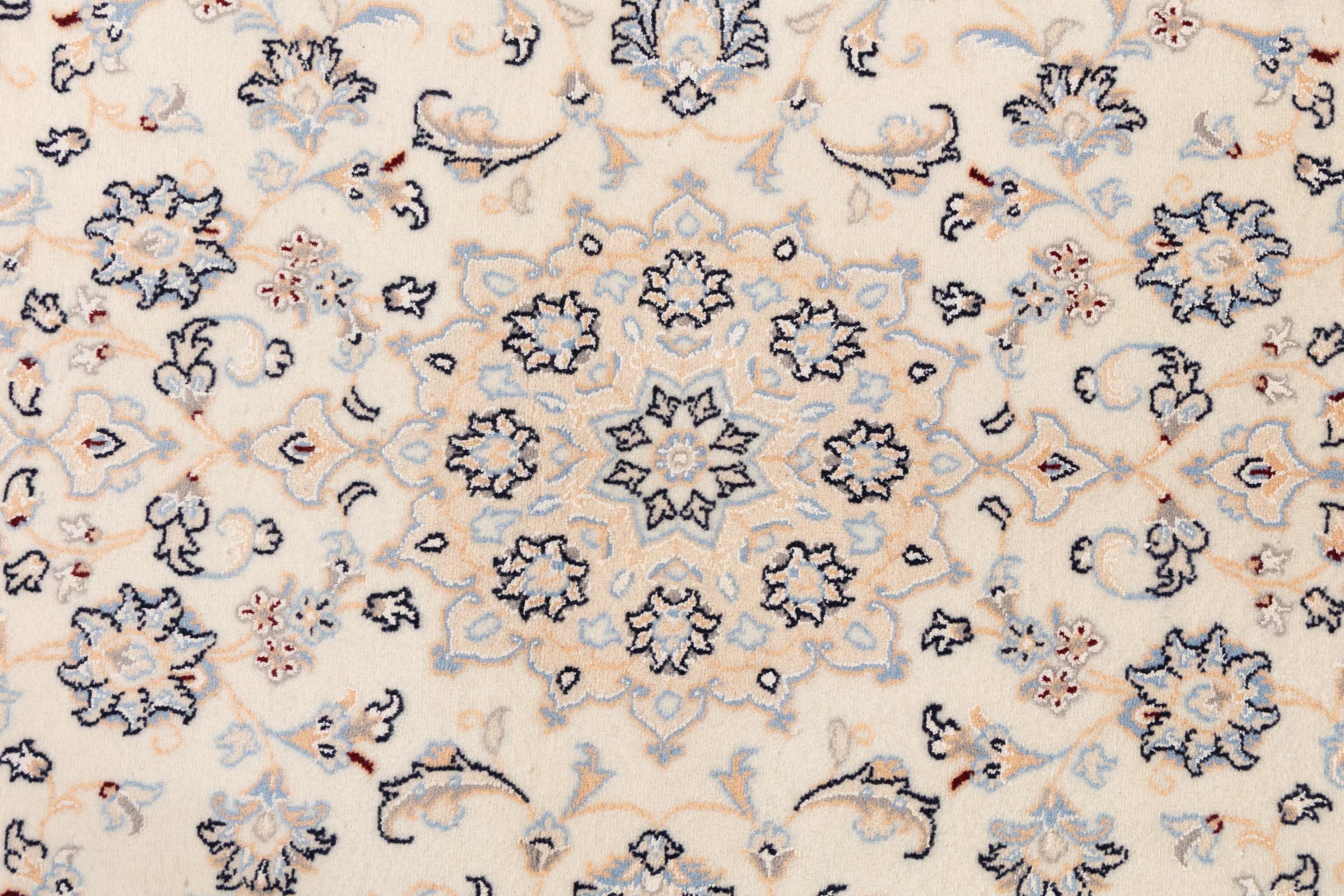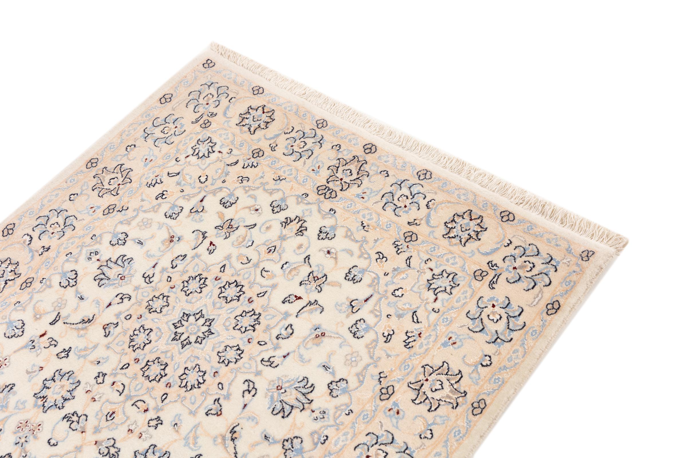 Esta alfombra Nain está clasificada como 9La. Su excelente calidad y su bello diseño oriental con motivos curvilíneos harán las delicias de cualquier comprador. Esta alfombra persa fue anudada a mano en la ciudad de Nain, situada en el extremo occidental del desierto de Dasht-e-Kavir, con lana de alta calidad y seda natural. Las alfombras Nain 9La son claramente más finas que las 12La y ya muestran bellos detalles.