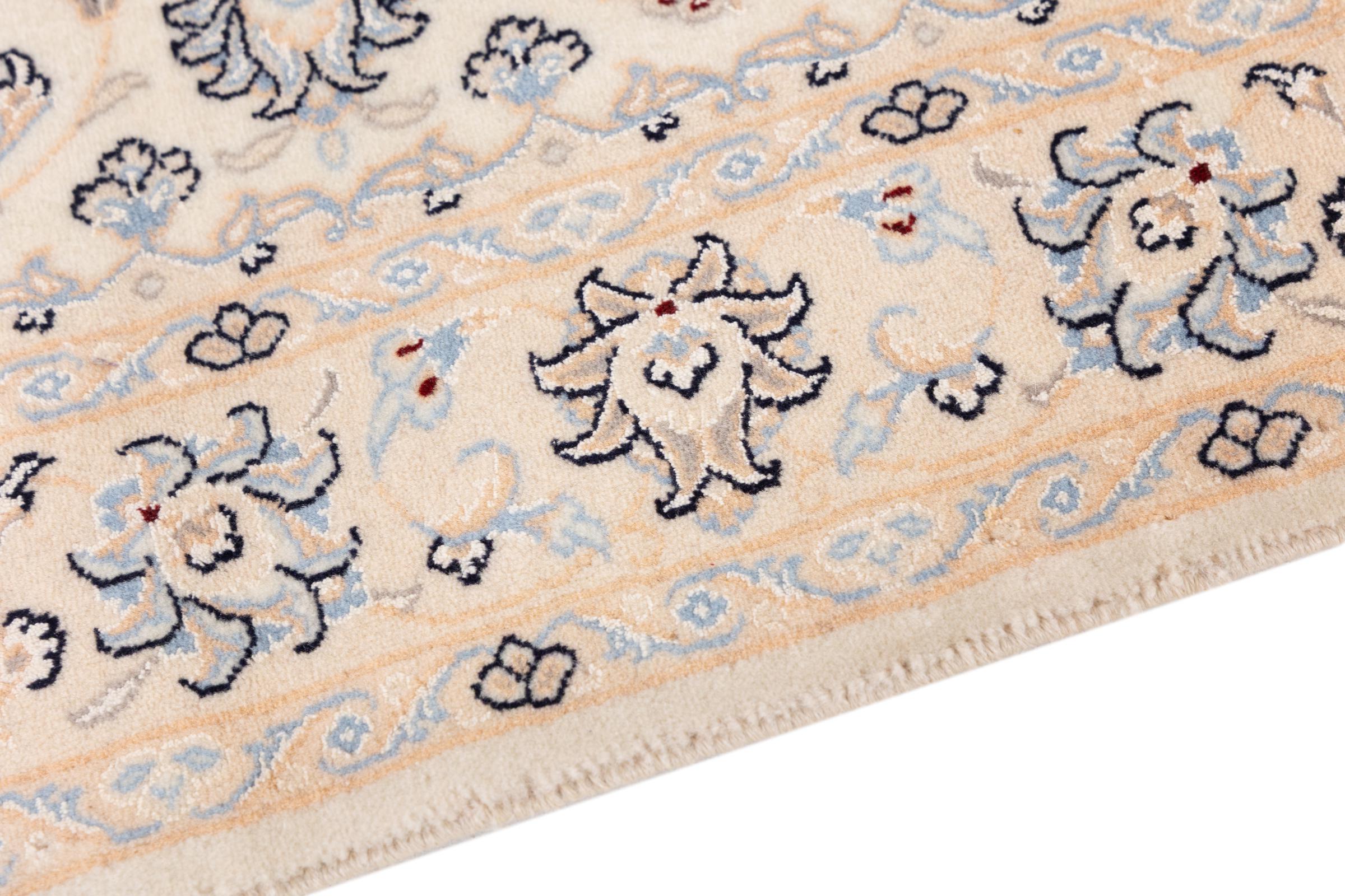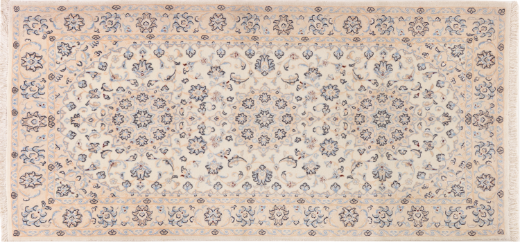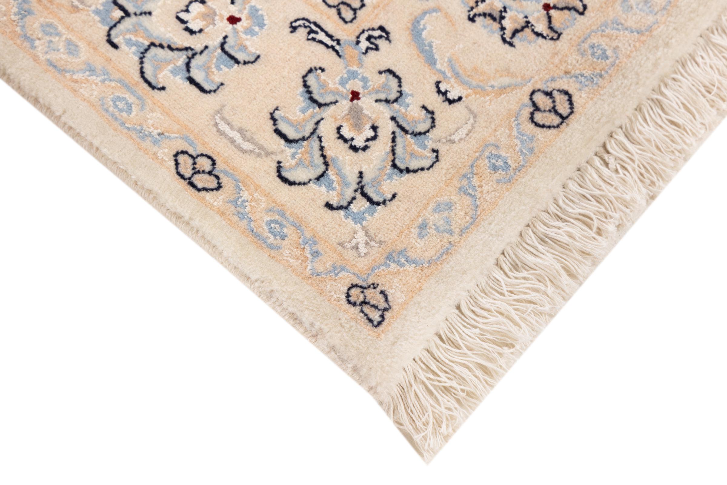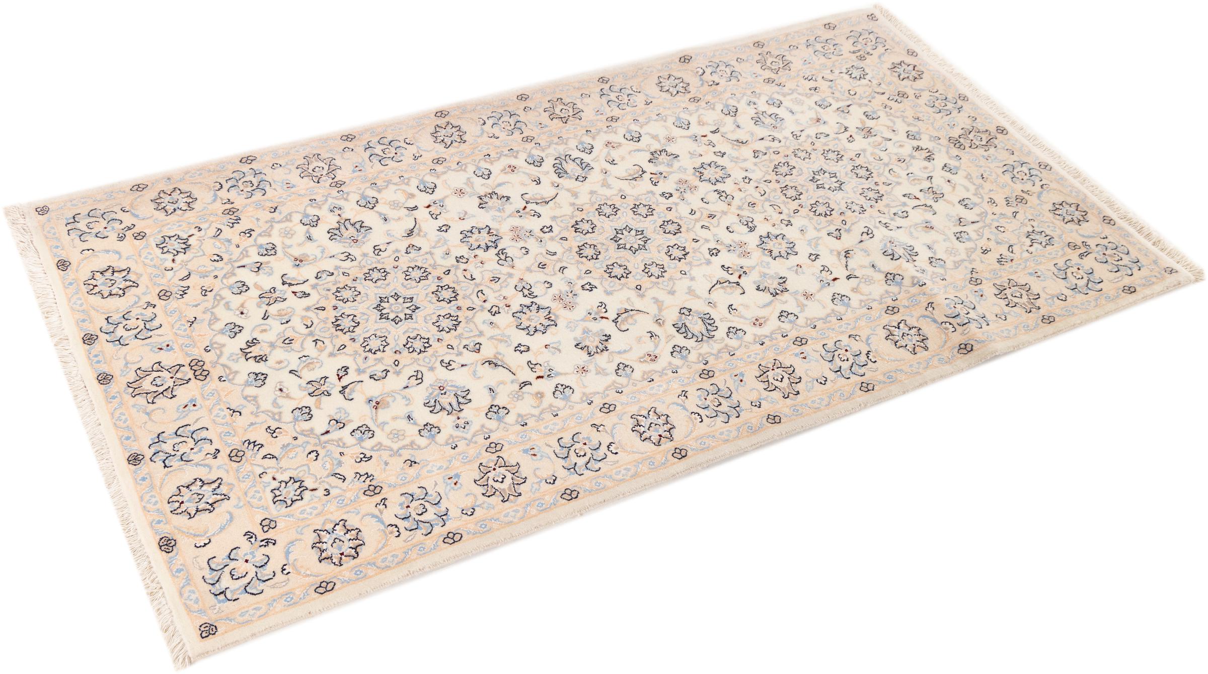Esta alfombra Nain está clasificada como 9La. Su excelente calidad y su bello diseño oriental con motivos curvilíneos harán las delicias de cualquier comprador. Esta alfombra persa fue anudada a mano en la ciudad de Nain, situada en el extremo occidental del desierto de Dasht-e-Kavir, con lana de alta calidad y seda natural. Las alfombras Nain 9La son claramente más finas que las 12La y ya muestran bellos detalles.