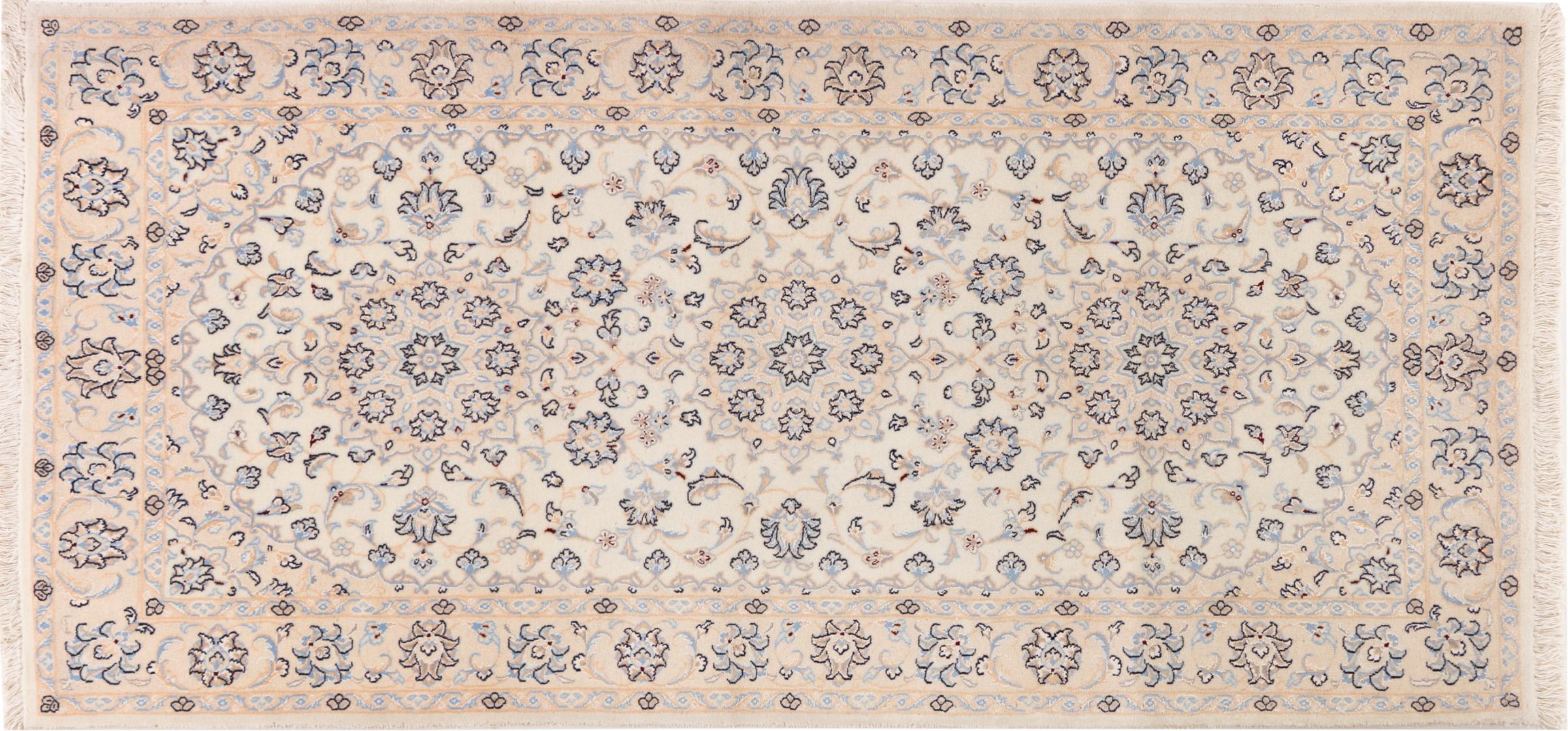 Las alfombras de la ciudad de Nain, en la frontera de uno de los mayores desiertos de Irán, están entre las alfombras persas más famosas del mundo. Su diseño típico es inconfundible con adornos florales, un medallón central y tonos beige y rojo o azul. Gracias a sus designaciones 4La, 6La, 9La y 12La, las sutilezas de una alfombra de Nain se pueden ver a simple vista. Cuanto más bajo sea el número "La", más alta es la densidad del nudo y por lo tanto más fina es la alfombra.