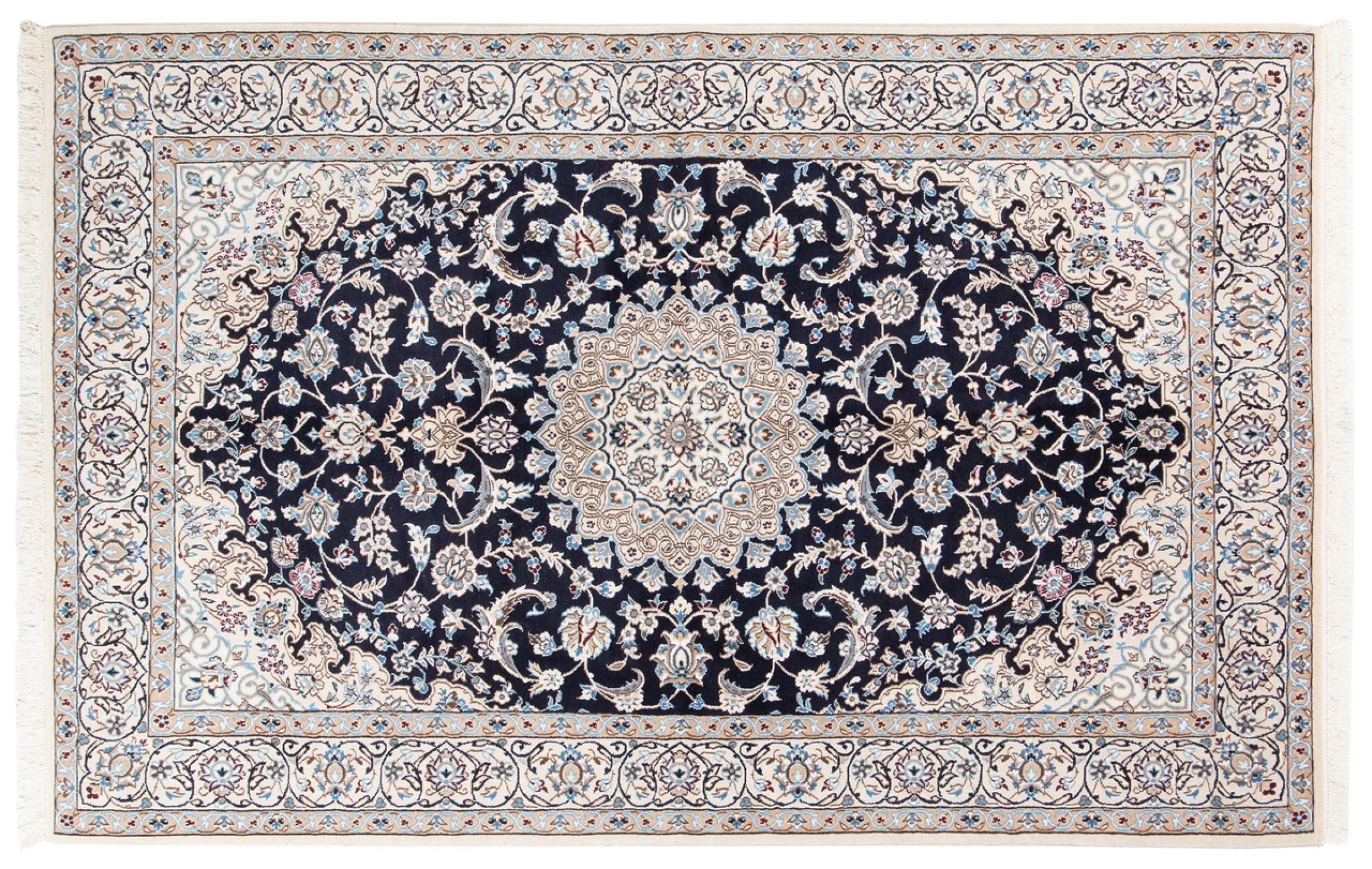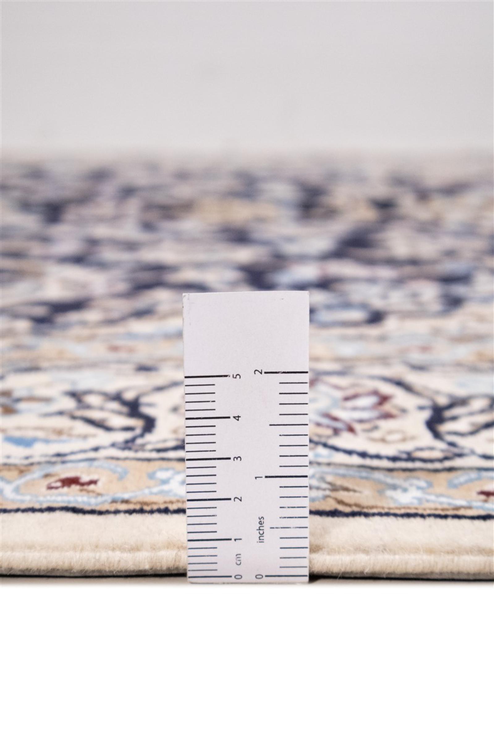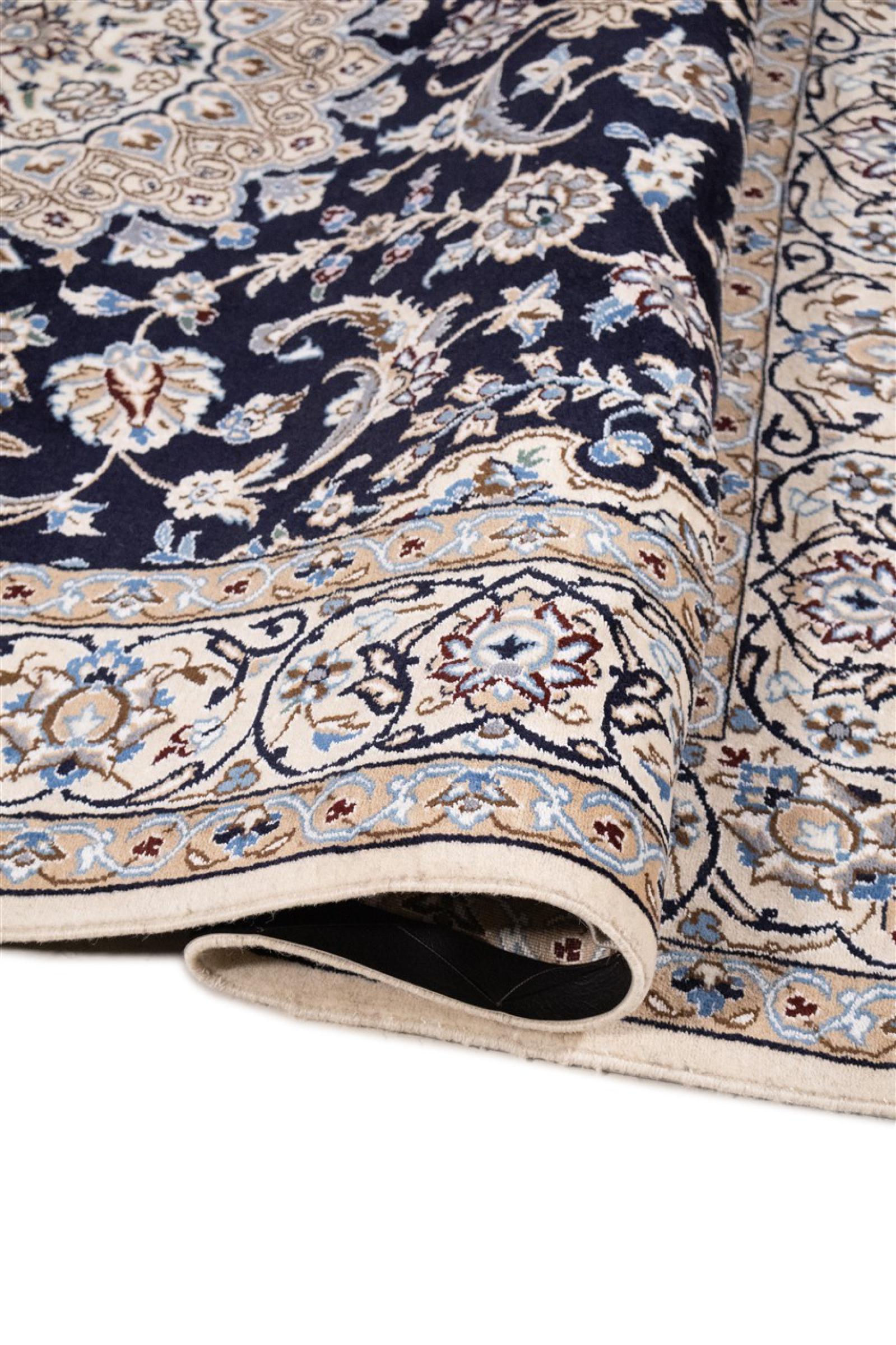 Esta alfombra Nain está clasificada como 9La. Su excelente calidad y su bello diseño oriental con motivos curvilíneos harán las delicias de cualquier comprador. Esta alfombra persa fue anudada a mano en la ciudad de Nain, situada en el extremo occidental del desierto de Dasht-e-Kavir, con lana de alta calidad y seda natural. Las alfombras Nain 9La son claramente más finas que las 12La y ya muestran bellos detalles.