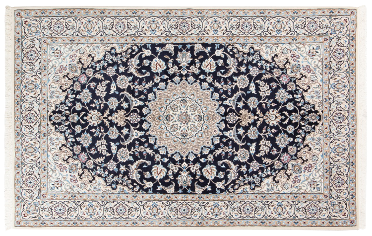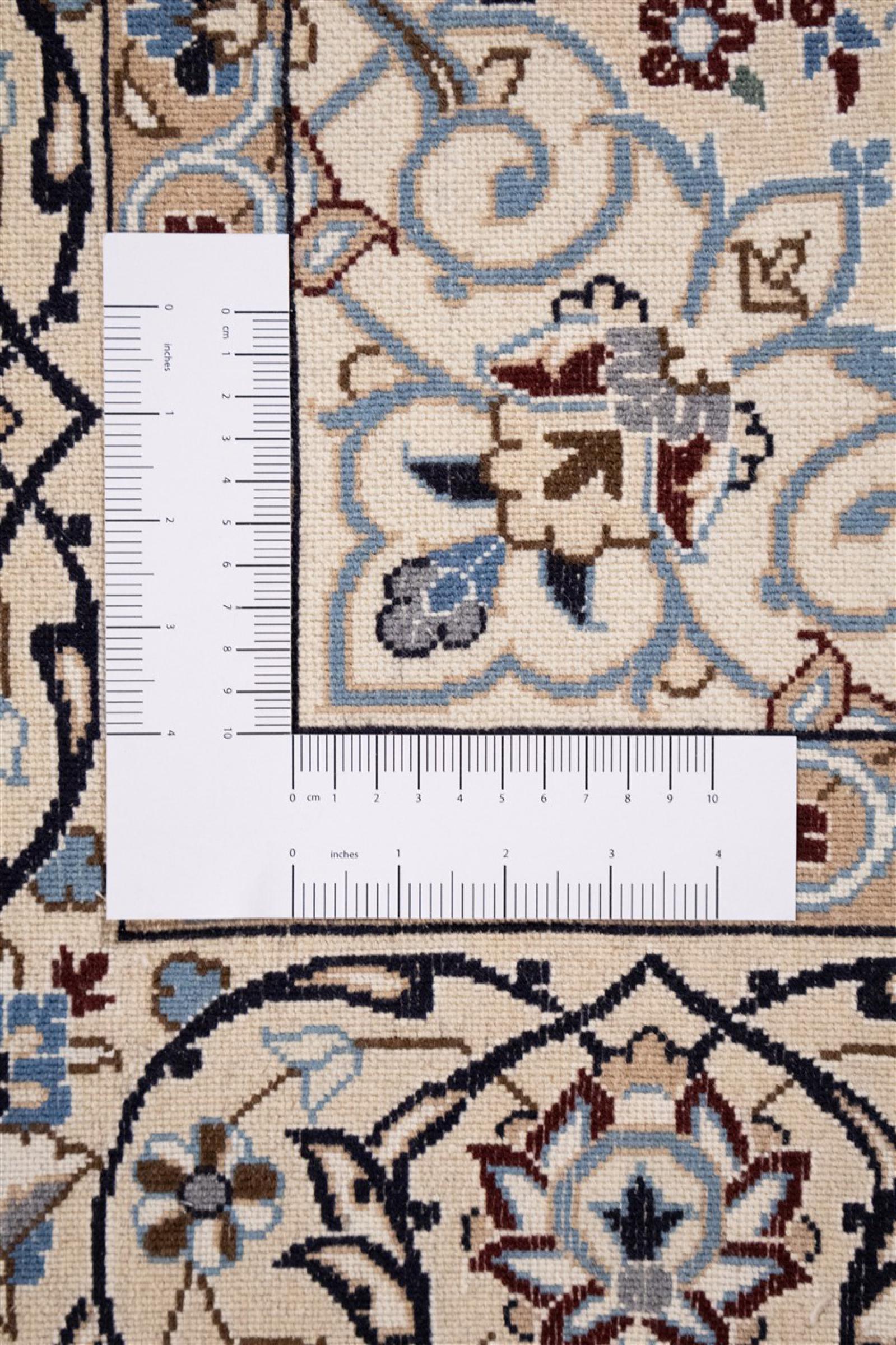 Las alfombras de la ciudad de Nain, en la frontera de uno de los mayores desiertos de Irán, están entre las alfombras persas más famosas del mundo. Su diseño típico es inconfundible con adornos florales, un medallón central y tonos beige y rojo o azul. Gracias a sus designaciones 4La, 6La, 9La y 12La, las sutilezas de una alfombra de Nain se pueden ver a simple vista. Cuanto más bajo sea el número "La", más alta es la densidad del nudo y por lo tanto más fina es la alfombra.