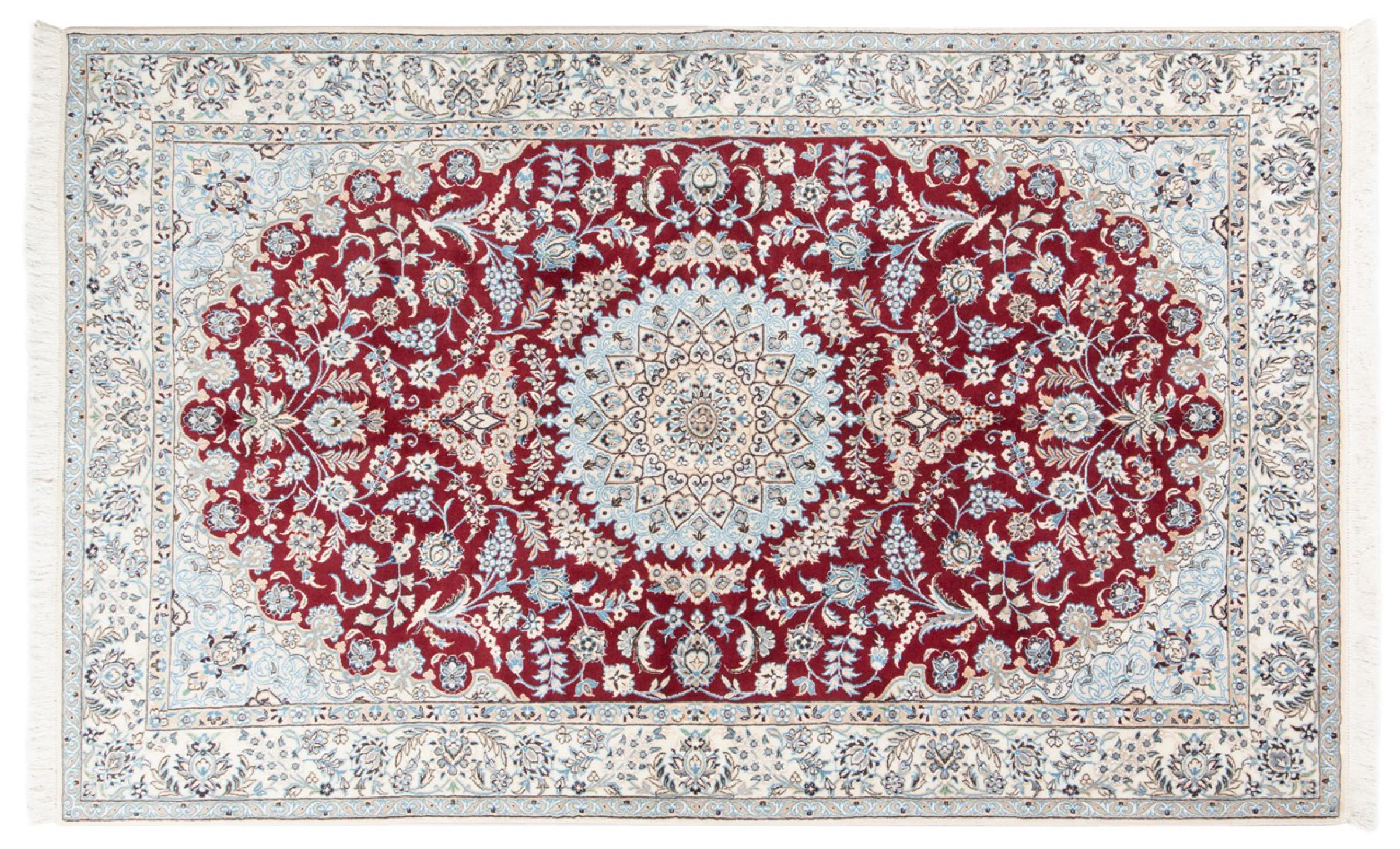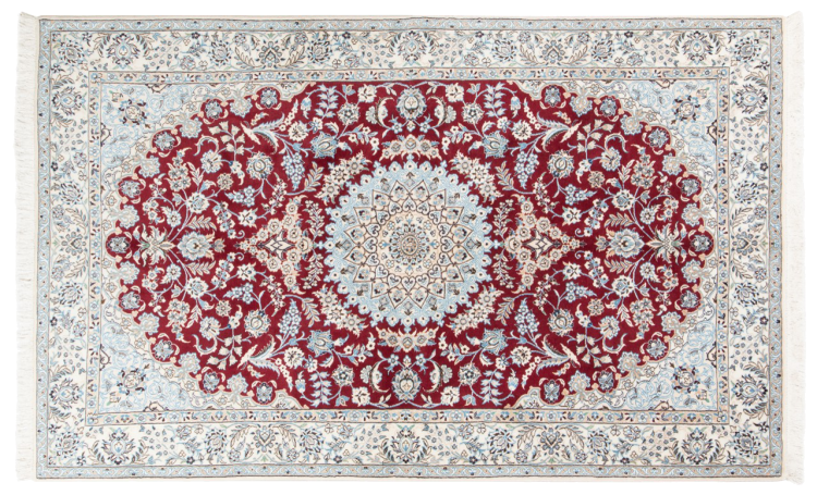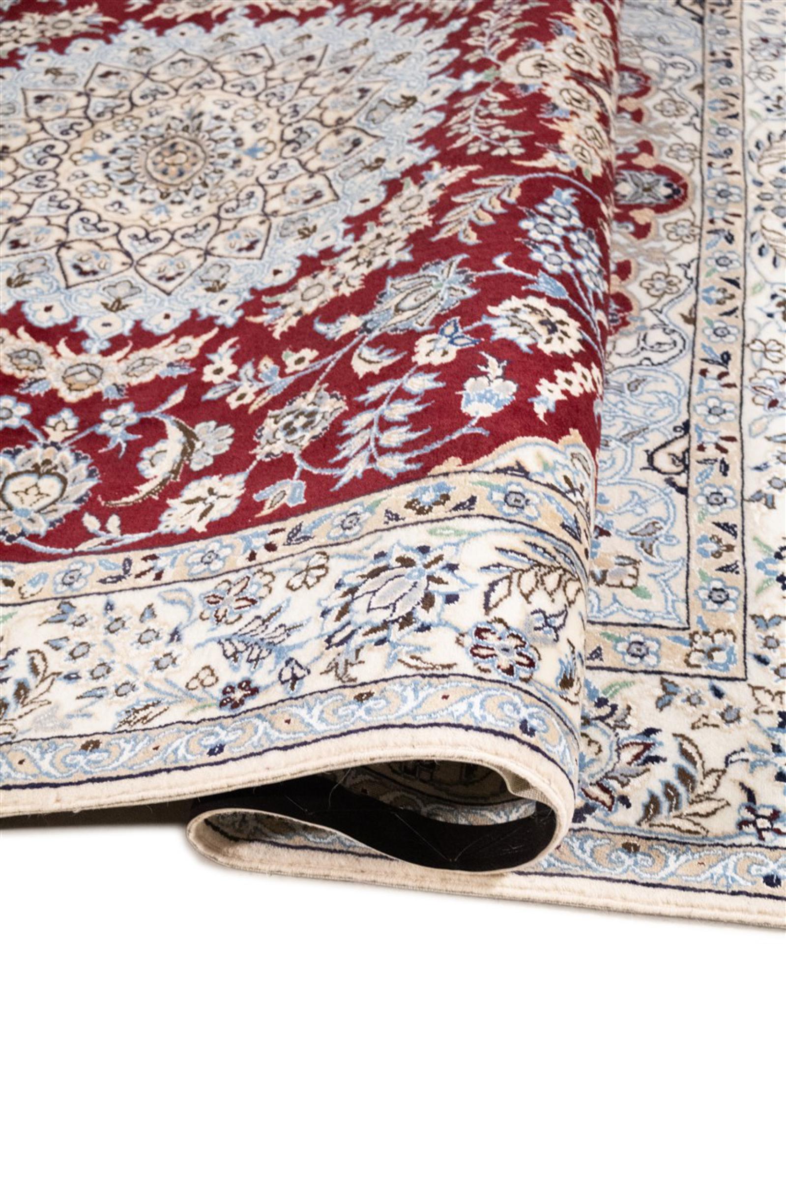 Las alfombras de la ciudad de Nain, en la frontera de uno de los mayores desiertos de Irán, están entre las alfombras persas más famosas del mundo. Su diseño típico es inconfundible con adornos florales, un medallón central y tonos beige y rojo o azul. Gracias a sus designaciones 4La, 6La, 9La y 12La, las sutilezas de una alfombra de Nain se pueden ver a simple vista. Cuanto más bajo sea el número "La", más alta es la densidad del nudo y por lo tanto más fina es la alfombra.