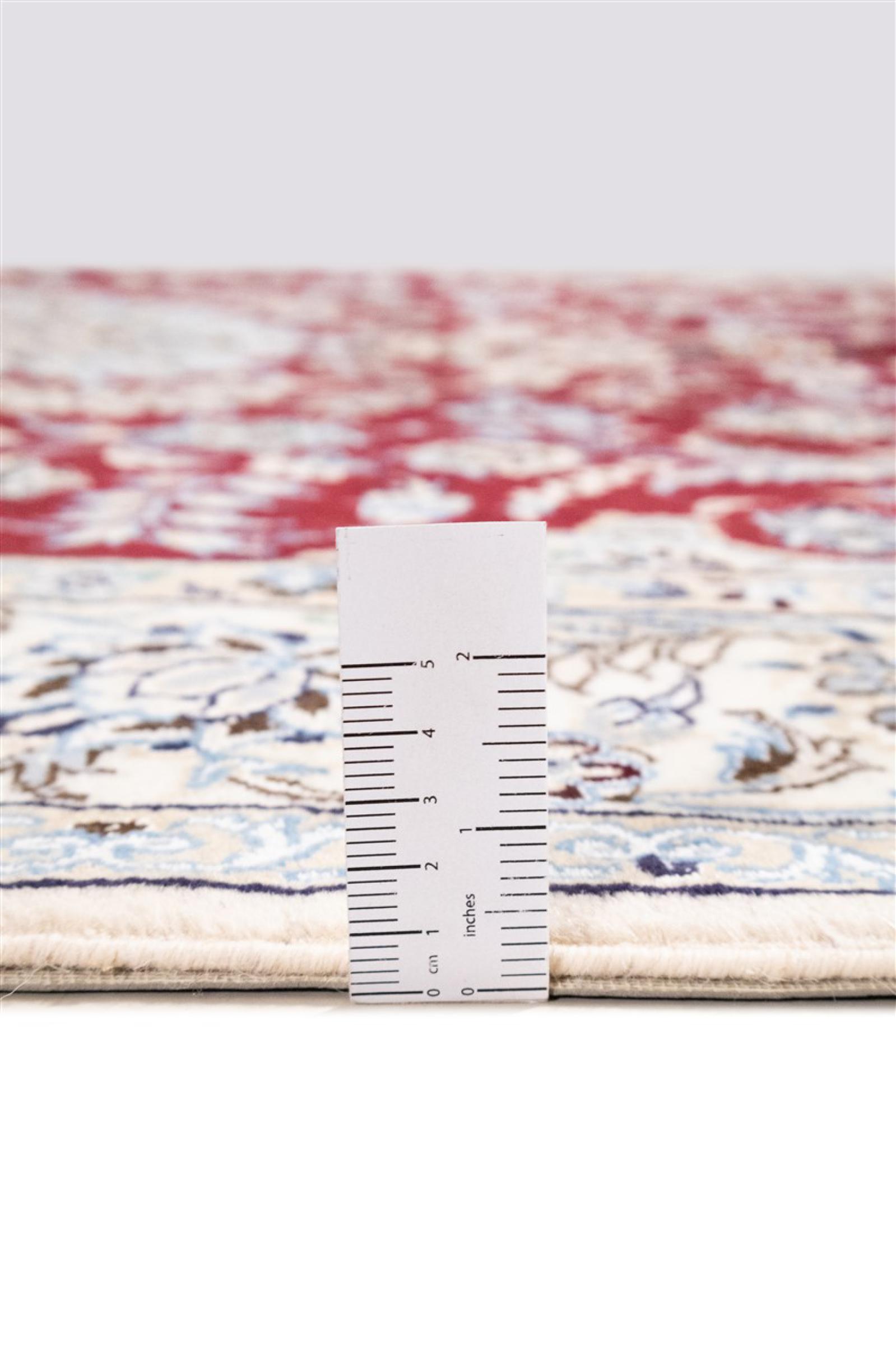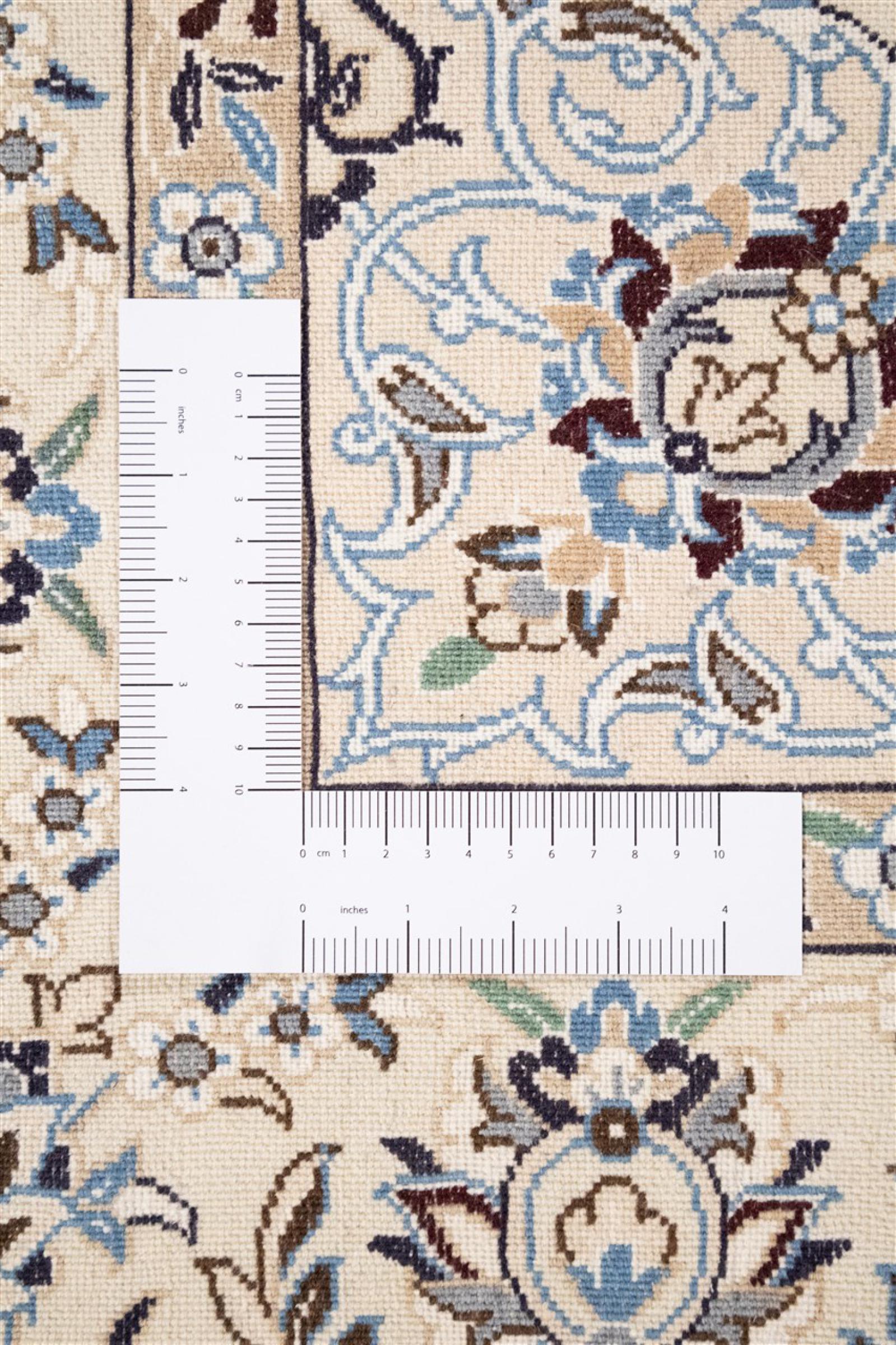 Esta alfombra Nain está clasificada como 9La. Su excelente calidad y su bello diseño oriental con motivos curvilíneos harán las delicias de cualquier comprador. Esta alfombra persa fue anudada a mano en la ciudad de Nain, situada en el extremo occidental del desierto de Dasht-e-Kavir, con lana de alta calidad y seda natural. Las alfombras Nain 9La son claramente más finas que las 12La y ya muestran bellos detalles.