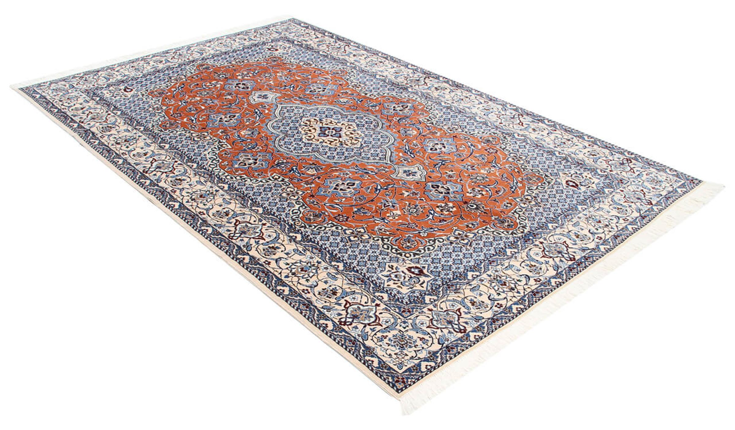 Esta alfombra Nain está clasificada como 9La. Su excelente calidad y su bello diseño oriental con motivos curvilíneos harán las delicias de cualquier comprador. Esta alfombra persa fue anudada a mano en la ciudad de Nain, situada en el extremo occidental del desierto de Dasht-e-Kavir, con lana de alta calidad y seda natural. Las alfombras Nain 9La son claramente más finas que las 12La y ya muestran bellos detalles.