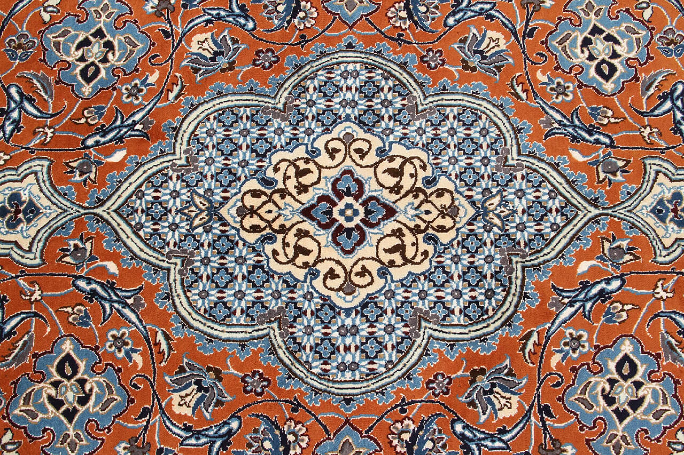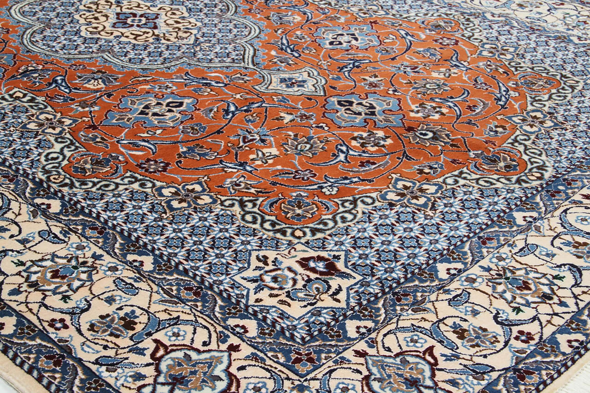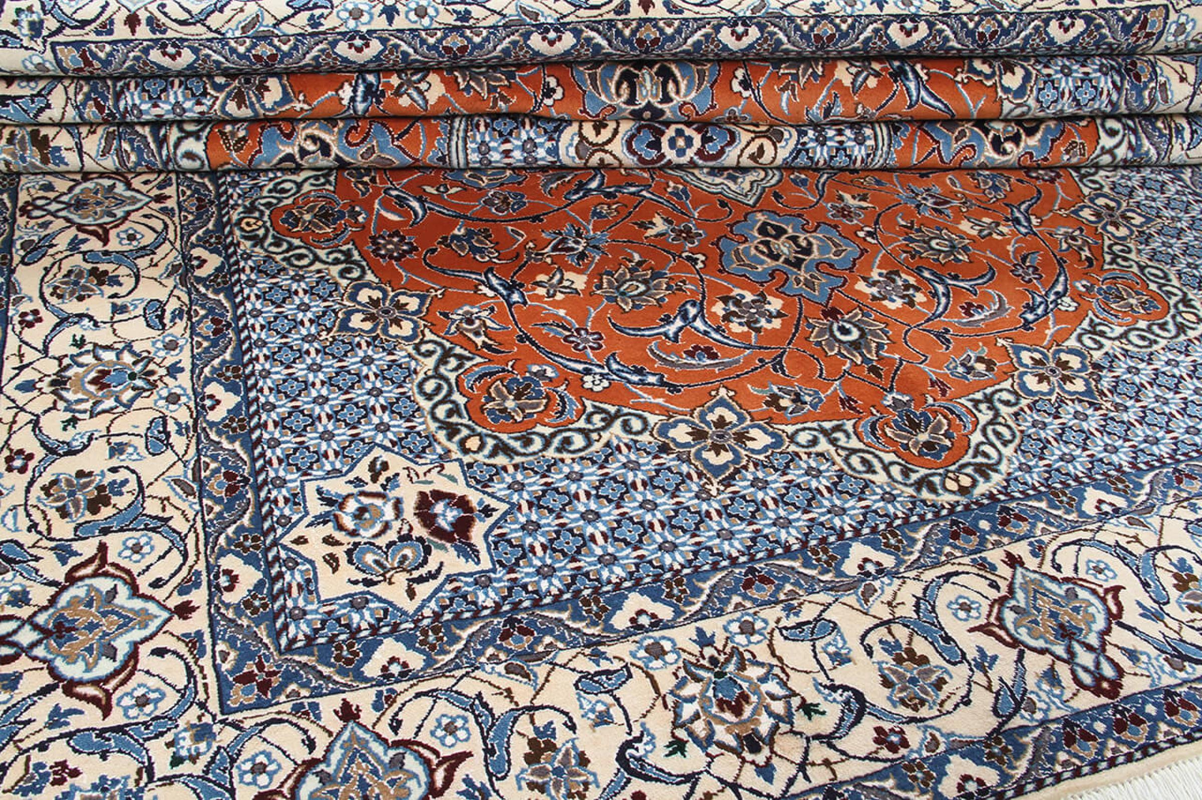 Las alfombras de la ciudad de Nain, en la frontera de uno de los mayores desiertos de Irán, están entre las alfombras persas más famosas del mundo. Su diseño típico es inconfundible con adornos florales, un medallón central y tonos beige y rojo o azul. Gracias a sus designaciones 4La, 6La, 9La y 12La, las sutilezas de una alfombra de Nain se pueden ver a simple vista. Cuanto más bajo sea el número "La", más alta es la densidad del nudo y por lo tanto más fina es la alfombra.