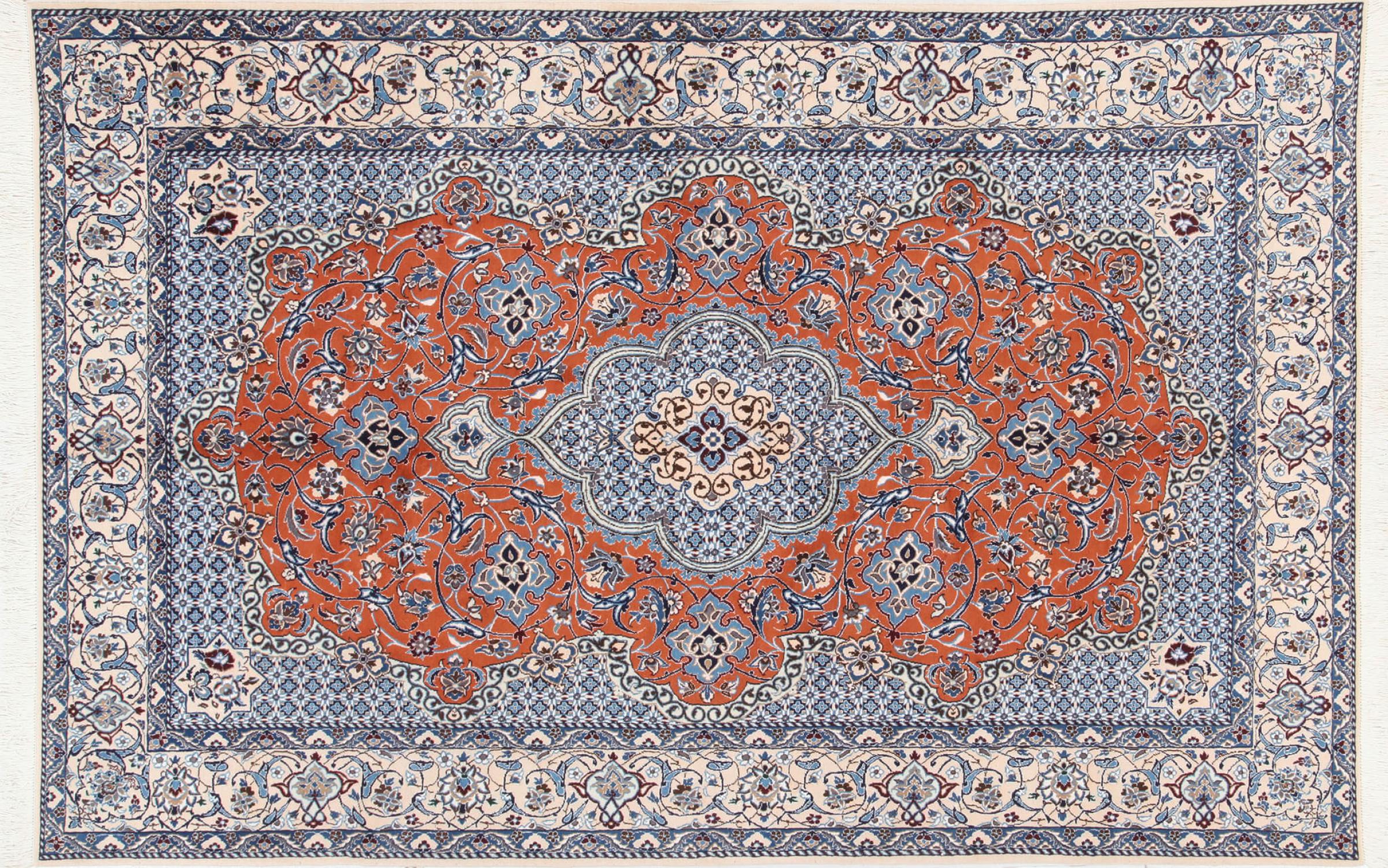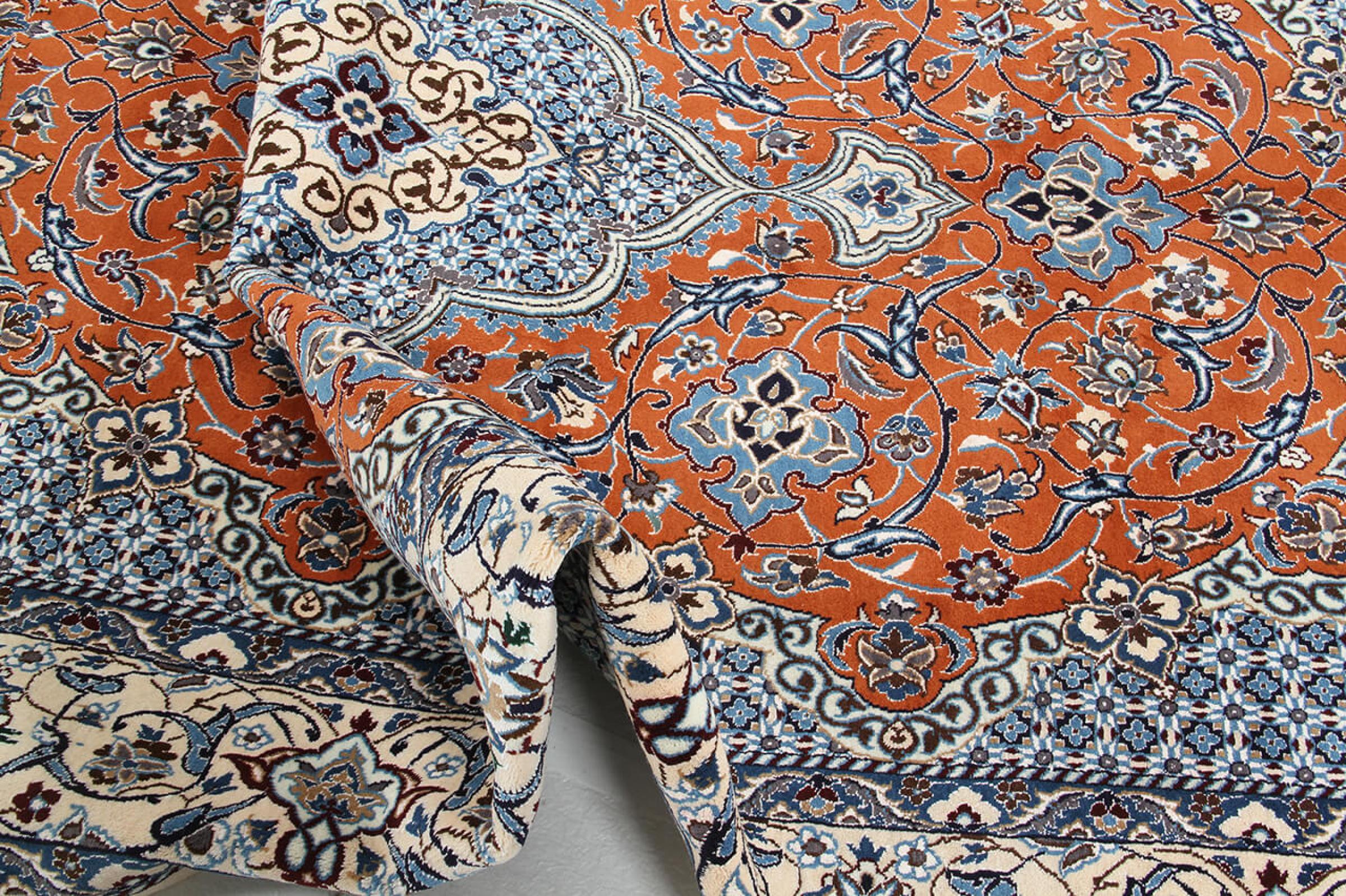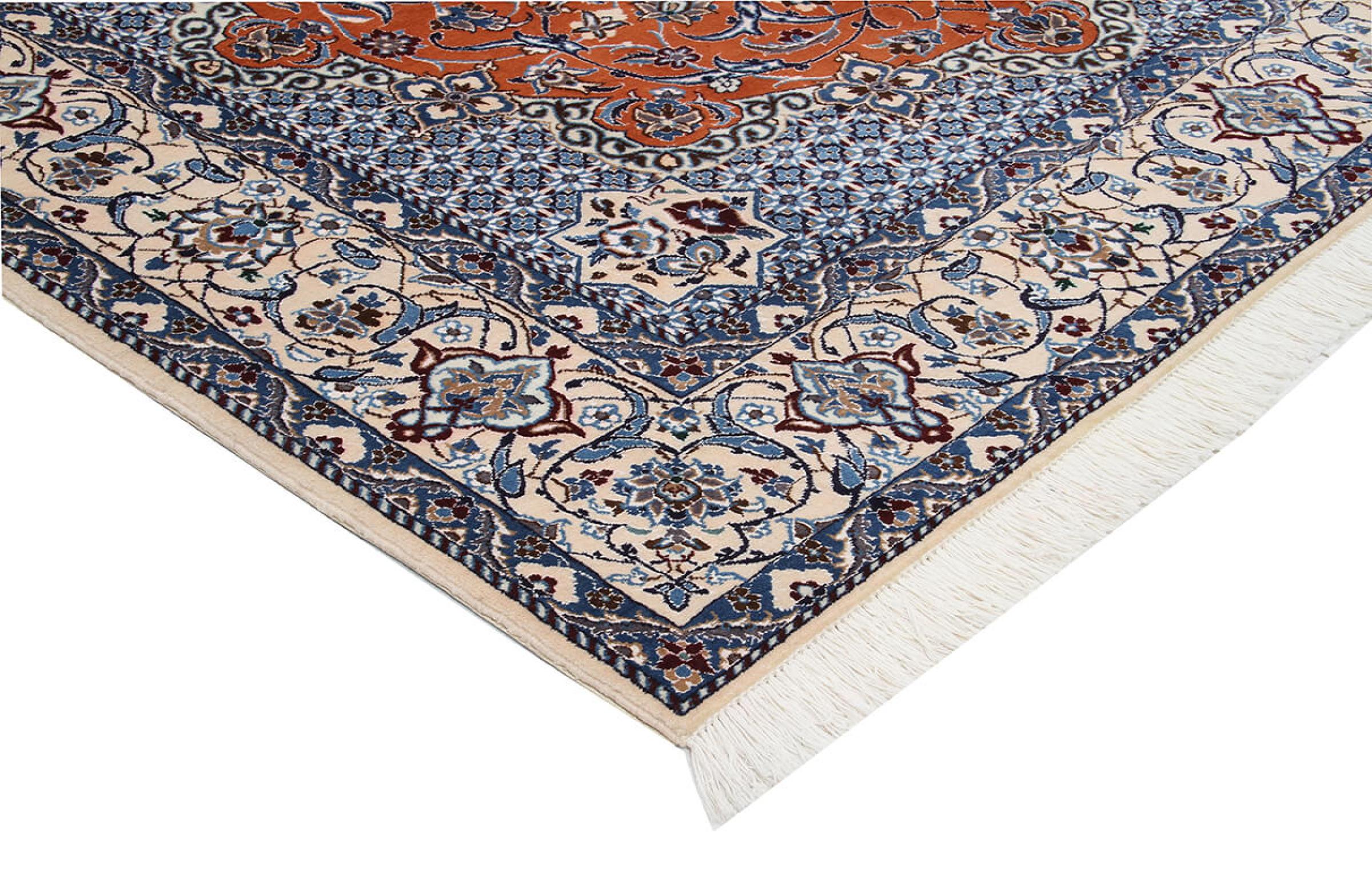 Las alfombras de la ciudad de Nain, en la frontera de uno de los mayores desiertos de Irán, están entre las alfombras persas más famosas del mundo. Su diseño típico es inconfundible con adornos florales, un medallón central y tonos beige y rojo o azul. Gracias a sus designaciones 4La, 6La, 9La y 12La, las sutilezas de una alfombra de Nain se pueden ver a simple vista. Cuanto más bajo sea el número "La", más alta es la densidad del nudo y por lo tanto más fina es la alfombra.