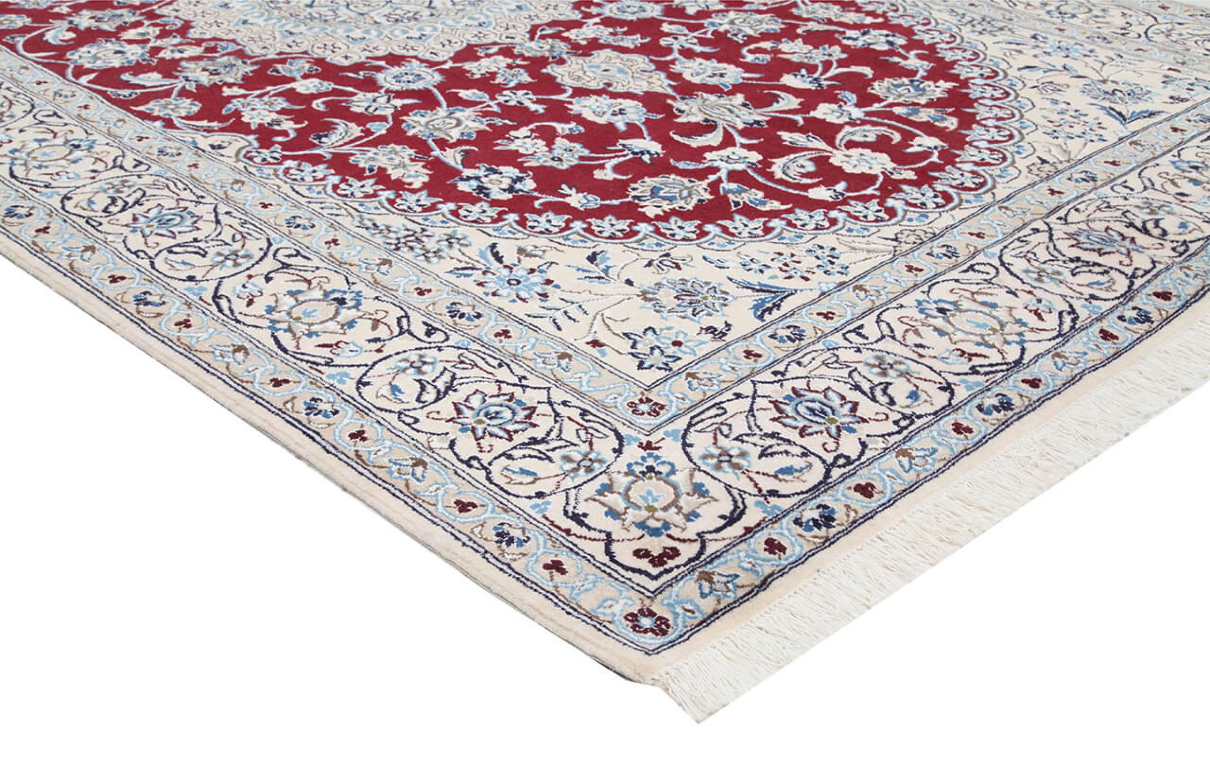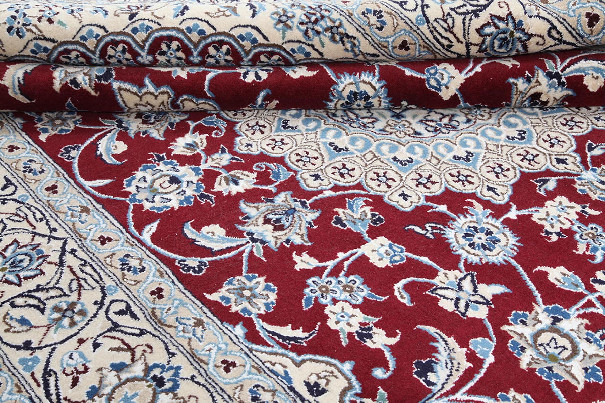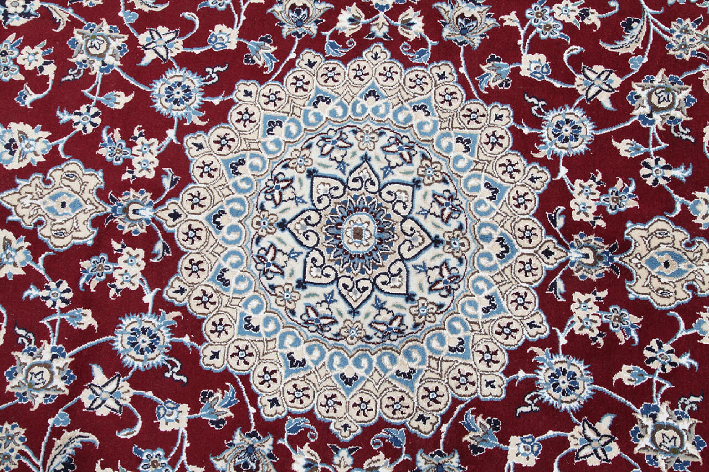 Las alfombras de la ciudad de Nain, en la frontera de uno de los mayores desiertos de Irán, están entre las alfombras persas más famosas del mundo. Su diseño típico es inconfundible con adornos florales, un medallón central y tonos beige y rojo o azul. Gracias a sus designaciones 4La, 6La, 9La y 12La, las sutilezas de una alfombra de Nain se pueden ver a simple vista. Cuanto más bajo sea el número "La", más alta es la densidad del nudo y por lo tanto más fina es la alfombra.