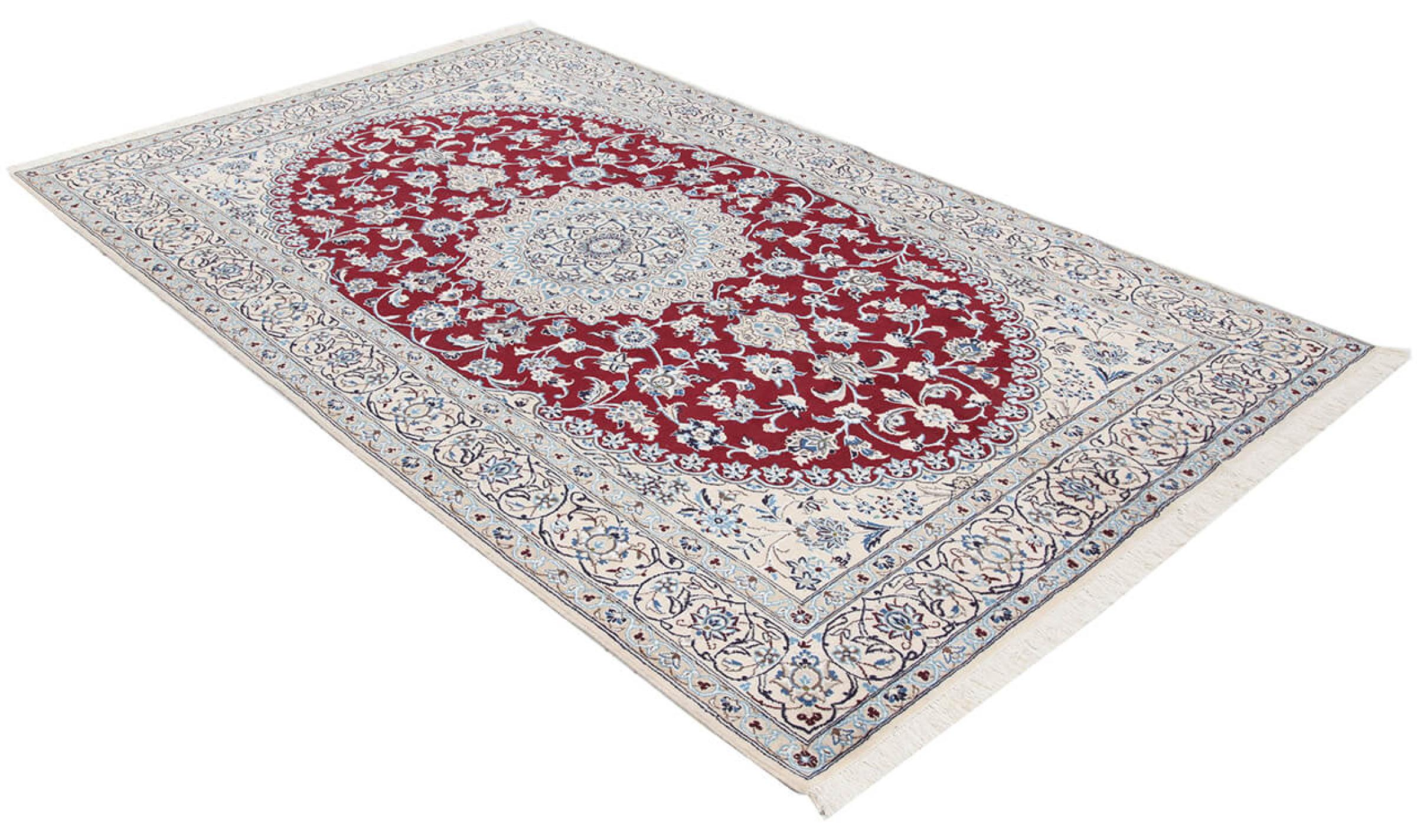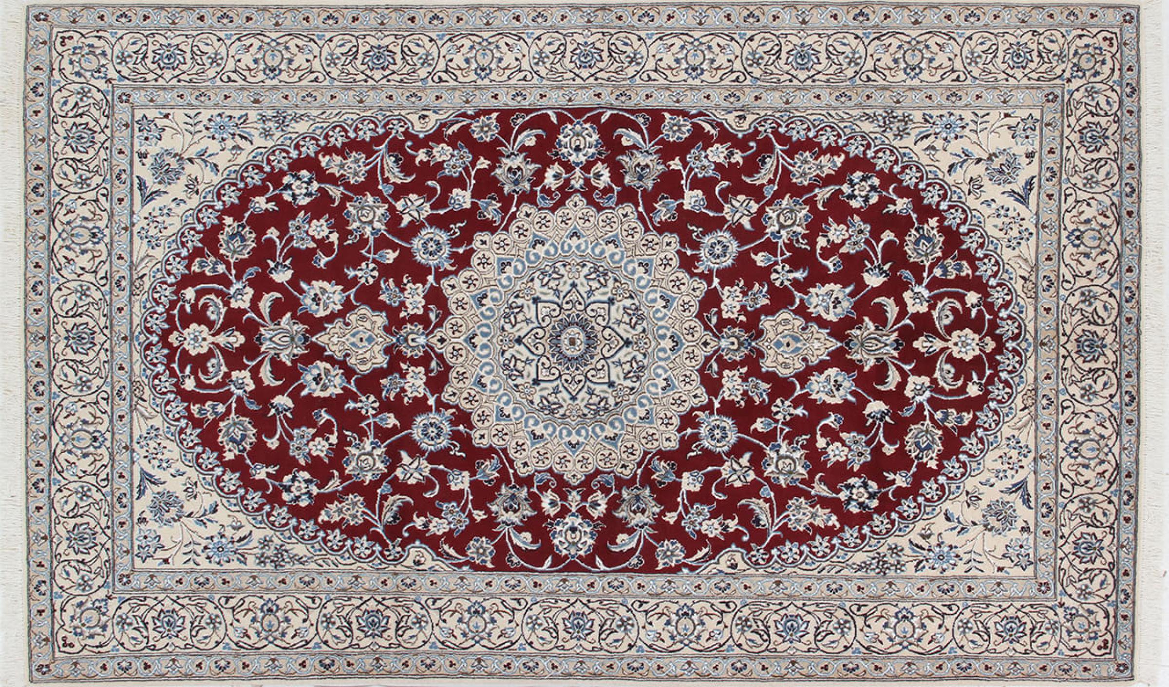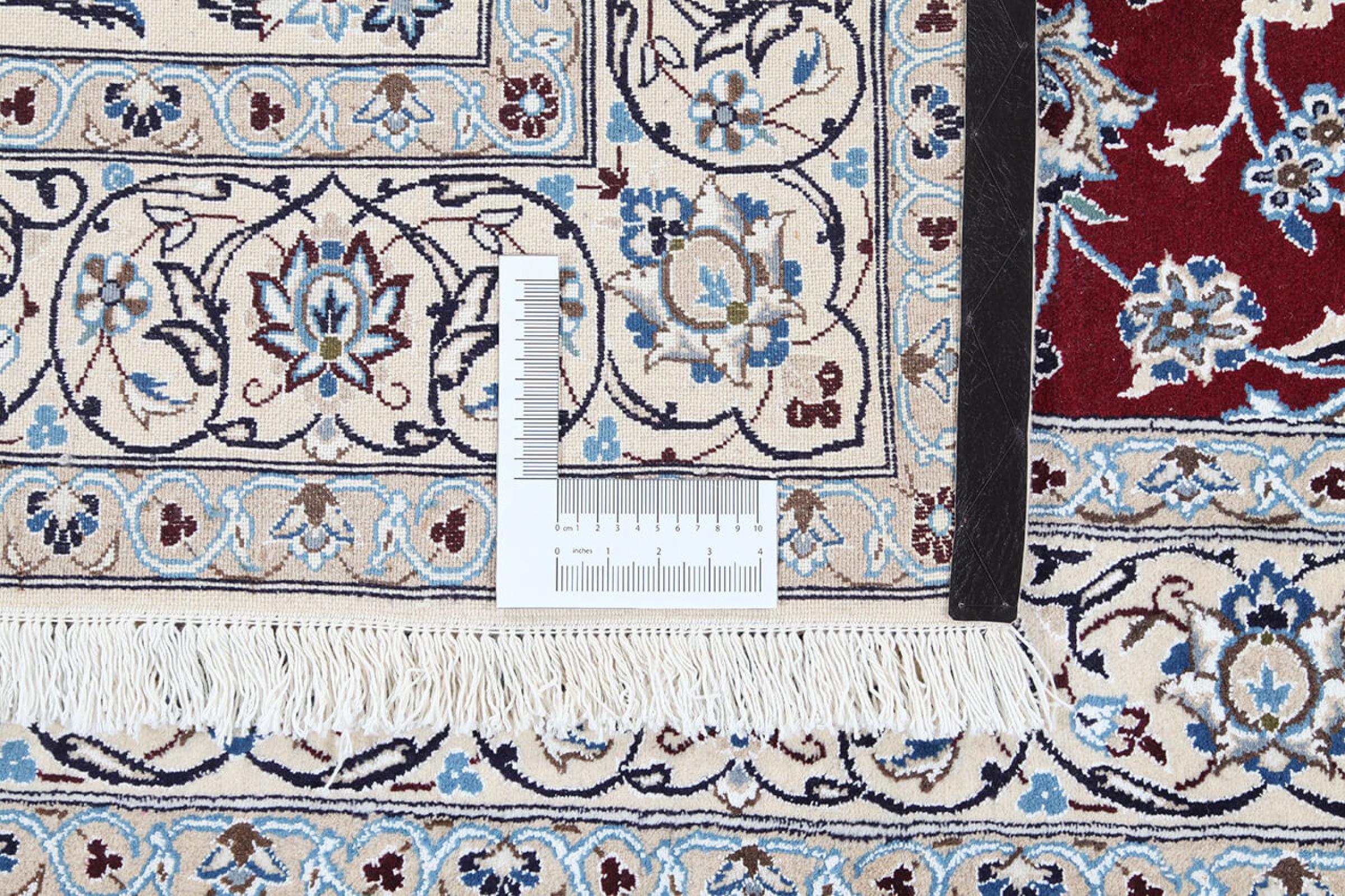 Las alfombras de la ciudad de Nain, en la frontera de uno de los mayores desiertos de Irán, están entre las alfombras persas más famosas del mundo. Su diseño típico es inconfundible con adornos florales, un medallón central y tonos beige y rojo o azul. Gracias a sus designaciones 4La, 6La, 9La y 12La, las sutilezas de una alfombra de Nain se pueden ver a simple vista. Cuanto más bajo sea el número "La", más alta es la densidad del nudo y por lo tanto más fina es la alfombra.