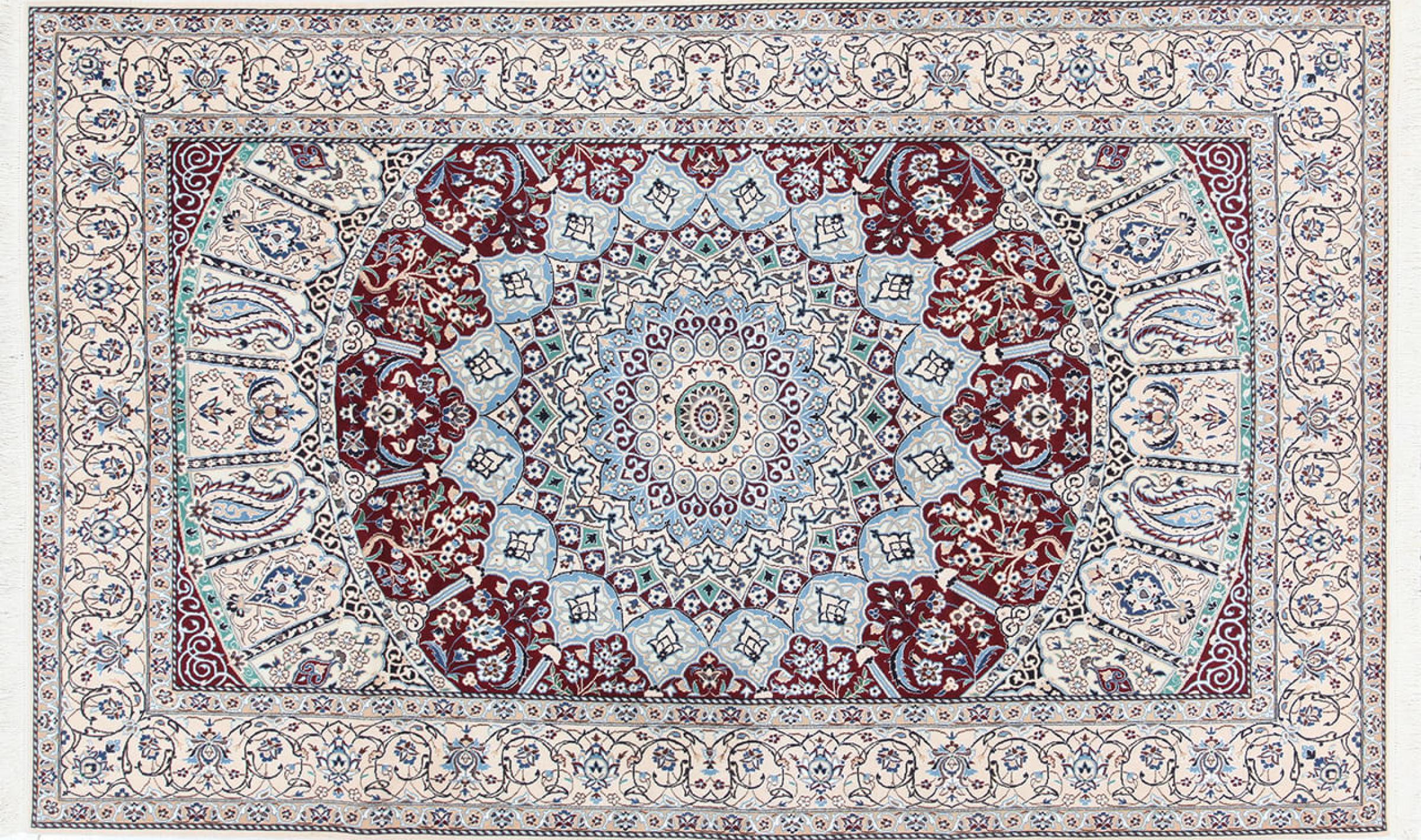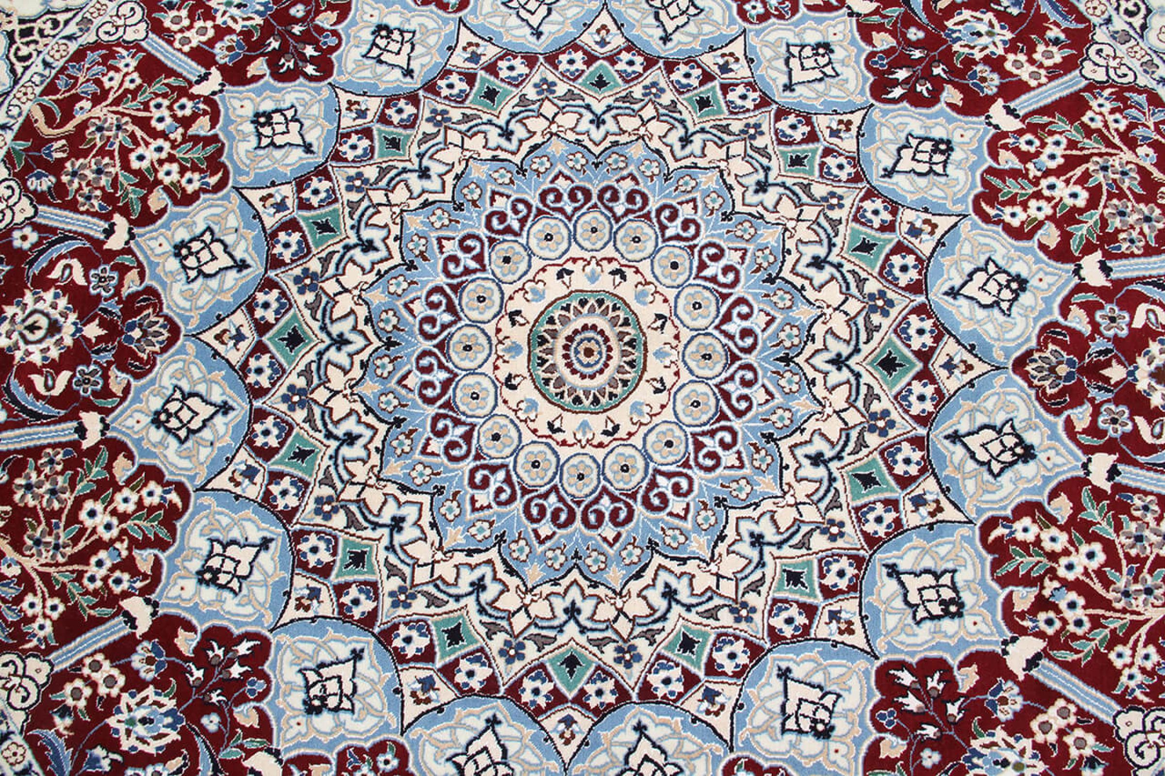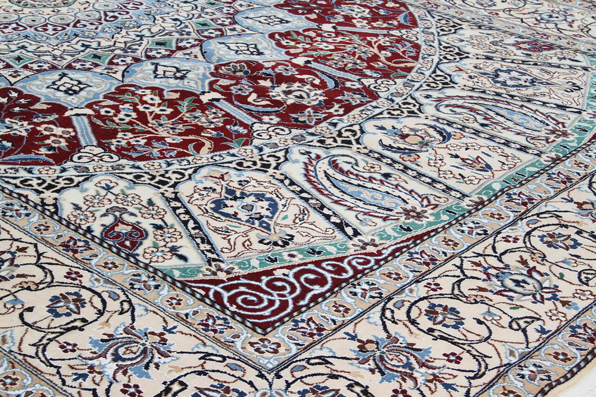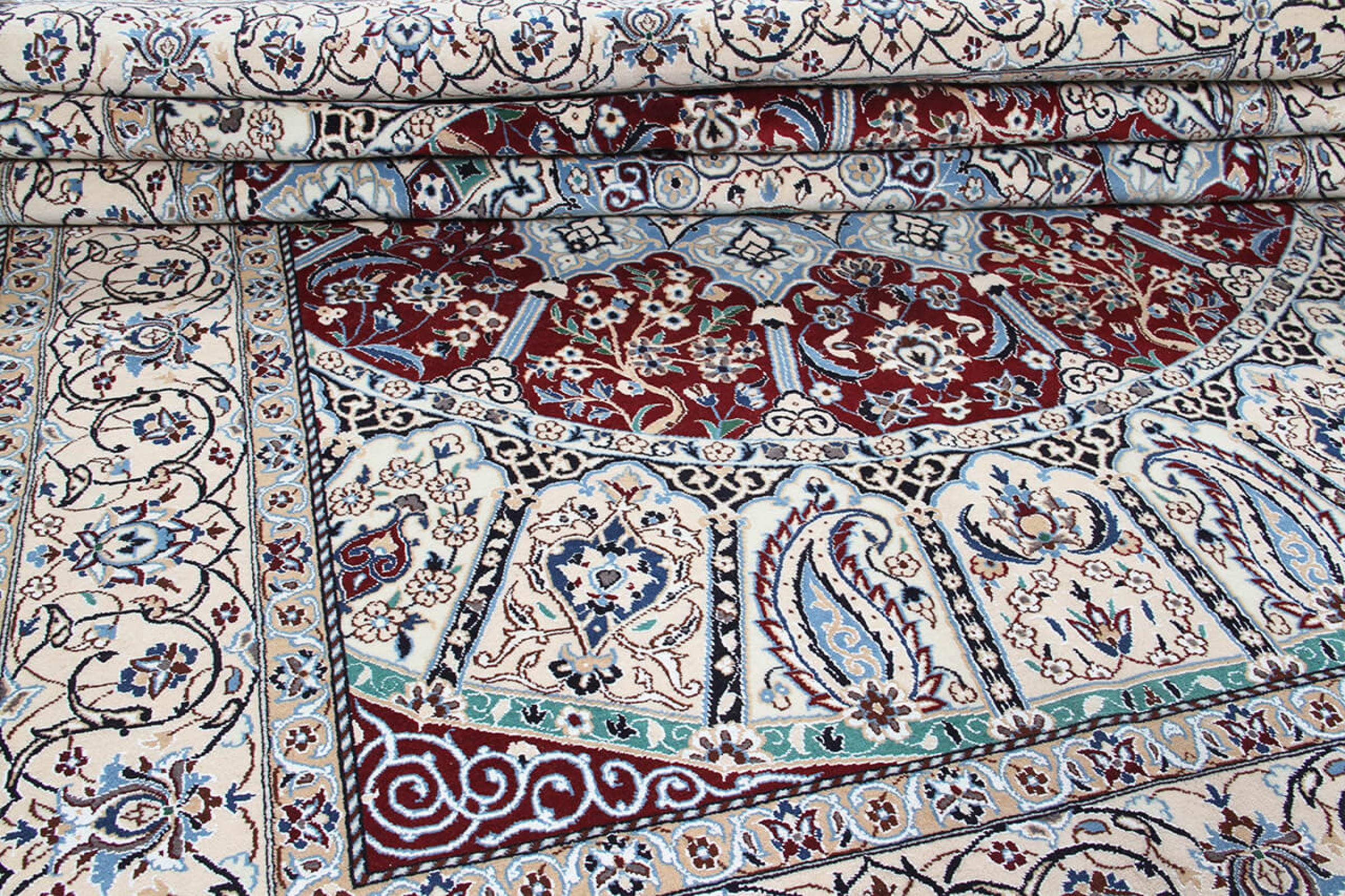 Las alfombras de la ciudad de Nain, en la frontera de uno de los mayores desiertos de Irán, están entre las alfombras persas más famosas del mundo. Su diseño típico es inconfundible con adornos florales, un medallón central y tonos beige y rojo o azul. Gracias a sus designaciones 4La, 6La, 9La y 12La, las sutilezas de una alfombra de Nain se pueden ver a simple vista. Cuanto más bajo sea el número "La", más alta es la densidad del nudo y por lo tanto más fina es la alfombra.