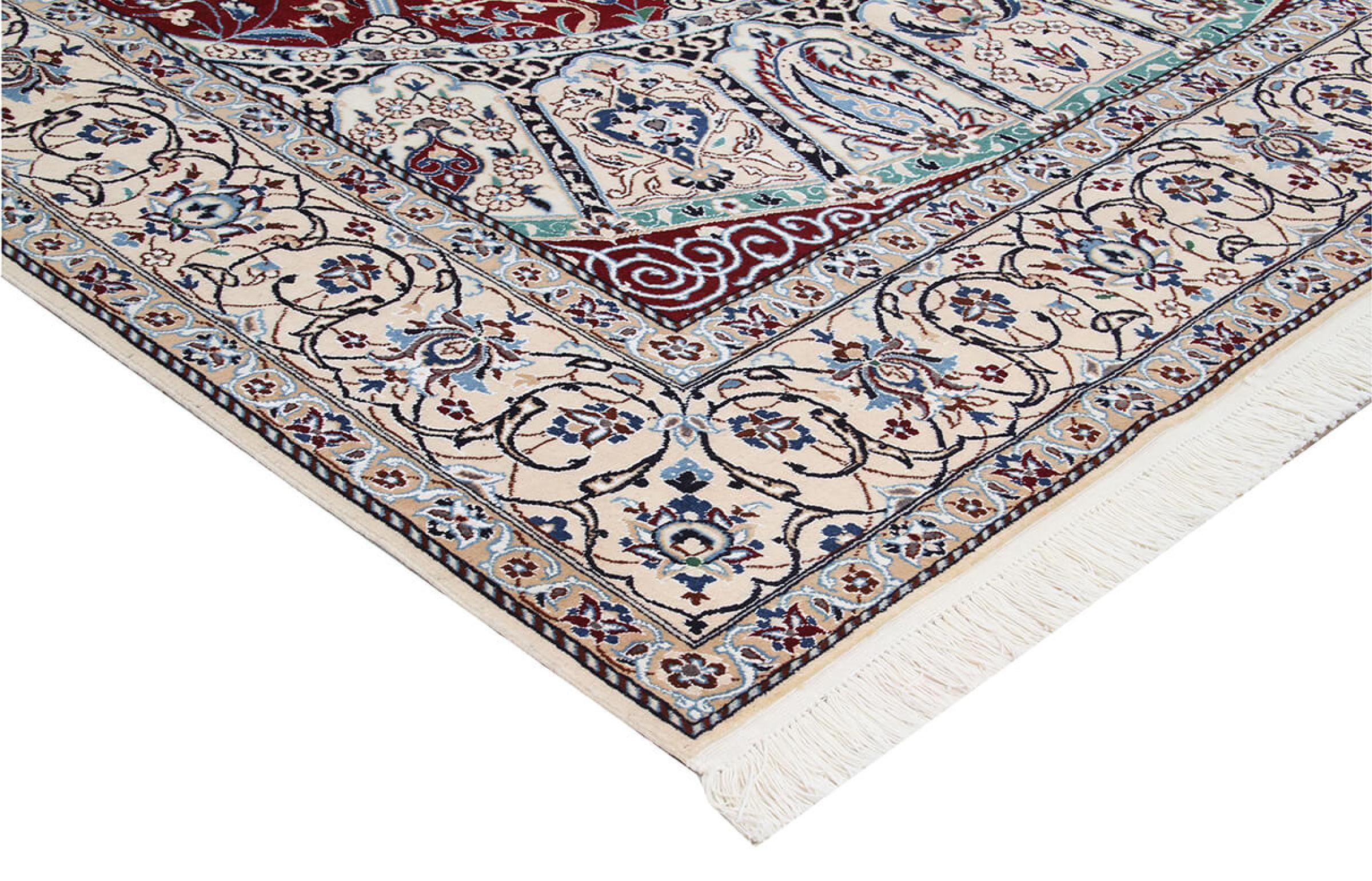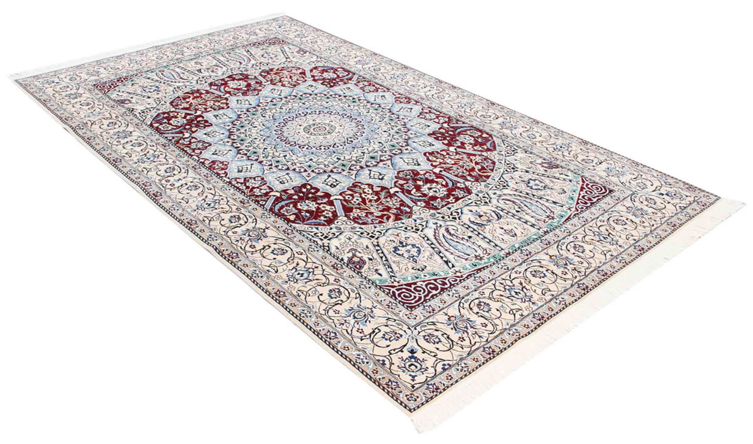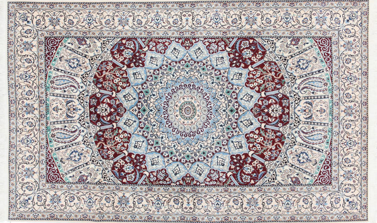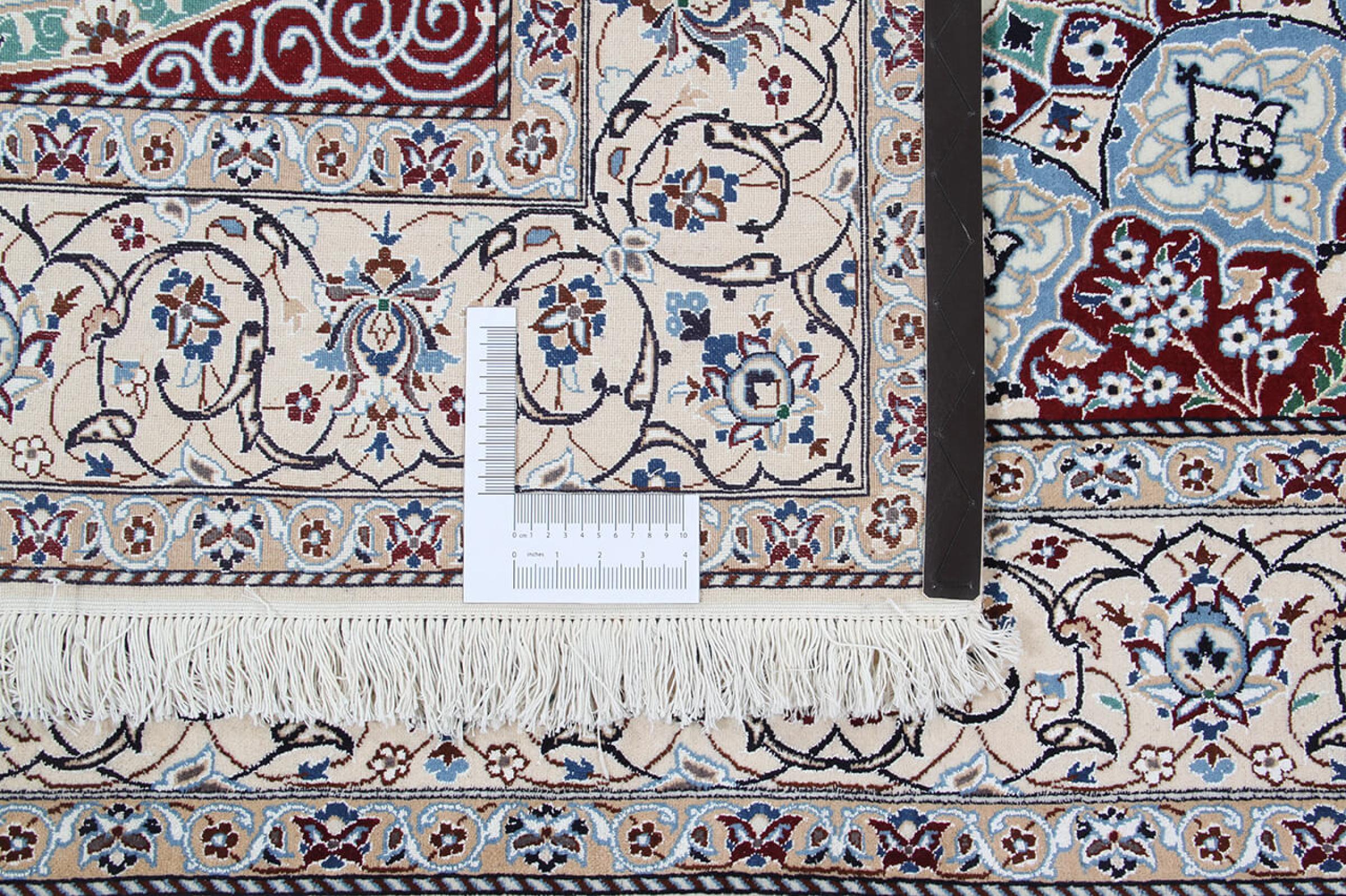 Las alfombras de la ciudad de Nain, en la frontera de uno de los mayores desiertos de Irán, están entre las alfombras persas más famosas del mundo. Su diseño típico es inconfundible con adornos florales, un medallón central y tonos beige y rojo o azul. Gracias a sus designaciones 4La, 6La, 9La y 12La, las sutilezas de una alfombra de Nain se pueden ver a simple vista. Cuanto más bajo sea el número "La", más alta es la densidad del nudo y por lo tanto más fina es la alfombra.