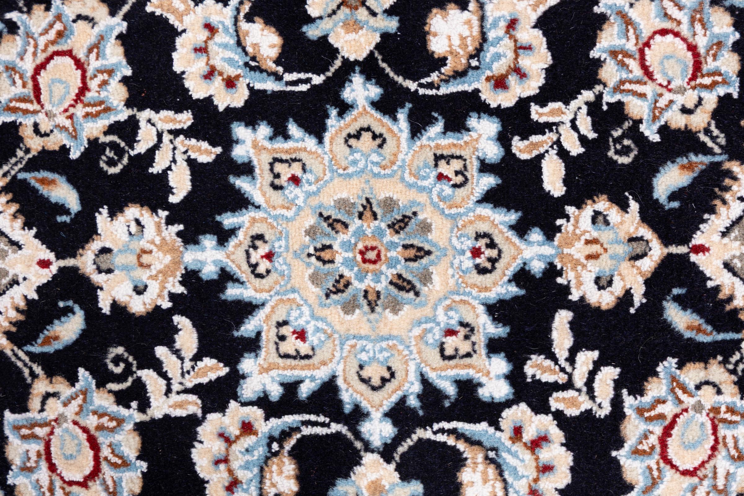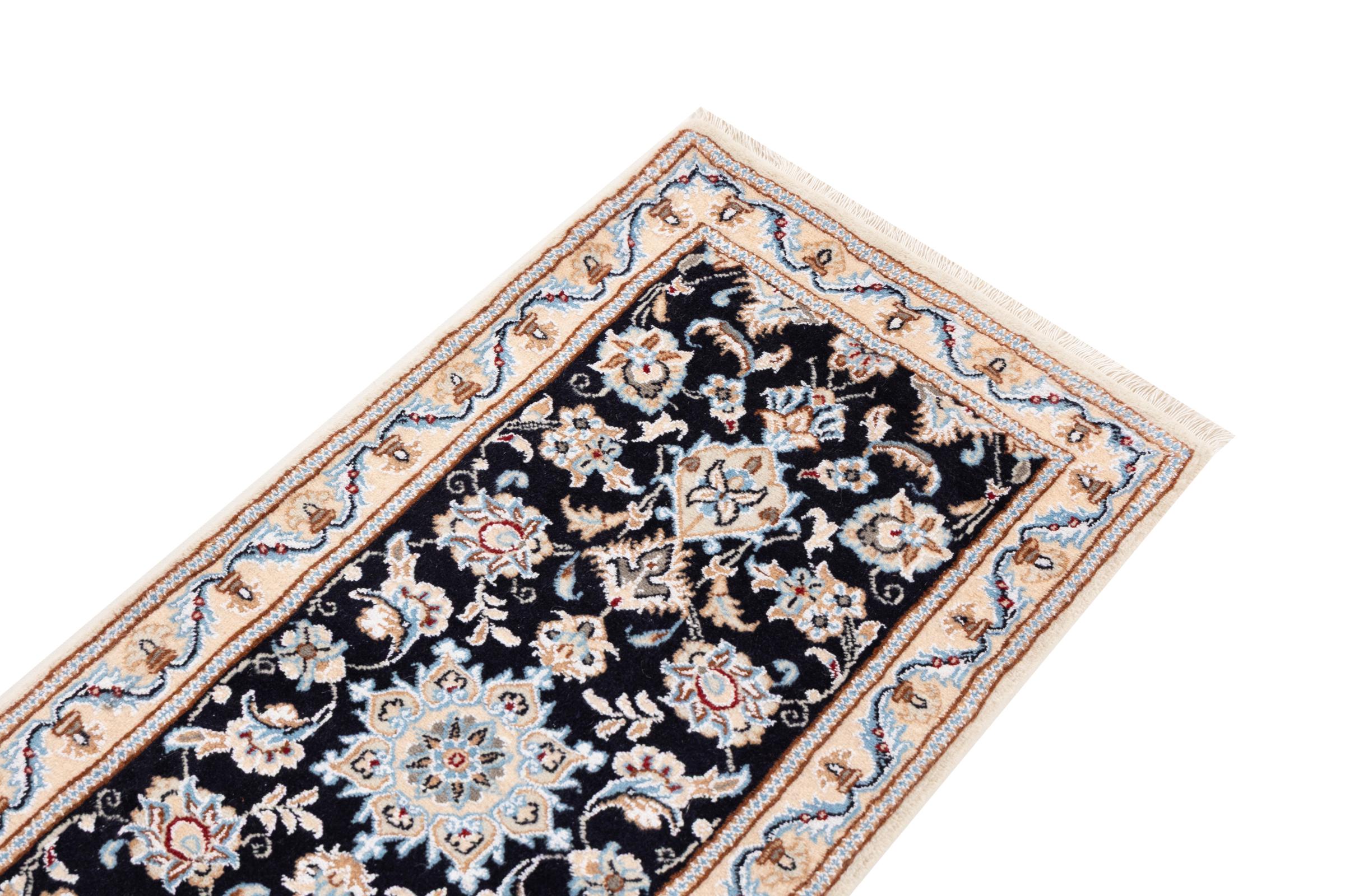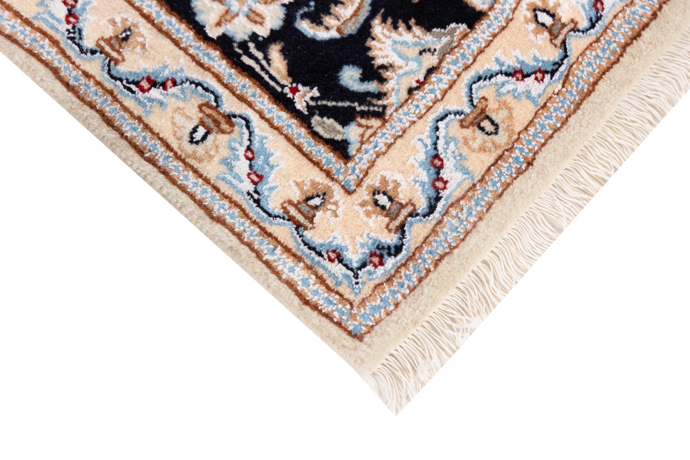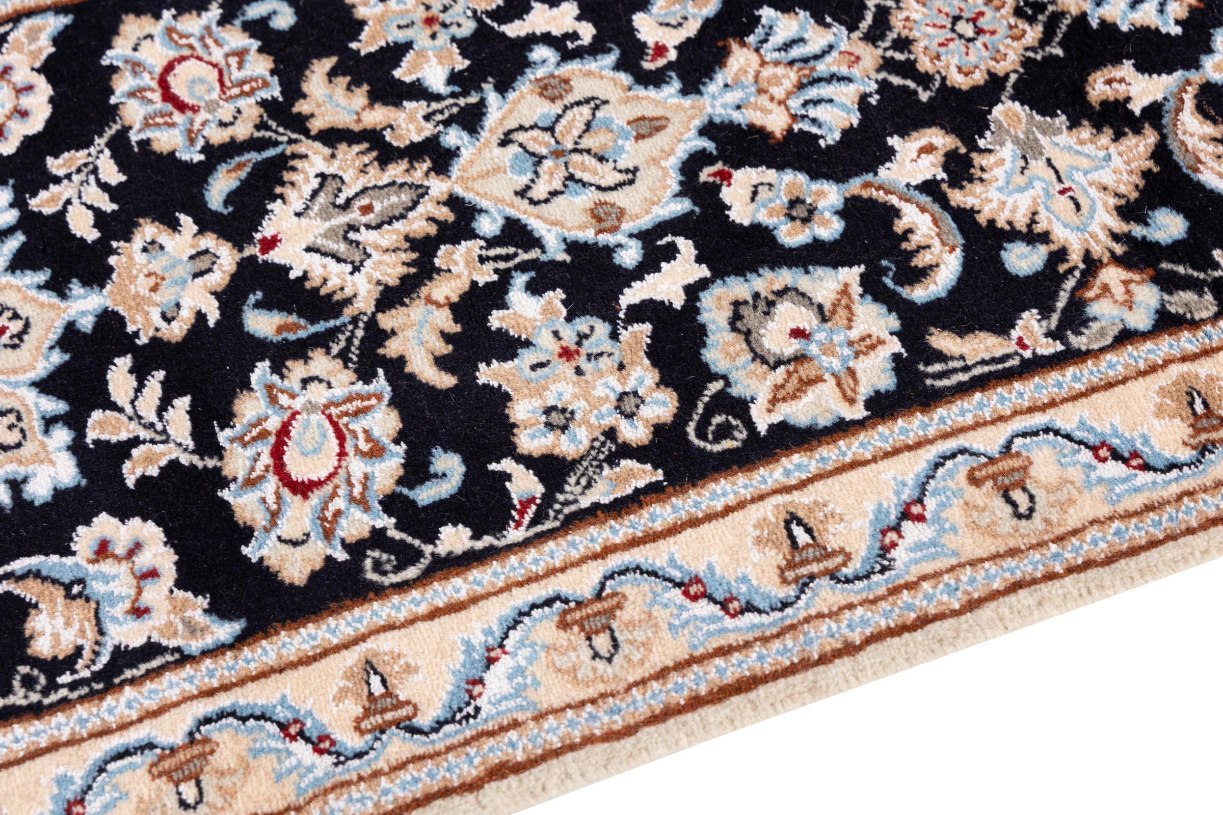 Esta alfombra Nain está clasificada como 9La. Su excelente calidad y su bello diseño oriental con motivos curvilíneos harán las delicias de cualquier comprador. Esta alfombra persa fue anudada a mano en la ciudad de Nain, situada en el extremo occidental del desierto de Dasht-e-Kavir, con lana de alta calidad y seda natural. Las alfombras Nain 9La son claramente más finas que las 12La y ya muestran bellos detalles.