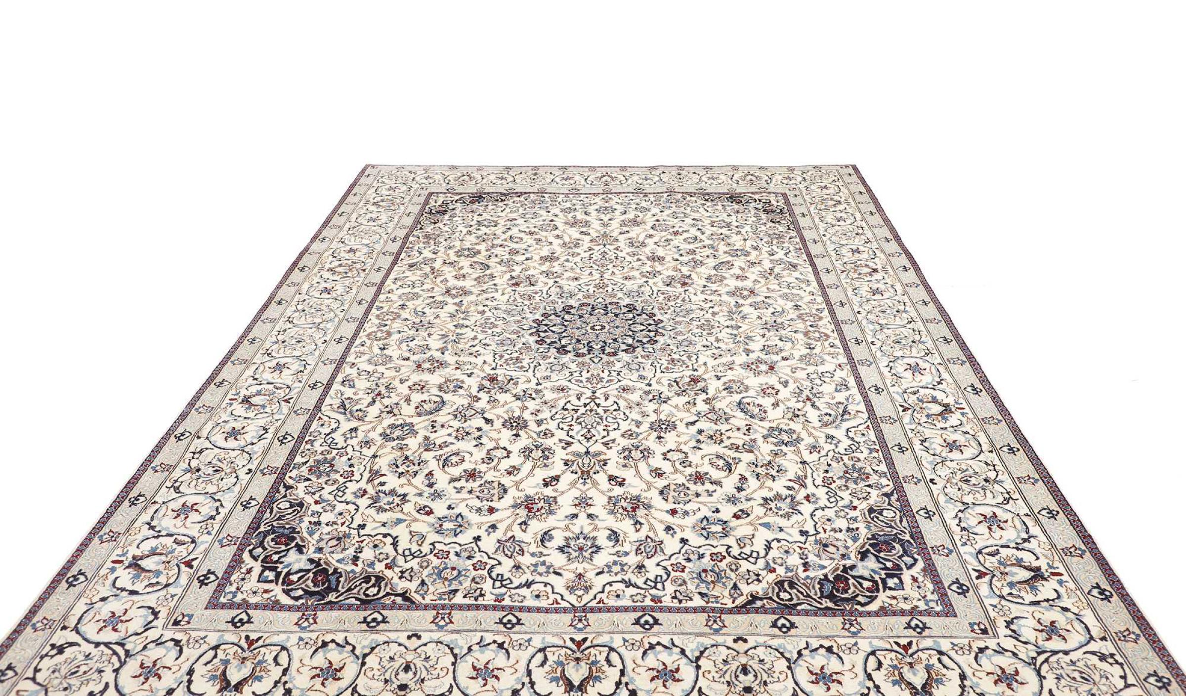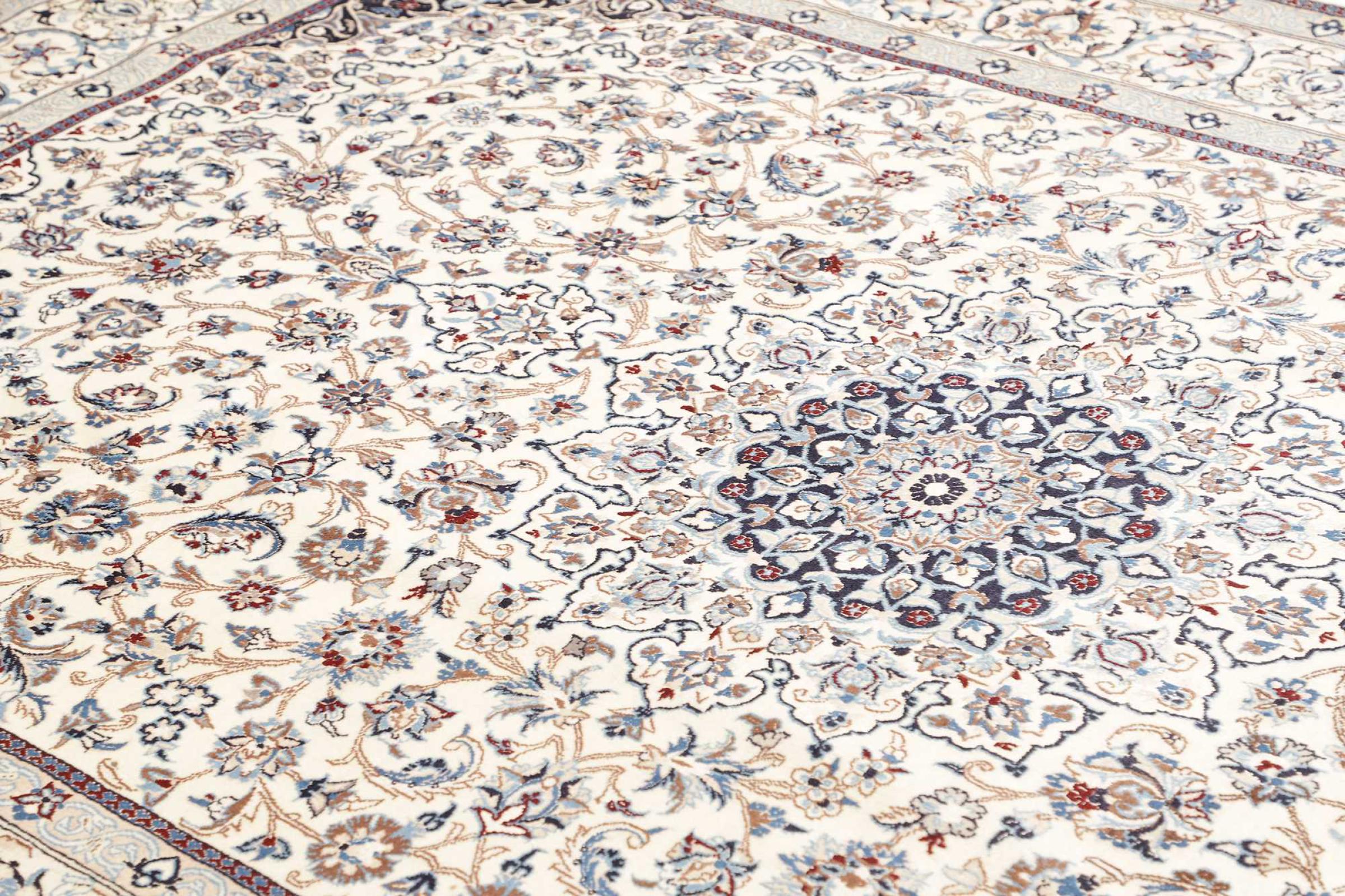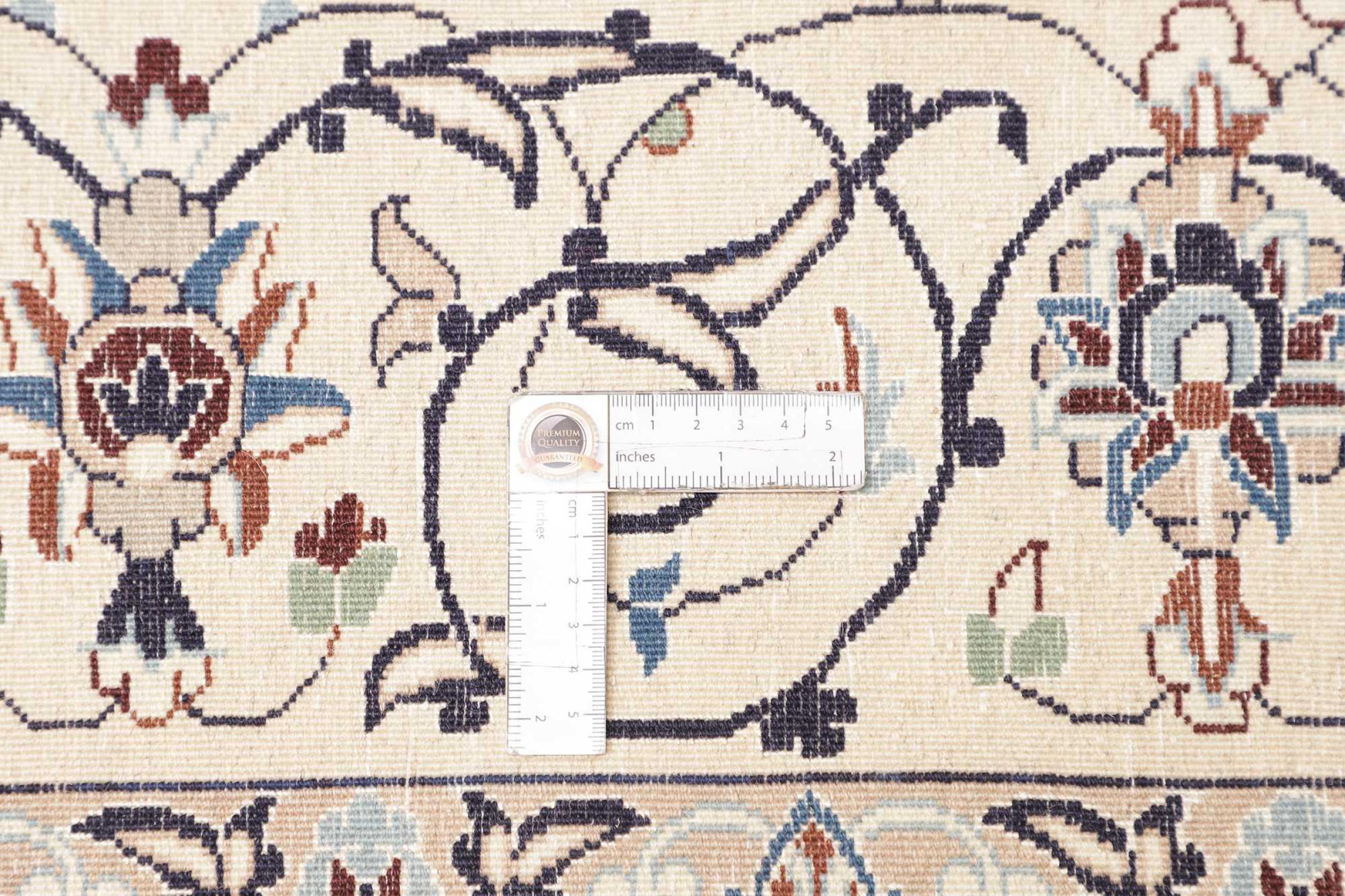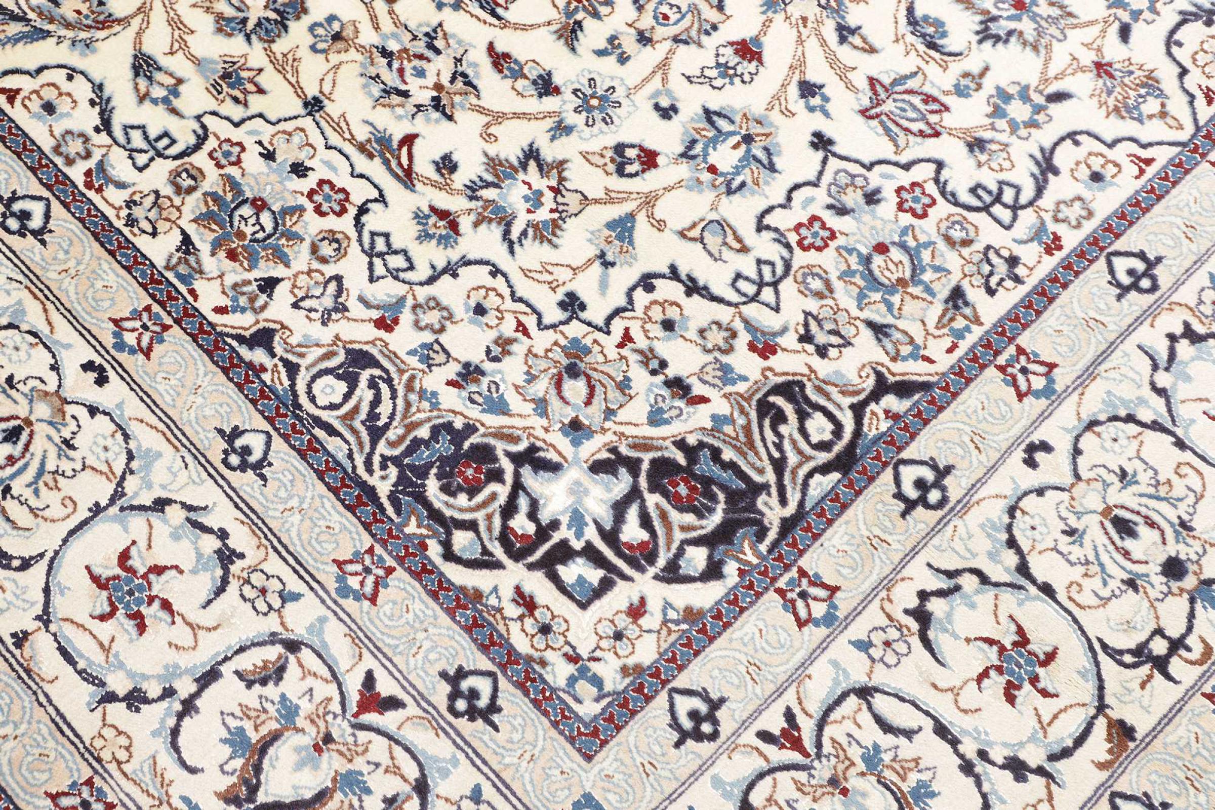 Esta alfombra Nain está clasificada como 9La. Su excelente calidad y su bello diseño oriental con motivos curvilíneos harán las delicias de cualquier comprador. Esta alfombra persa fue anudada a mano en la ciudad de Nain, situada en el extremo occidental del desierto de Dasht-e-Kavir, con lana de alta calidad y seda natural. Las alfombras Nain 9La son claramente más finas que las 12La y ya muestran bellos detalles.