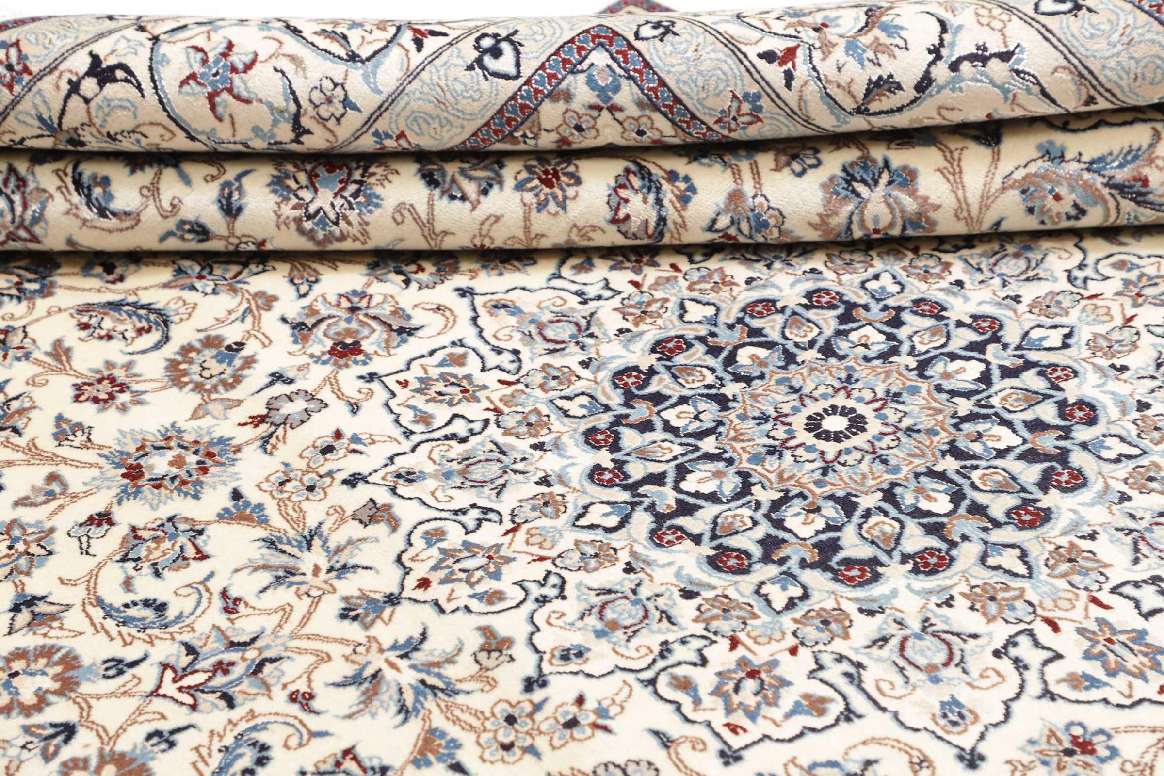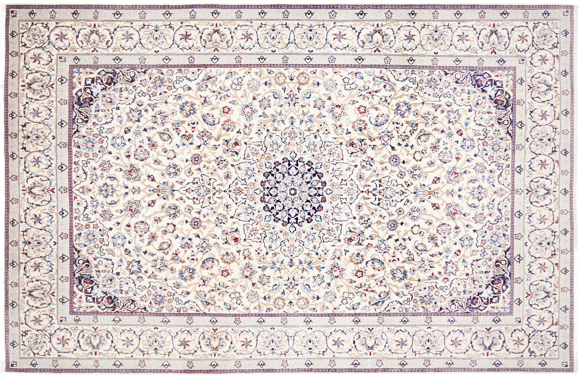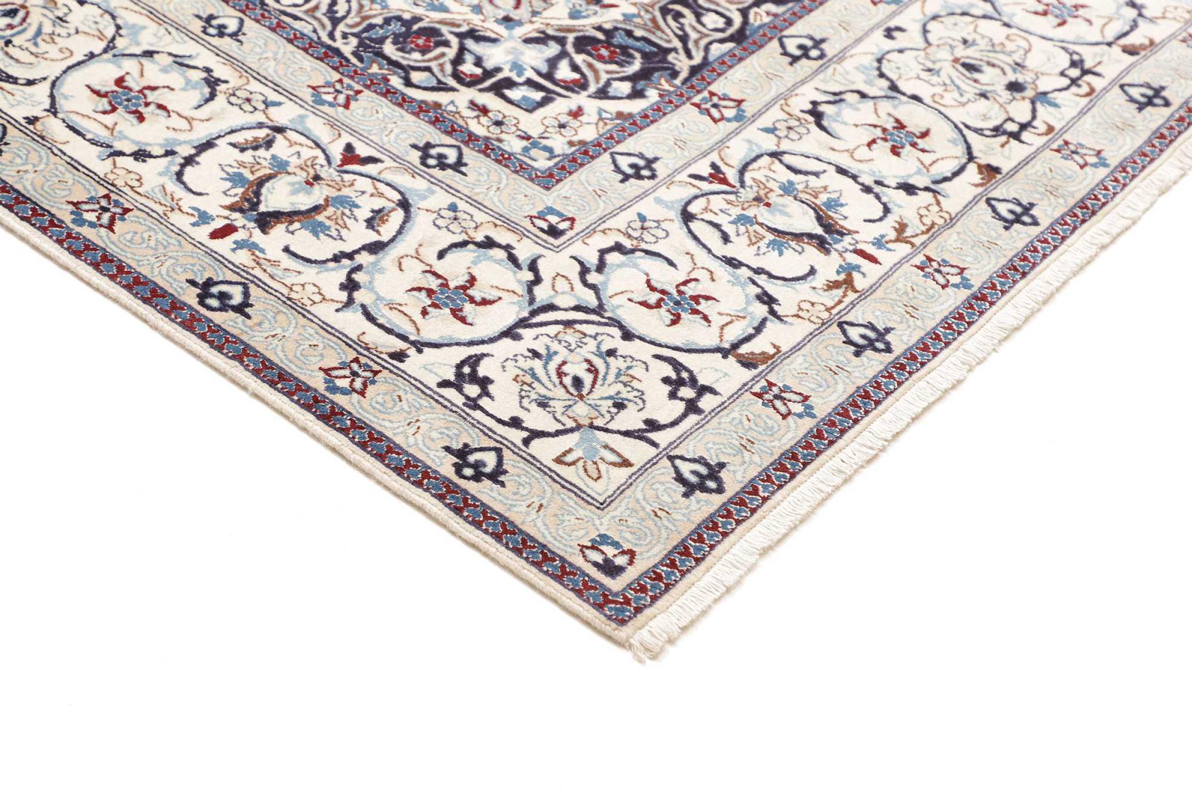 Esta alfombra Nain está clasificada como 9La. Su excelente calidad y su bello diseño oriental con motivos curvilíneos harán las delicias de cualquier comprador. Esta alfombra persa fue anudada a mano en la ciudad de Nain, situada en el extremo occidental del desierto de Dasht-e-Kavir, con lana de alta calidad y seda natural. Las alfombras Nain 9La son claramente más finas que las 12La y ya muestran bellos detalles.