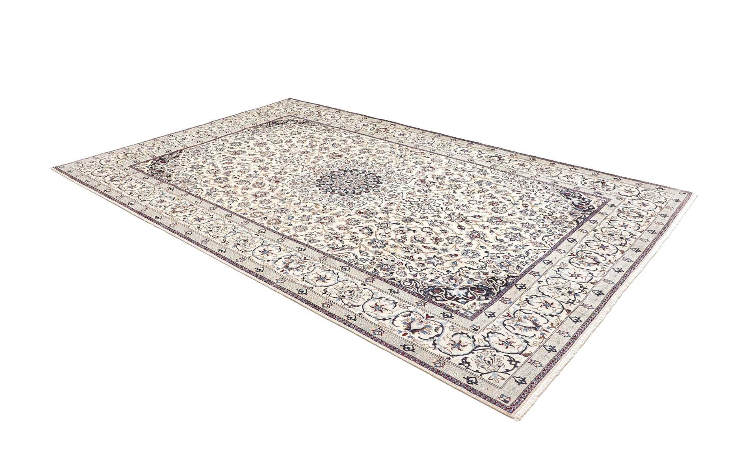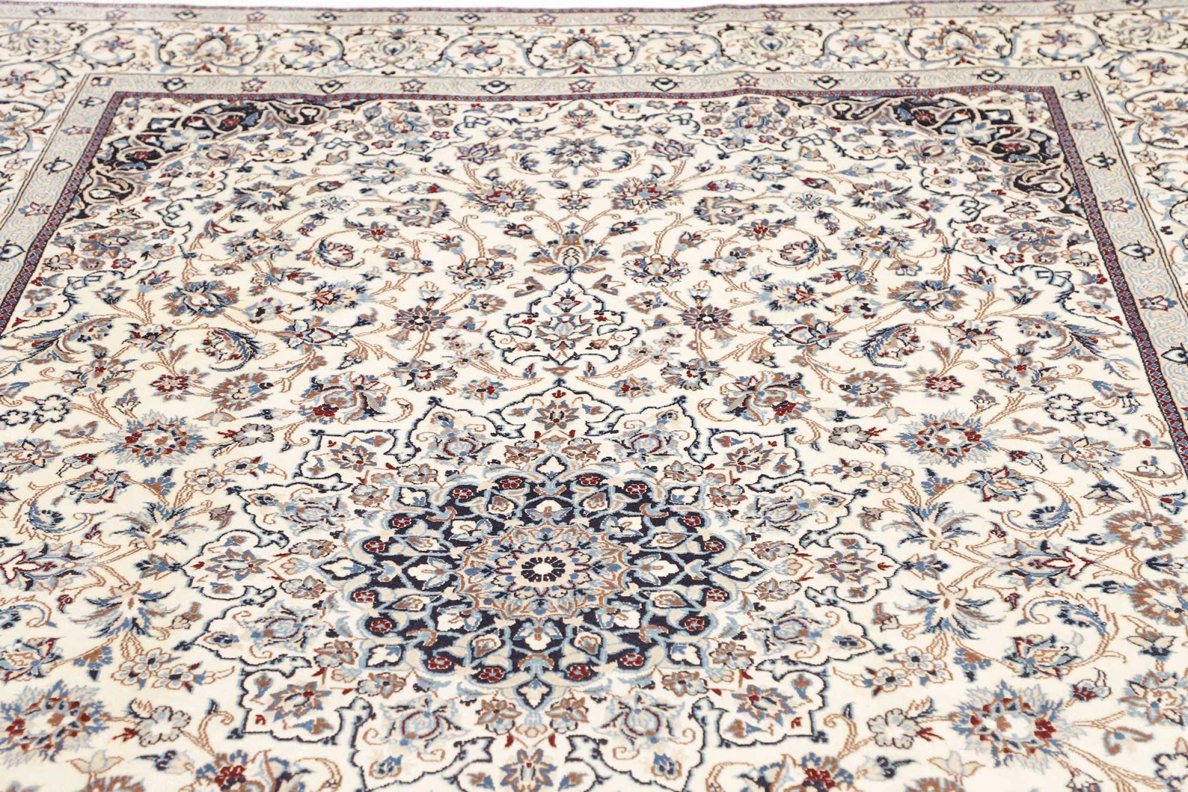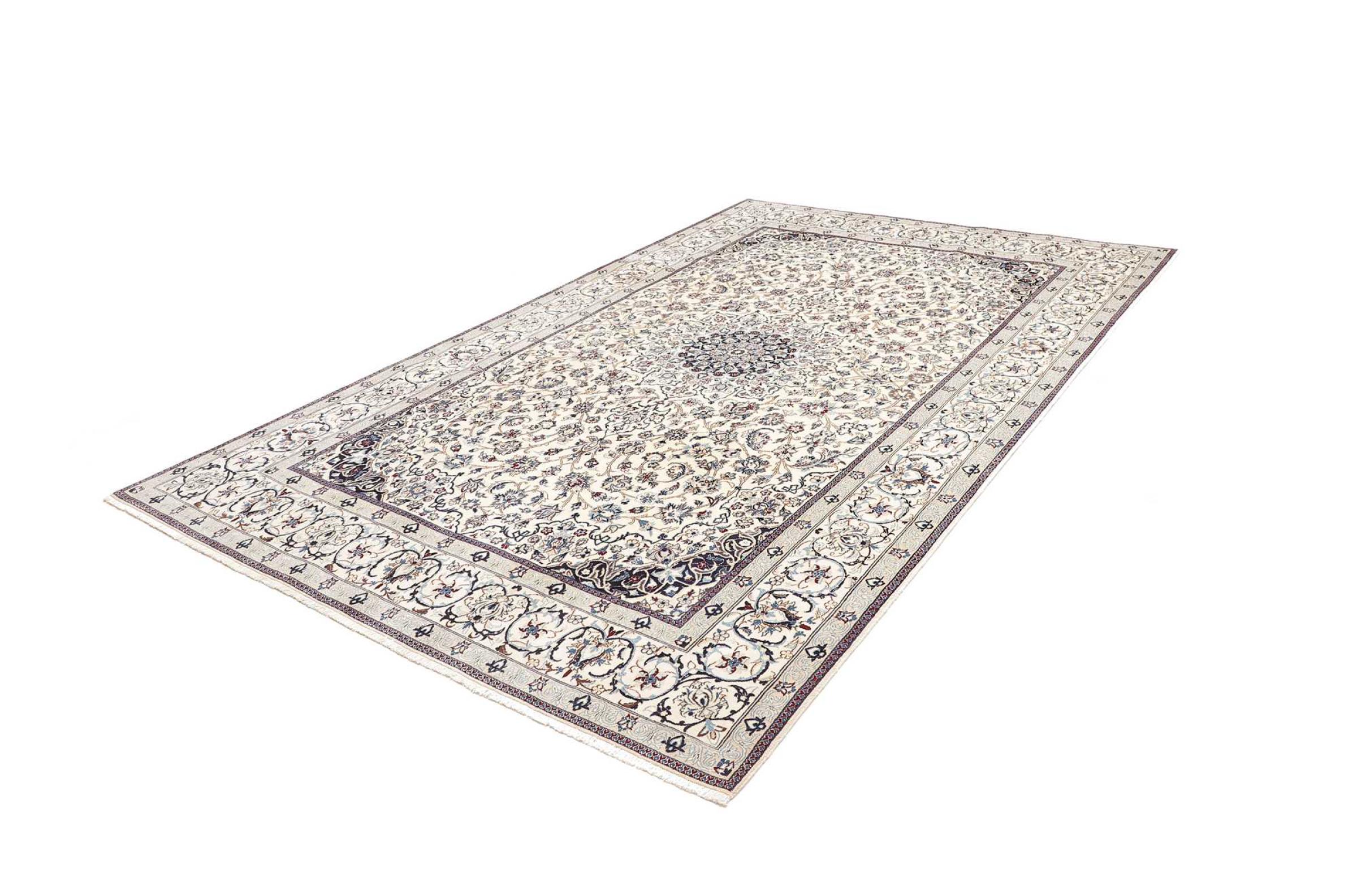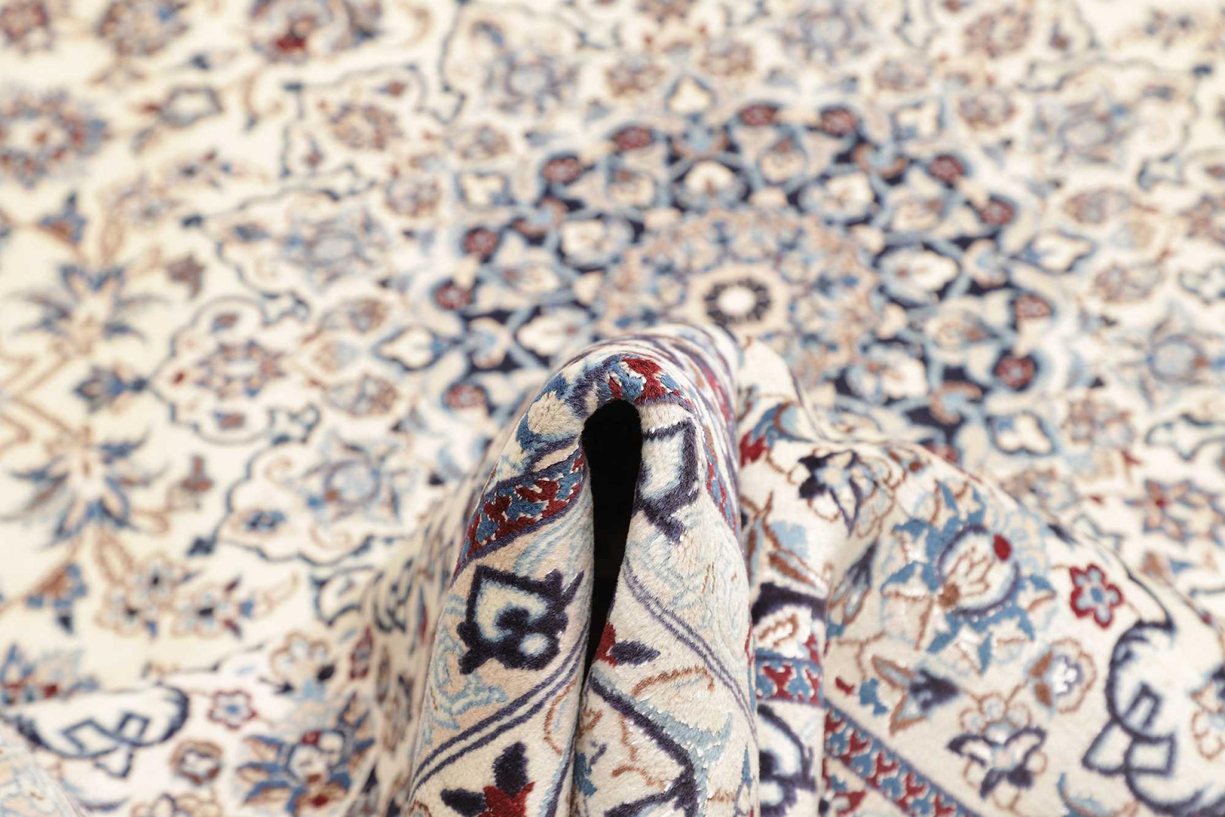 Esta alfombra Nain está clasificada como 9La. Su excelente calidad y su bello diseño oriental con motivos curvilíneos harán las delicias de cualquier comprador. Esta alfombra persa fue anudada a mano en la ciudad de Nain, situada en el extremo occidental del desierto de Dasht-e-Kavir, con lana de alta calidad y seda natural. Las alfombras Nain 9La son claramente más finas que las 12La y ya muestran bellos detalles.
