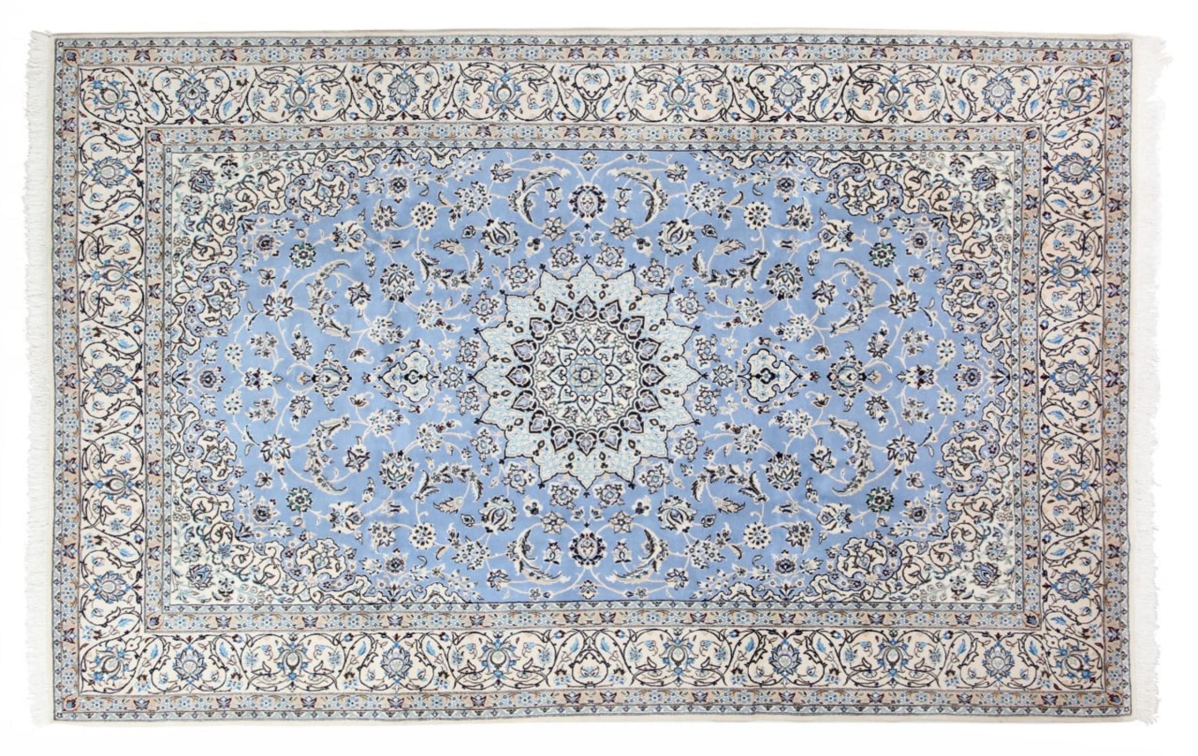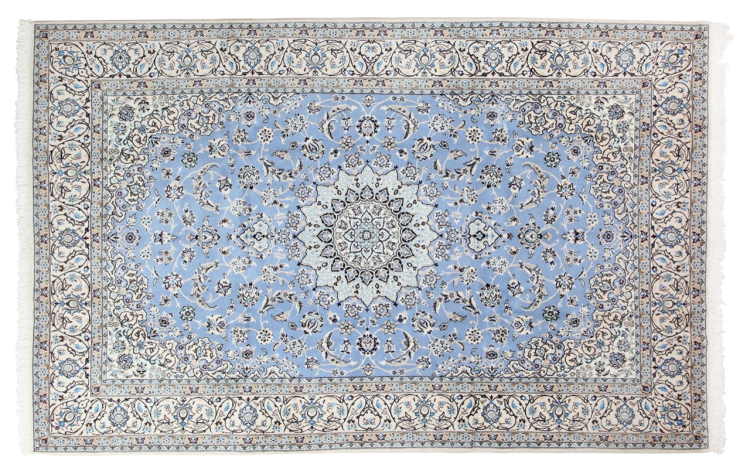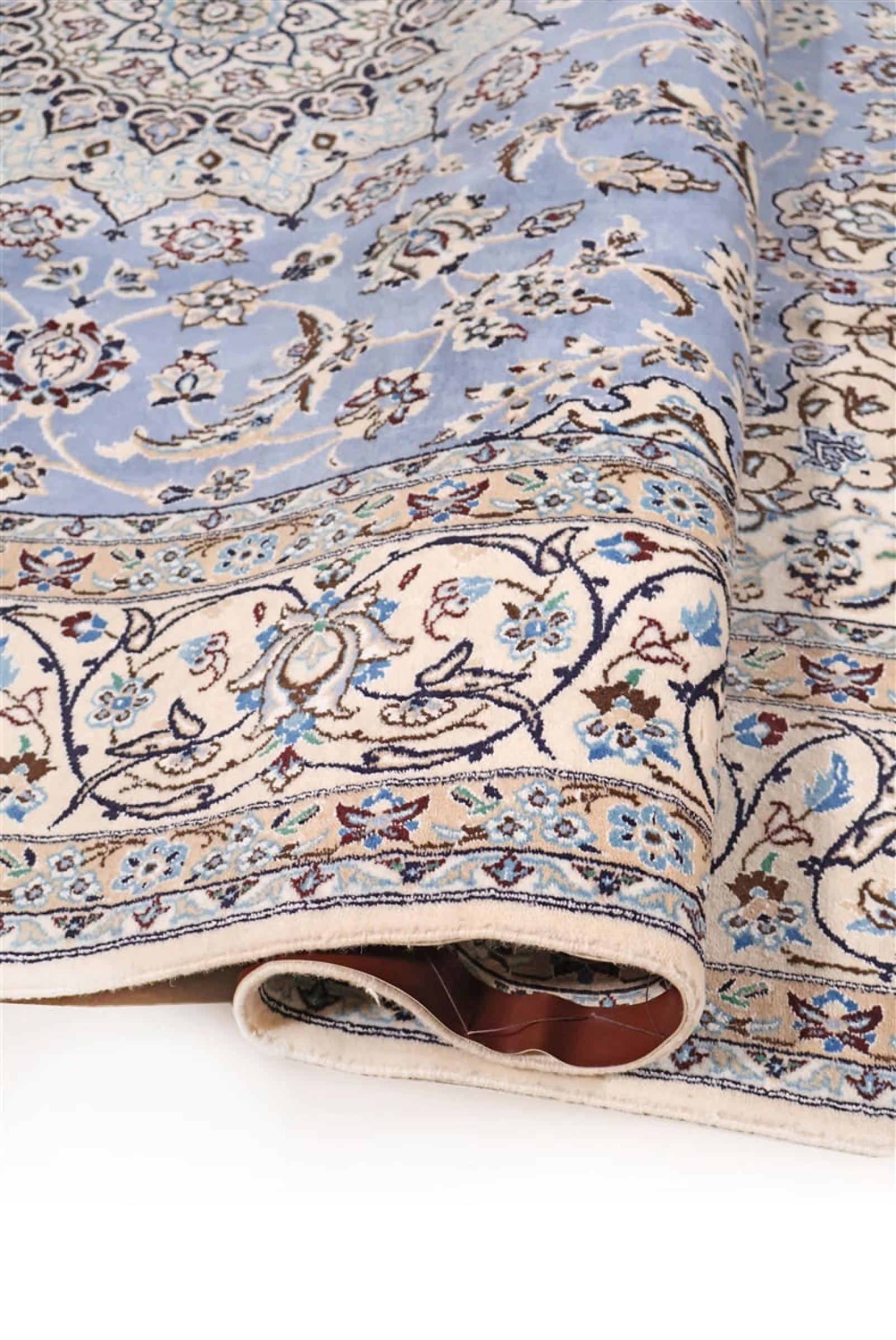 Las alfombras de la ciudad de Nain, en la frontera de uno de los mayores desiertos de Irán, están entre las alfombras persas más famosas del mundo. Su diseño típico es inconfundible con adornos florales, un medallón central y tonos beige y rojo o azul. Gracias a sus designaciones 4La, 6La, 9La y 12La, las sutilezas de una alfombra de Nain se pueden ver a simple vista. Cuanto más bajo sea el número "La", más alta es la densidad del nudo y por lo tanto más fina es la alfombra.