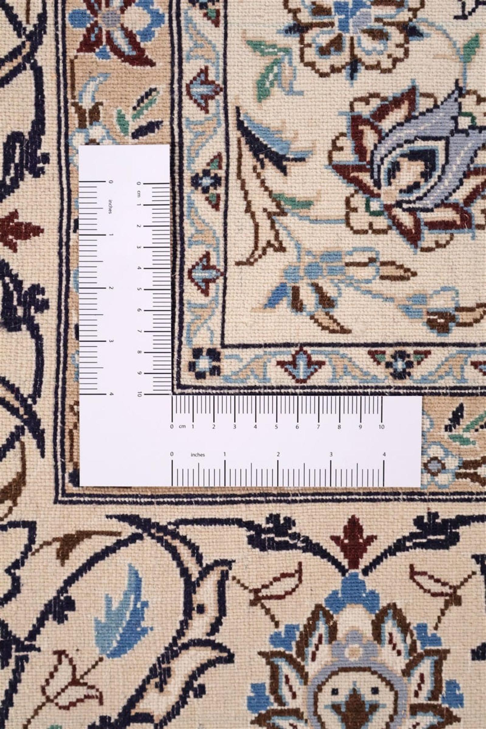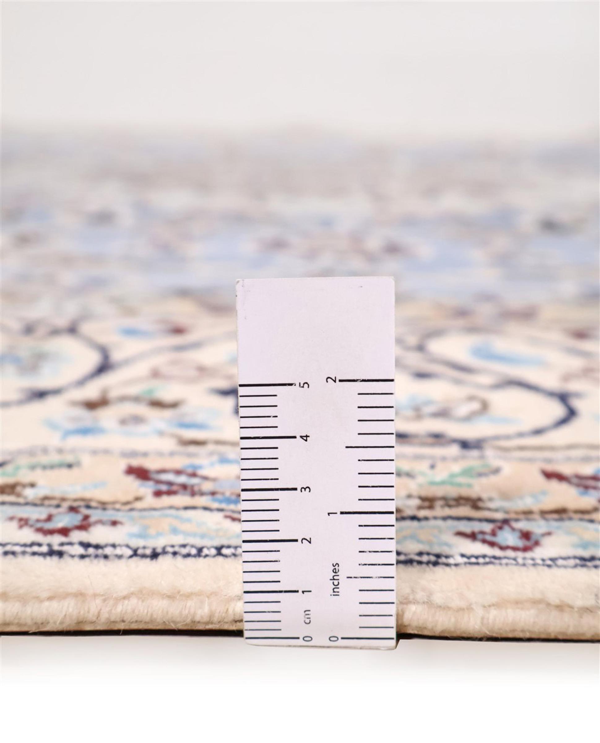Esta alfombra Nain está clasificada como 9La. Su excelente calidad y su bello diseño oriental con motivos curvilíneos harán las delicias de cualquier comprador. Esta alfombra persa fue anudada a mano en la ciudad de Nain, situada en el extremo occidental del desierto de Dasht-e-Kavir, con lana de alta calidad y seda natural. Las alfombras Nain 9La son claramente más finas que las 12La y ya muestran bellos detalles.