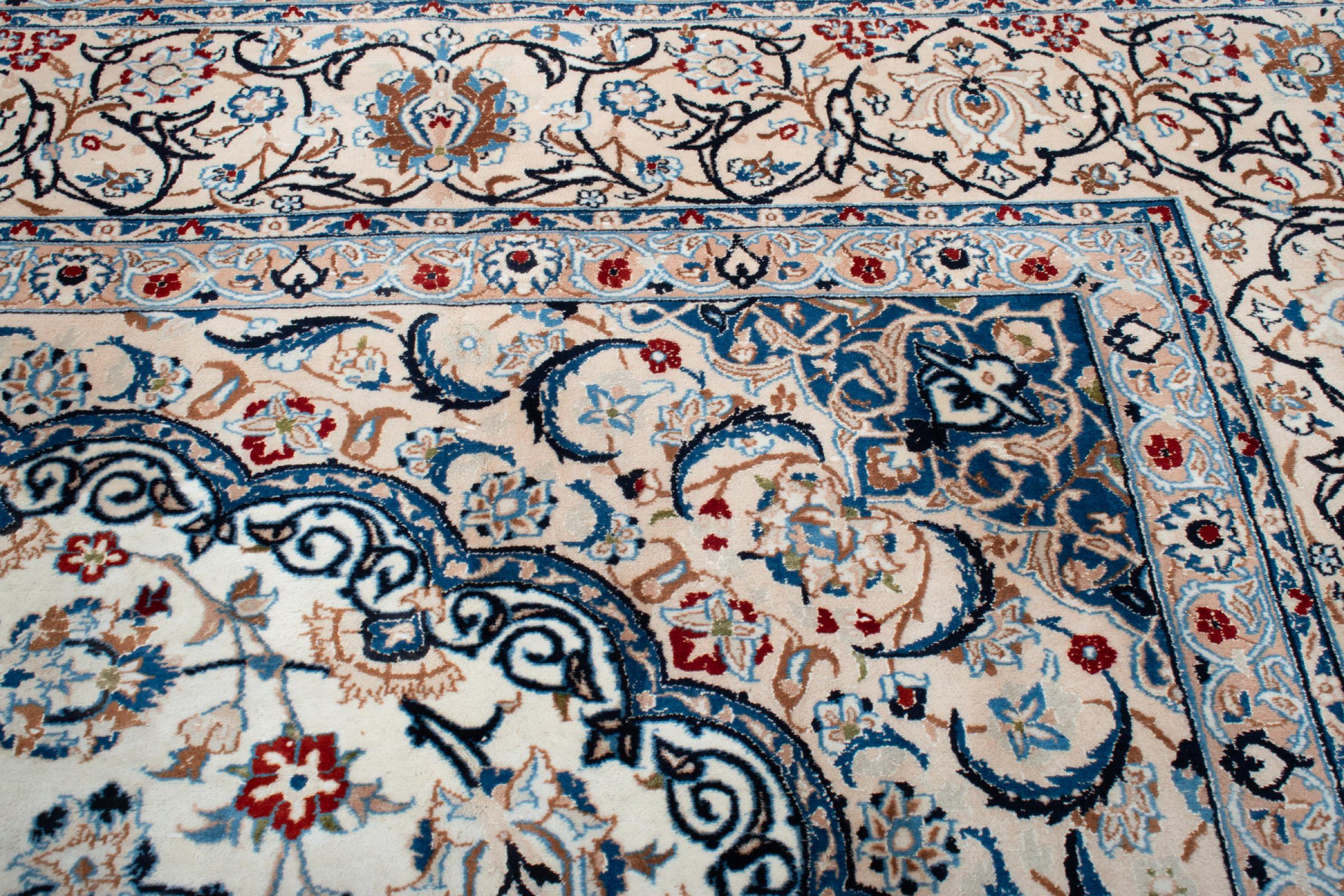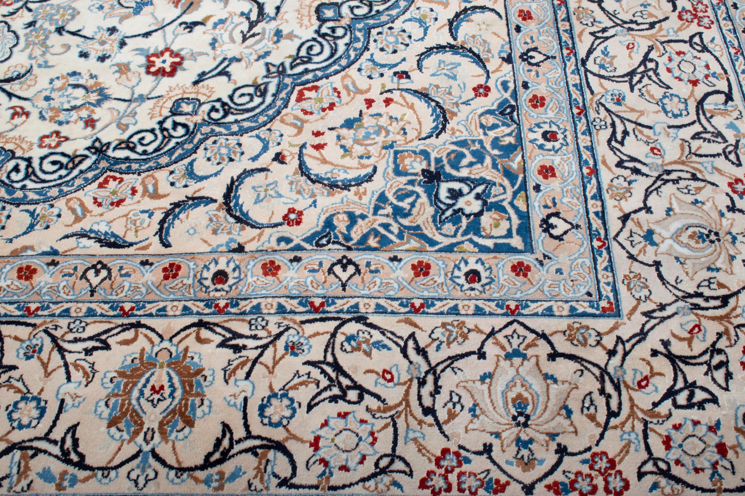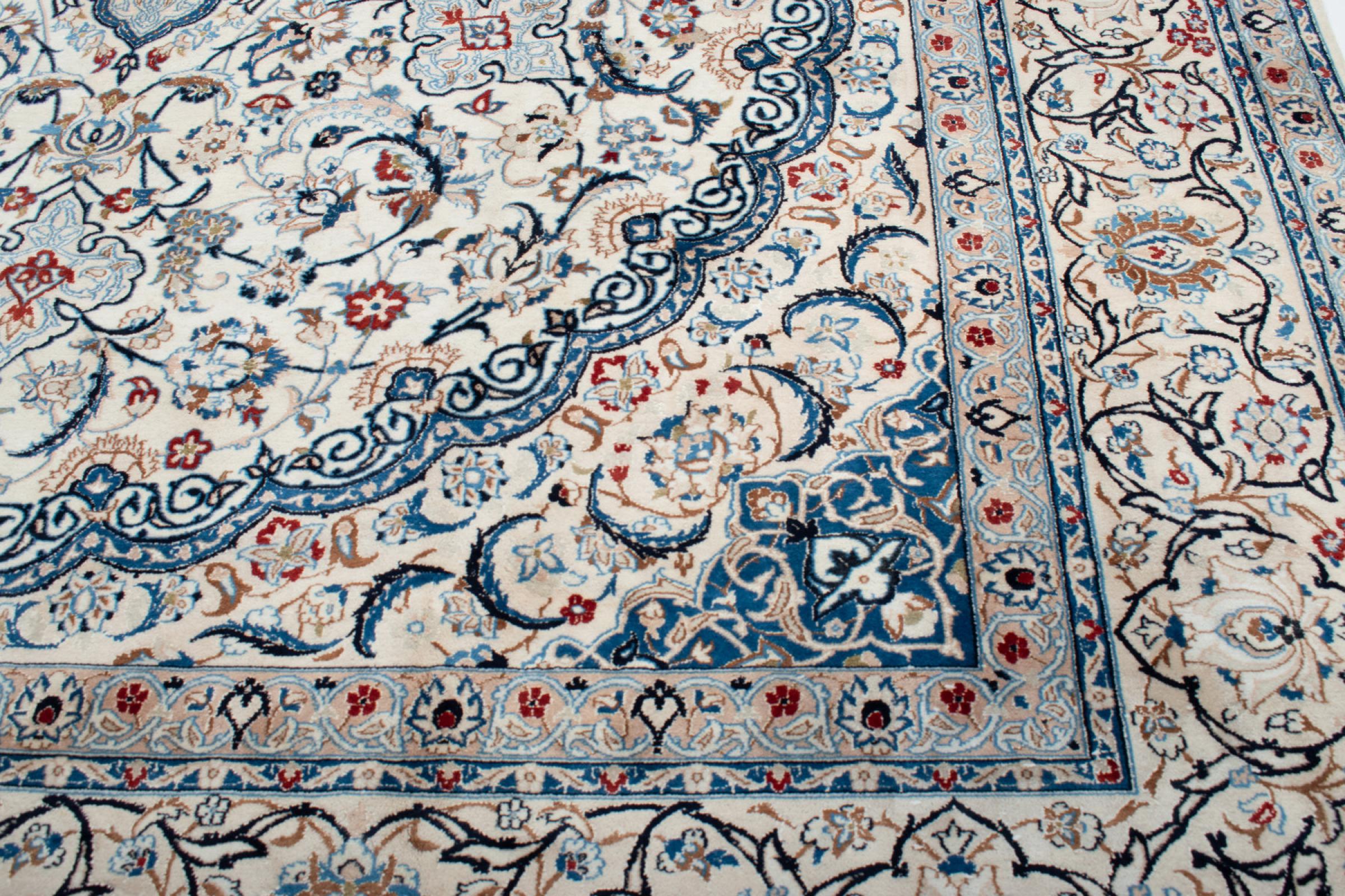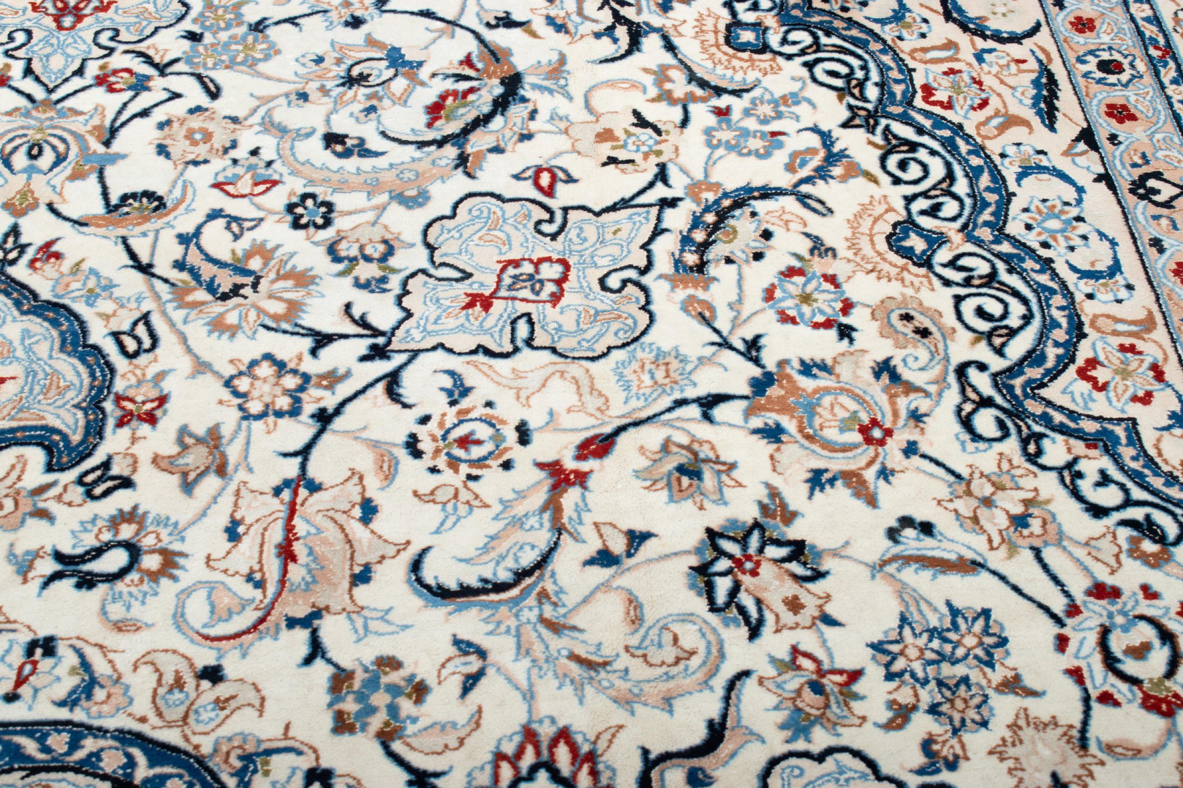 Esta alfombra Nain está clasificada como 9La. Su excelente calidad y su bello diseño oriental con motivos curvilíneos harán las delicias de cualquier comprador. Esta alfombra persa fue anudada a mano en la ciudad de Nain, situada en el extremo occidental del desierto de Dasht-e-Kavir, con lana de alta calidad y seda natural. Las alfombras Nain 9La son claramente más finas que las 12La y ya muestran bellos detalles.