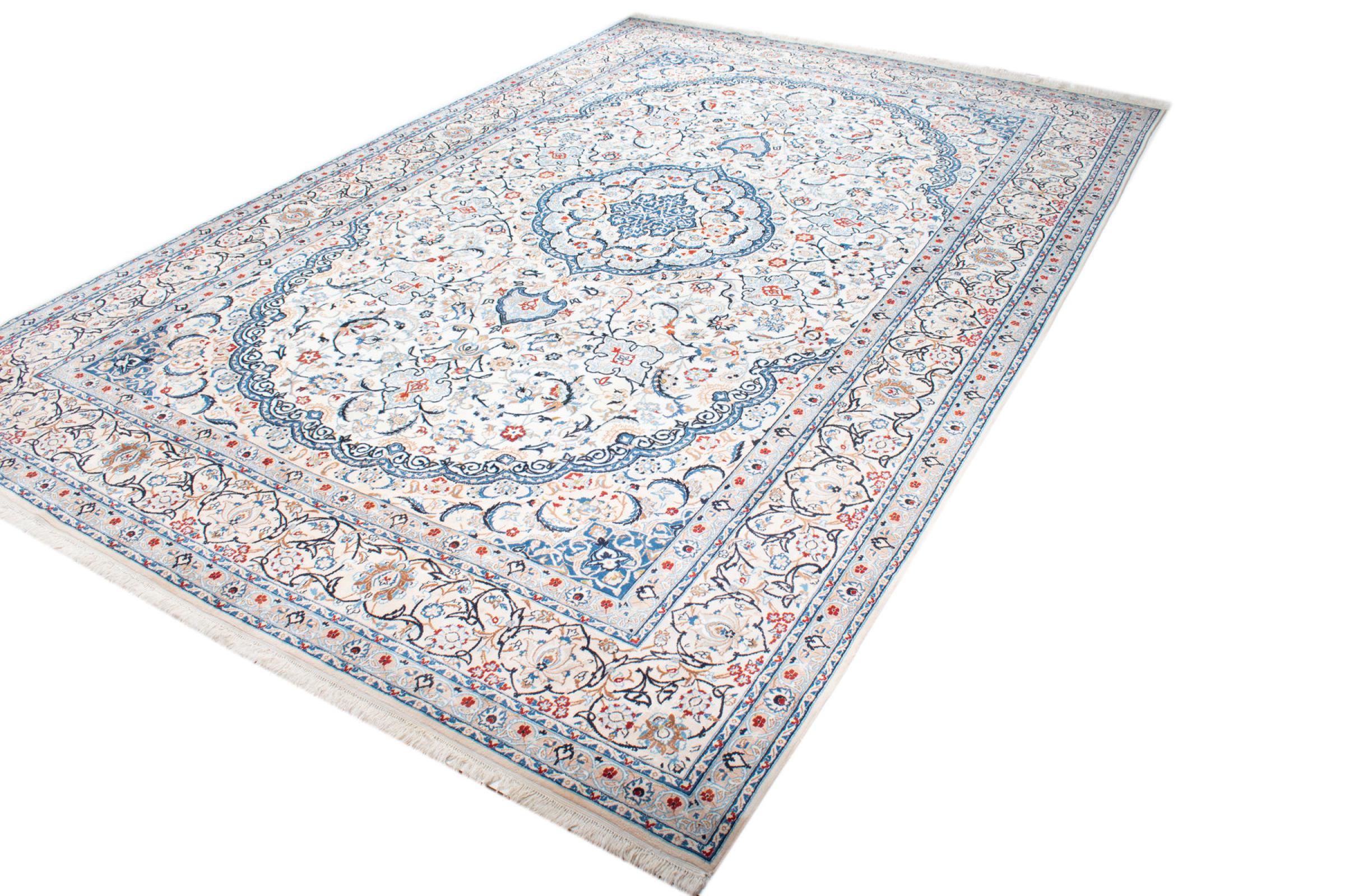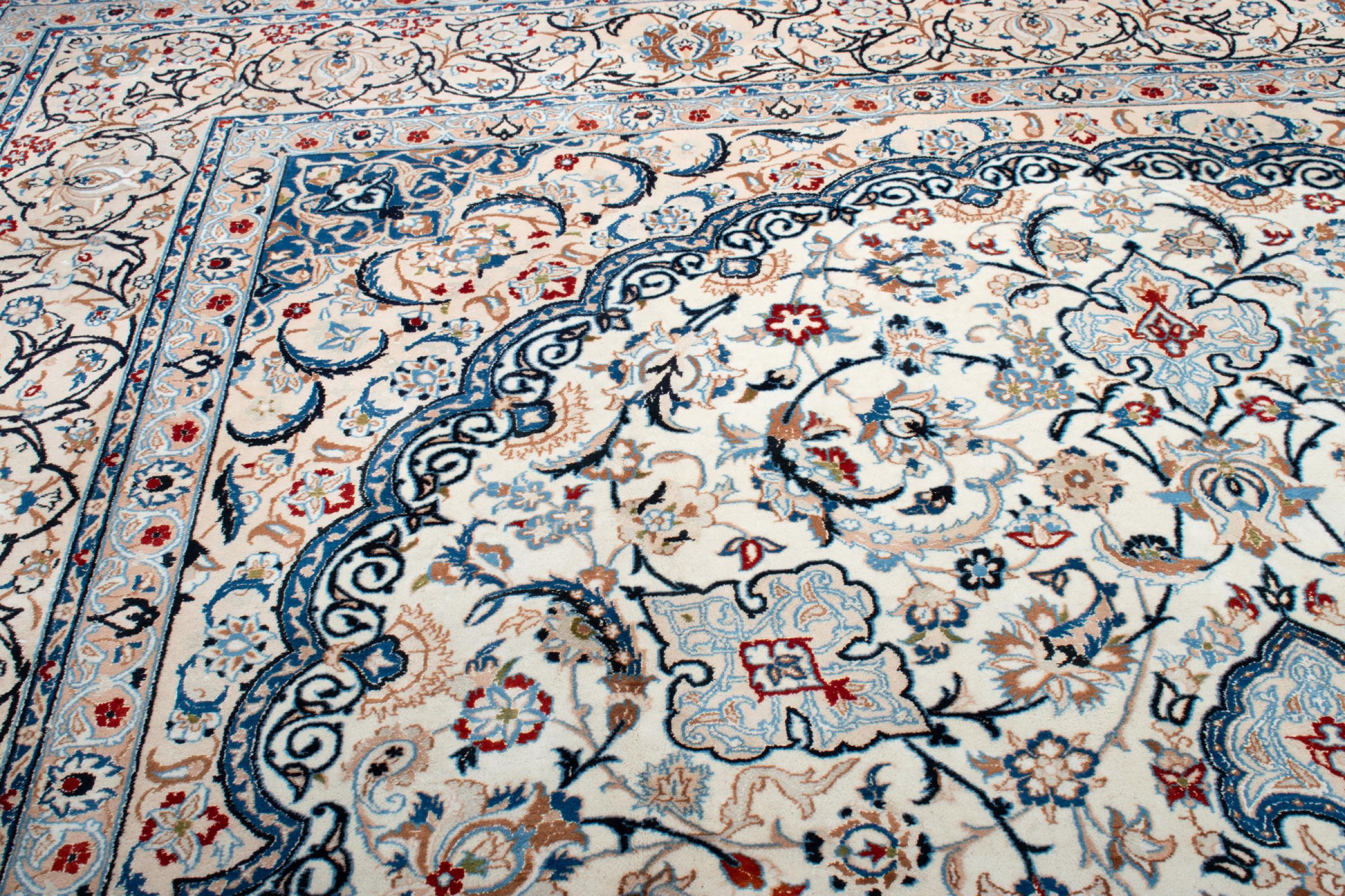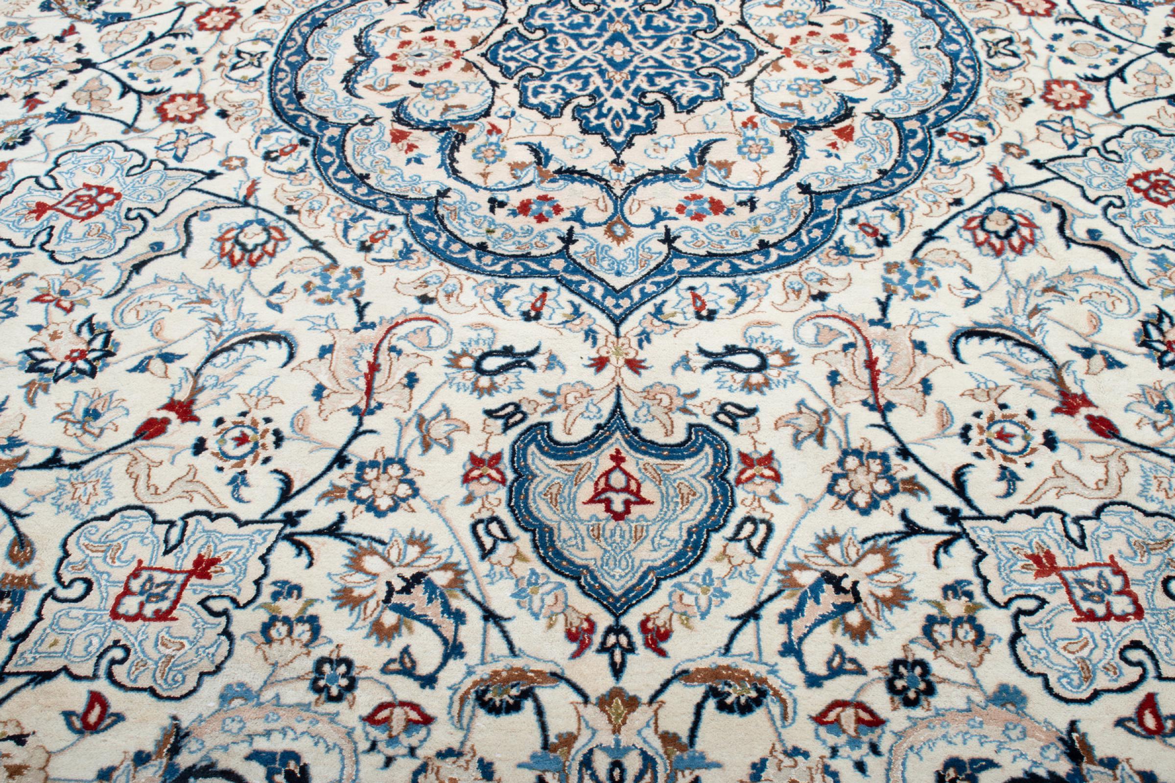 Esta alfombra Nain está clasificada como 9La. Su excelente calidad y su bello diseño oriental con motivos curvilíneos harán las delicias de cualquier comprador. Esta alfombra persa fue anudada a mano en la ciudad de Nain, situada en el extremo occidental del desierto de Dasht-e-Kavir, con lana de alta calidad y seda natural. Las alfombras Nain 9La son claramente más finas que las 12La y ya muestran bellos detalles.