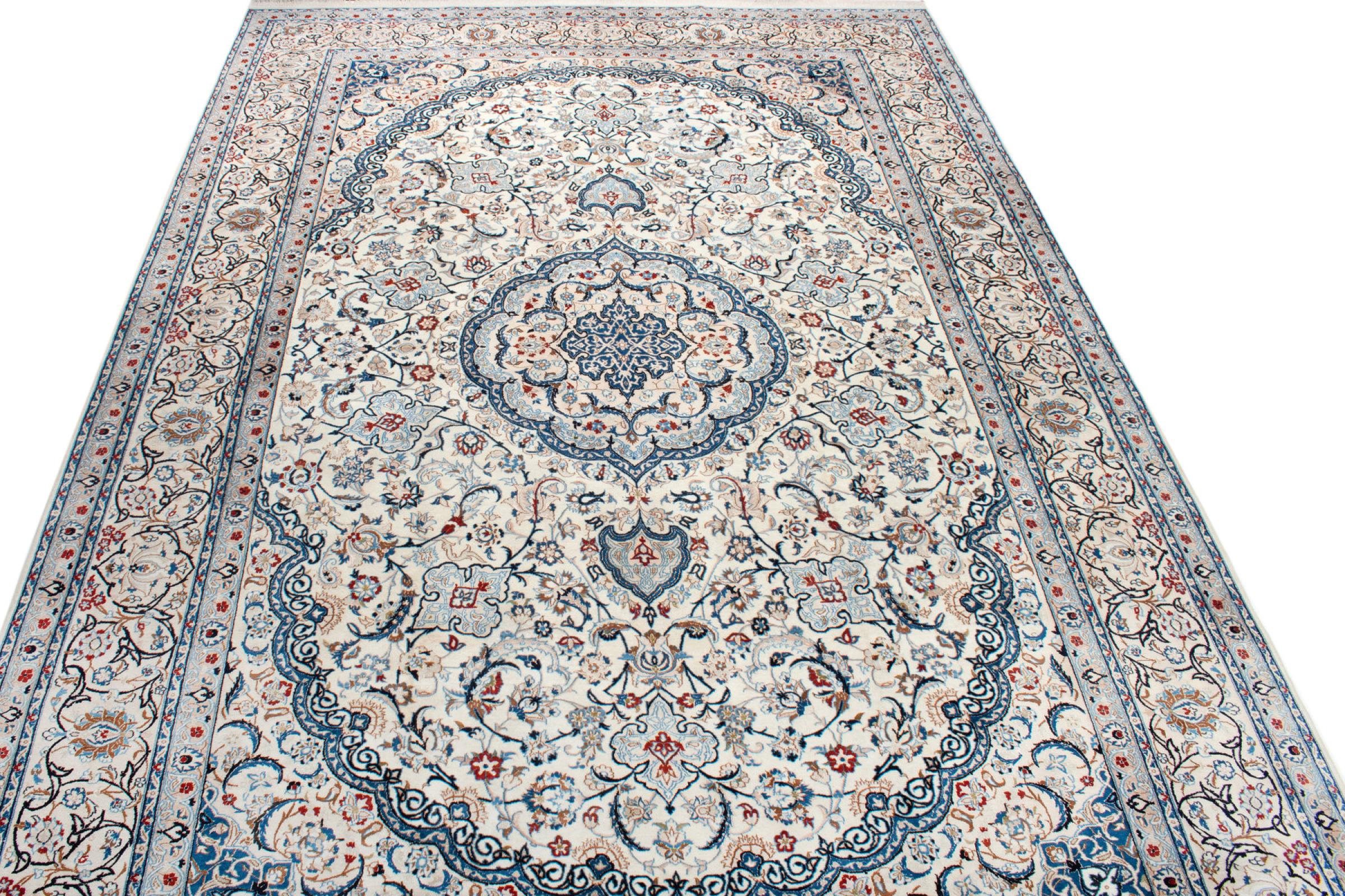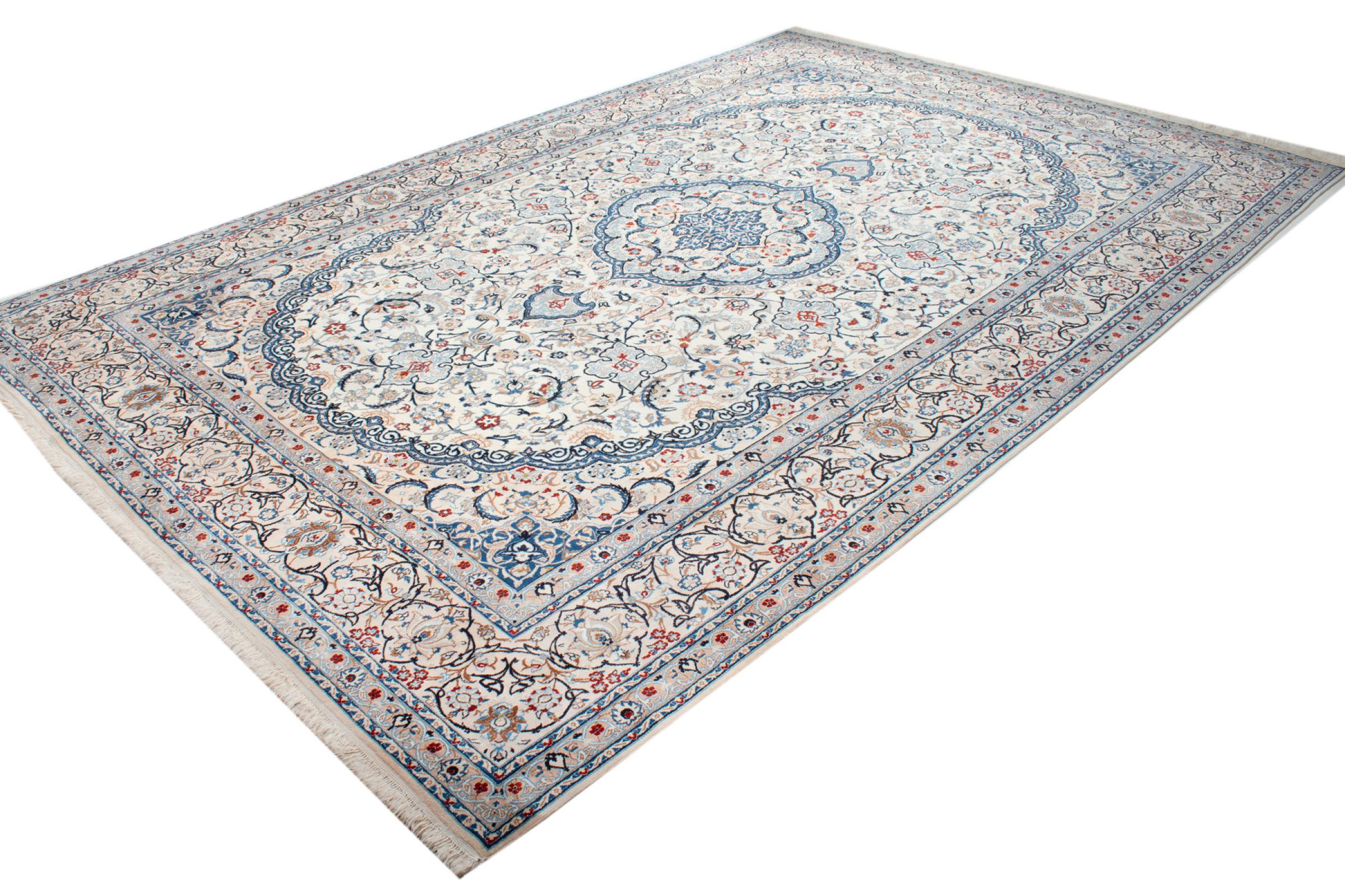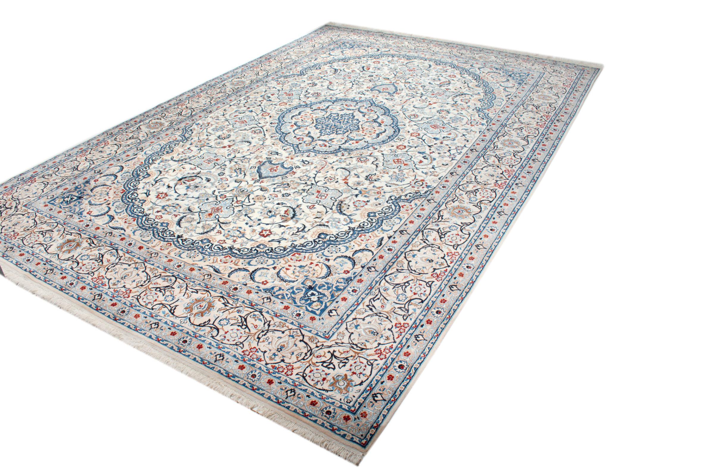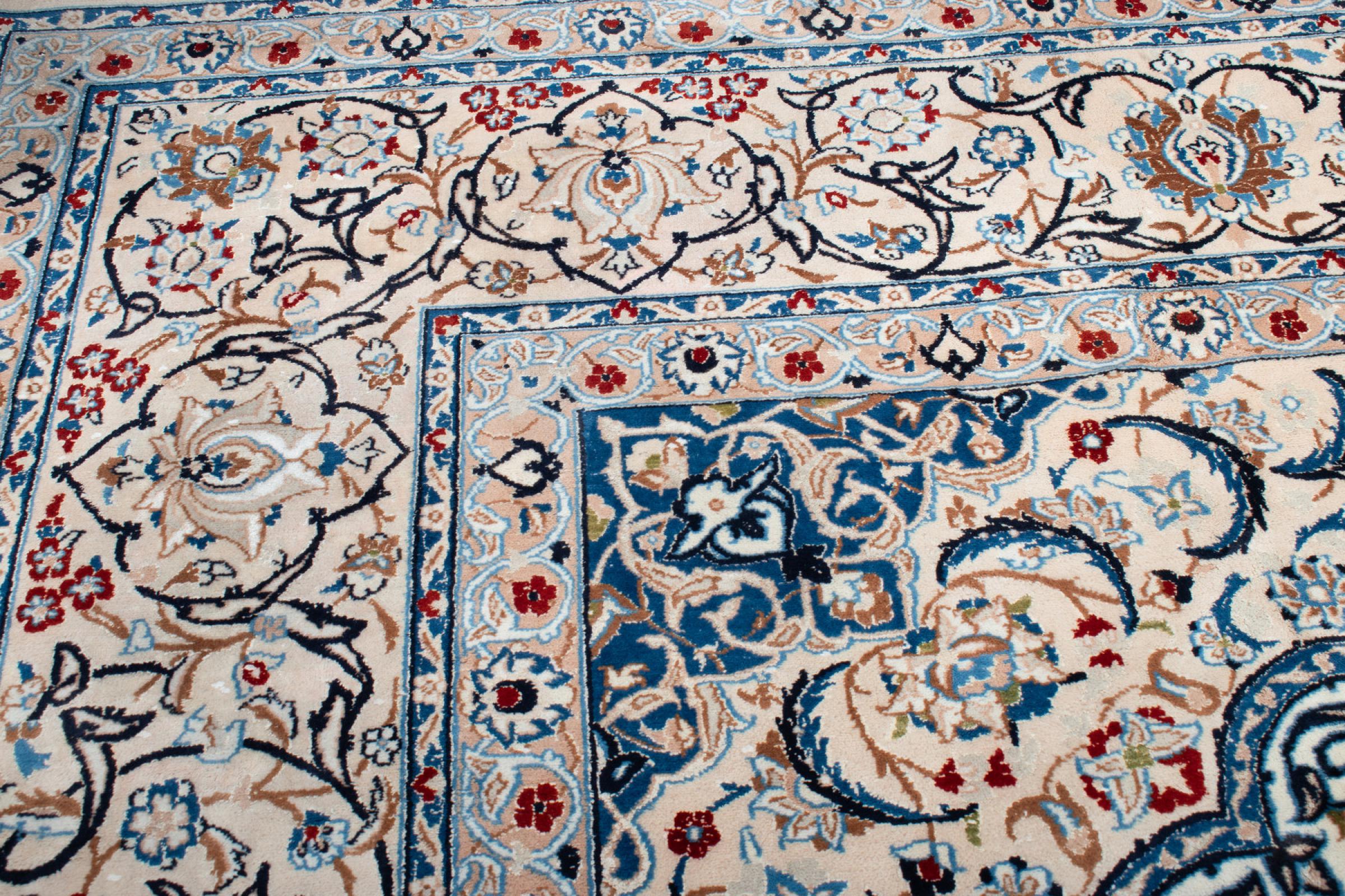 Esta alfombra Nain está clasificada como 9La. Su excelente calidad y su bello diseño oriental con motivos curvilíneos harán las delicias de cualquier comprador. Esta alfombra persa fue anudada a mano en la ciudad de Nain, situada en el extremo occidental del desierto de Dasht-e-Kavir, con lana de alta calidad y seda natural. Las alfombras Nain 9La son claramente más finas que las 12La y ya muestran bellos detalles.
