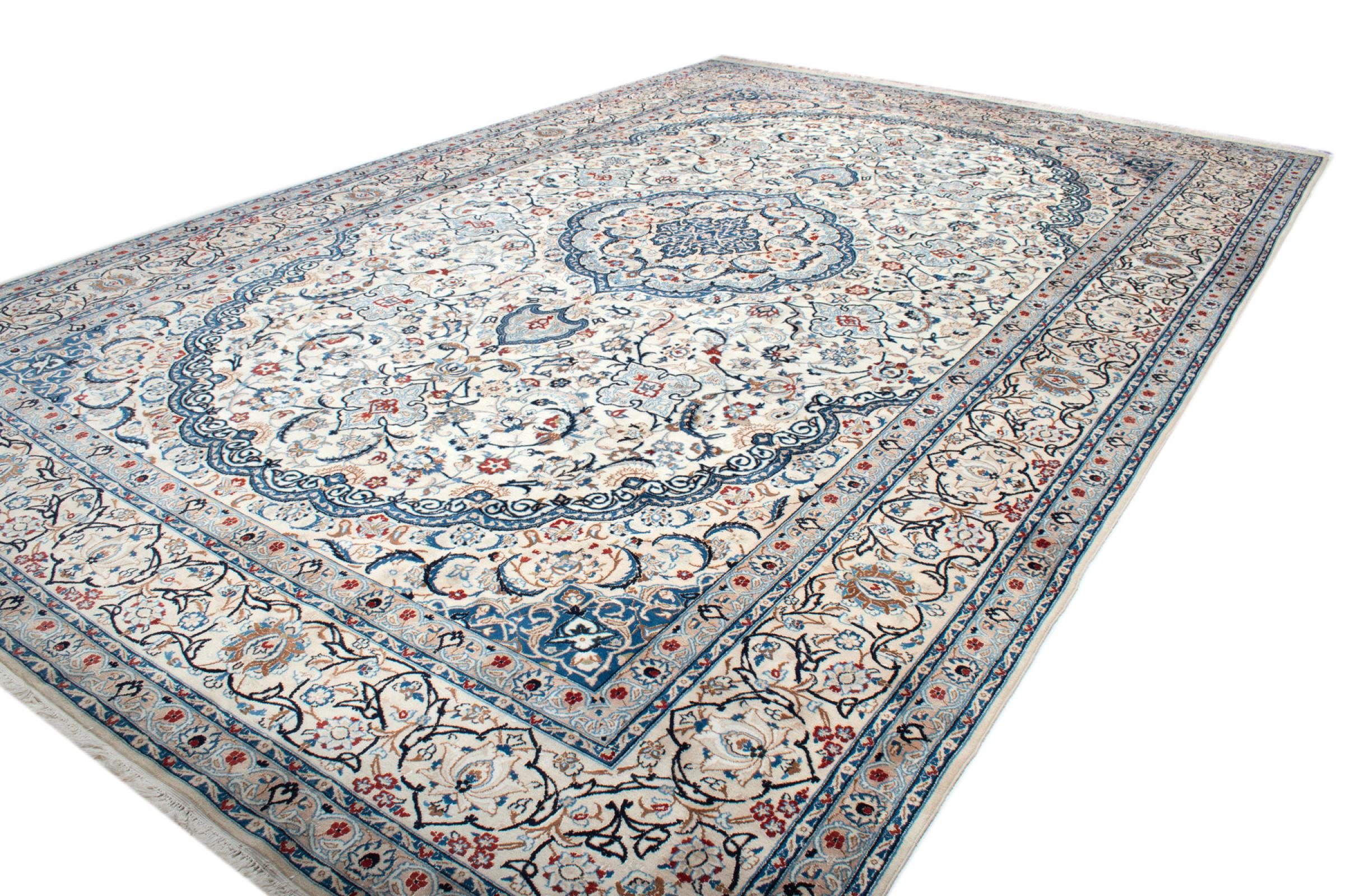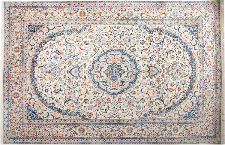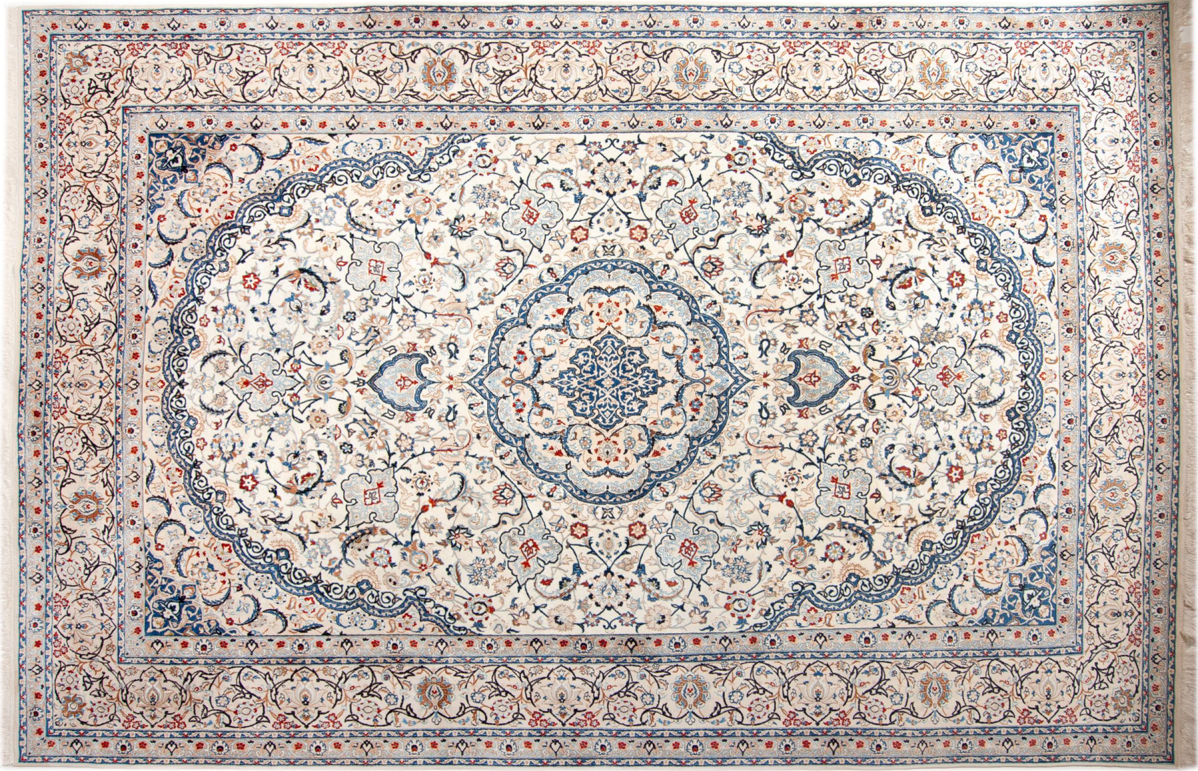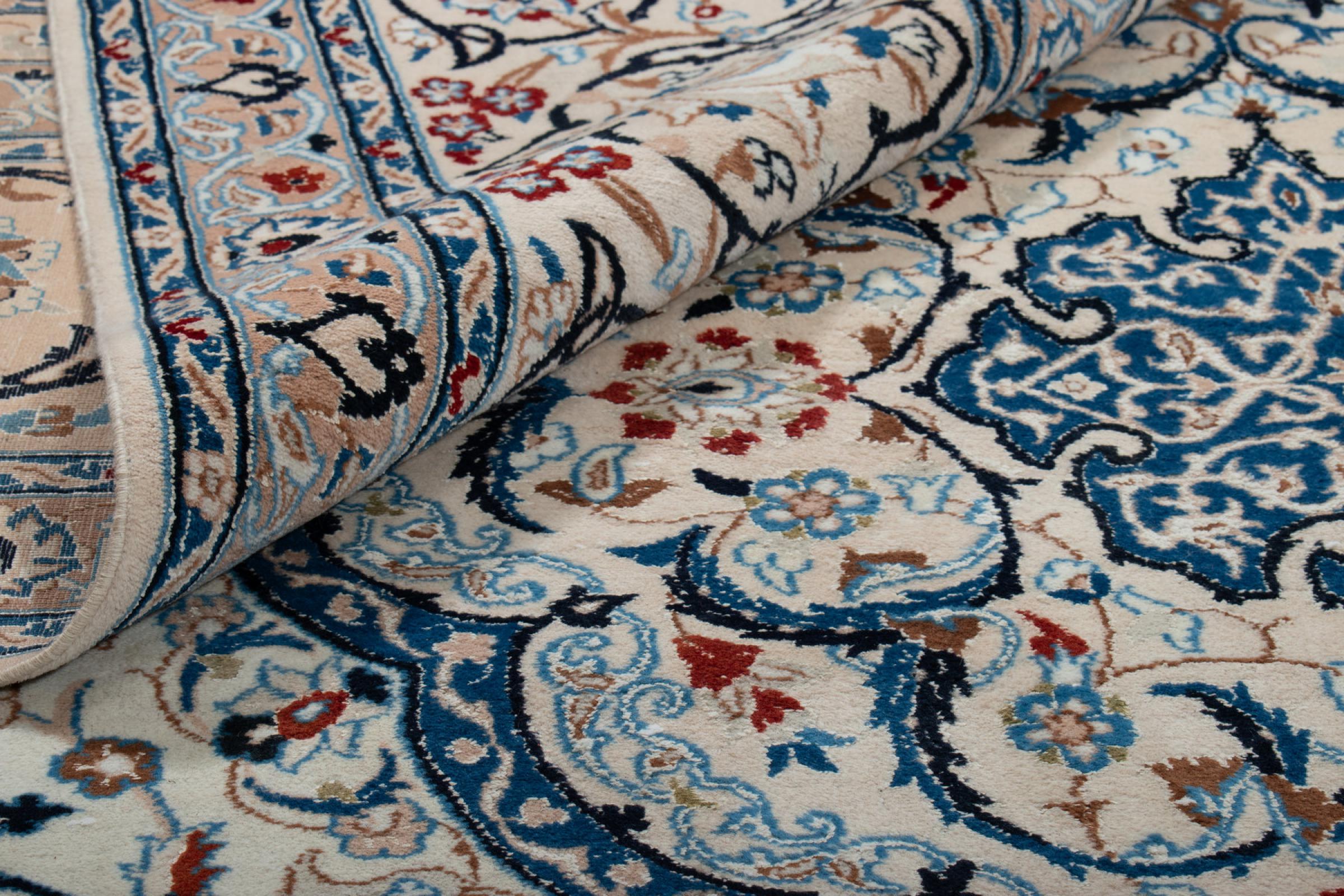 Las alfombras de la ciudad de Nain, en la frontera de uno de los mayores desiertos de Irán, están entre las alfombras persas más famosas del mundo. Su diseño típico es inconfundible con adornos florales, un medallón central y tonos beige y rojo o azul. Gracias a sus designaciones 4La, 6La, 9La y 12La, las sutilezas de una alfombra de Nain se pueden ver a simple vista. Cuanto más bajo sea el número "La", más alta es la densidad del nudo y por lo tanto más fina es la alfombra.