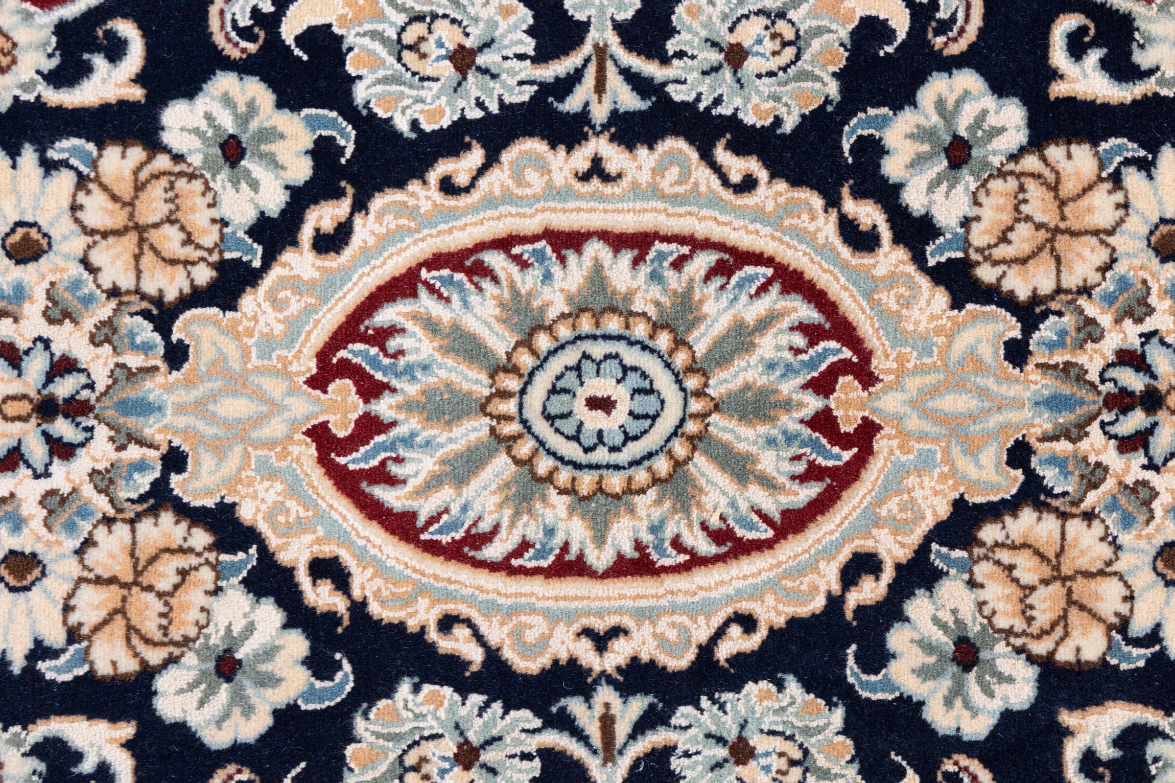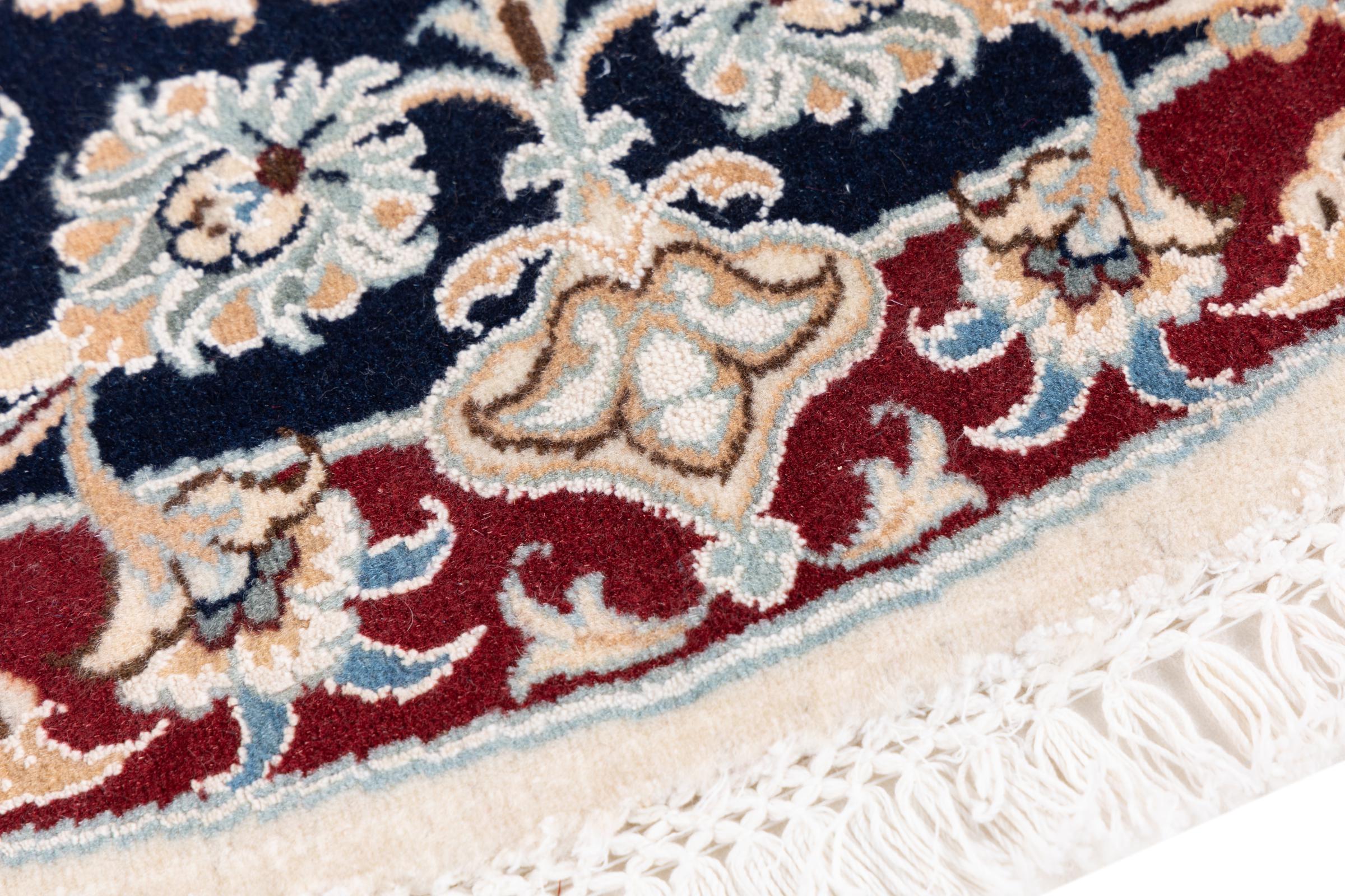 Esta alfombra Nain está clasificada como 9La. Su excelente calidad y su bello diseño oriental con motivos curvilíneos harán las delicias de cualquier comprador. Esta alfombra persa fue anudada a mano en la ciudad de Nain, situada en el extremo occidental del desierto de Dasht-e-Kavir, con lana de alta calidad y seda natural. Las alfombras Nain 9La son claramente más finas que las 12La y ya muestran bellos detalles.