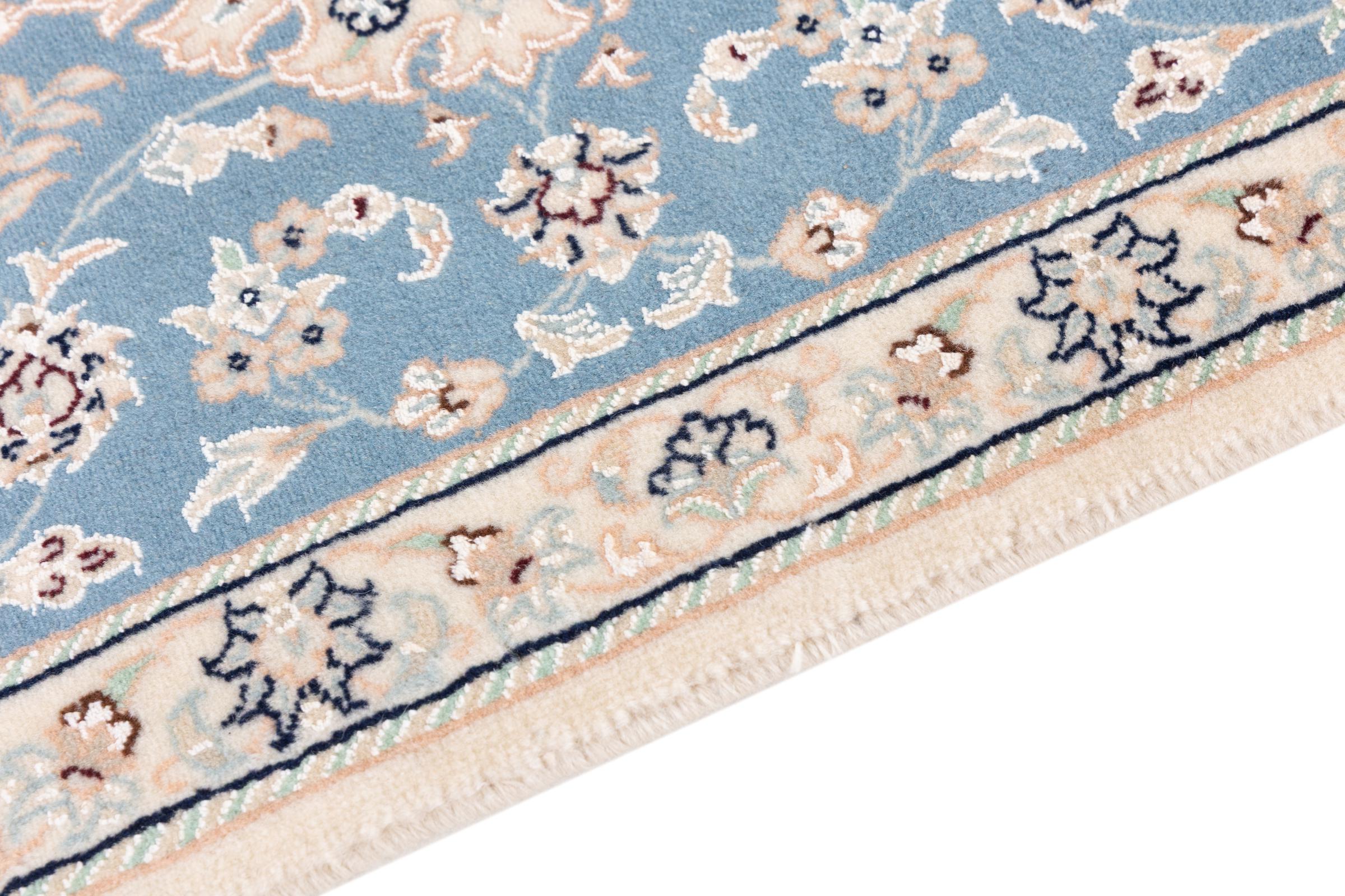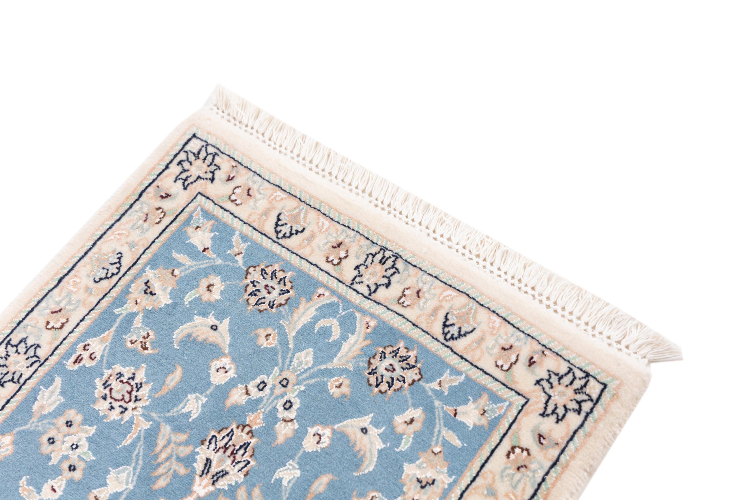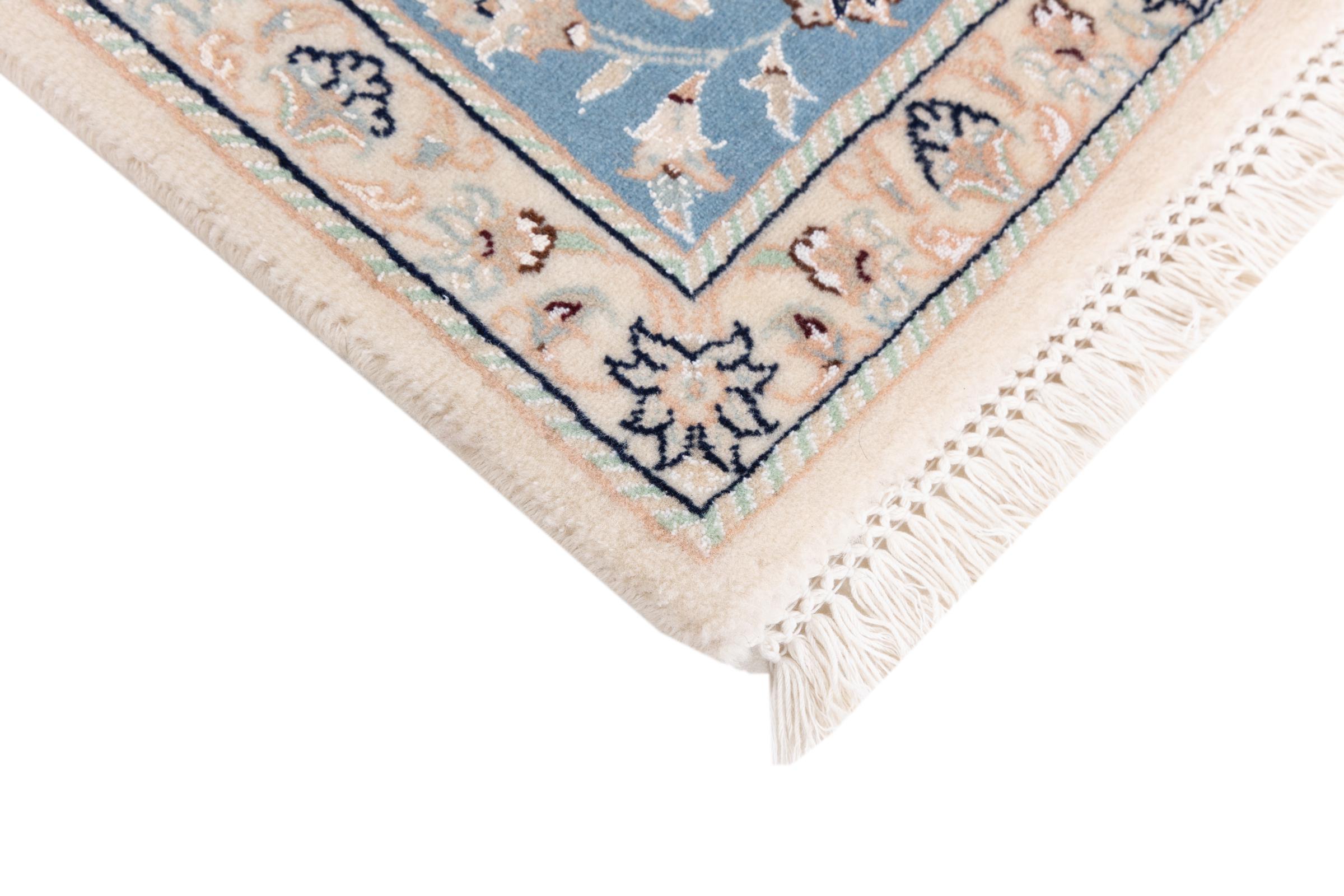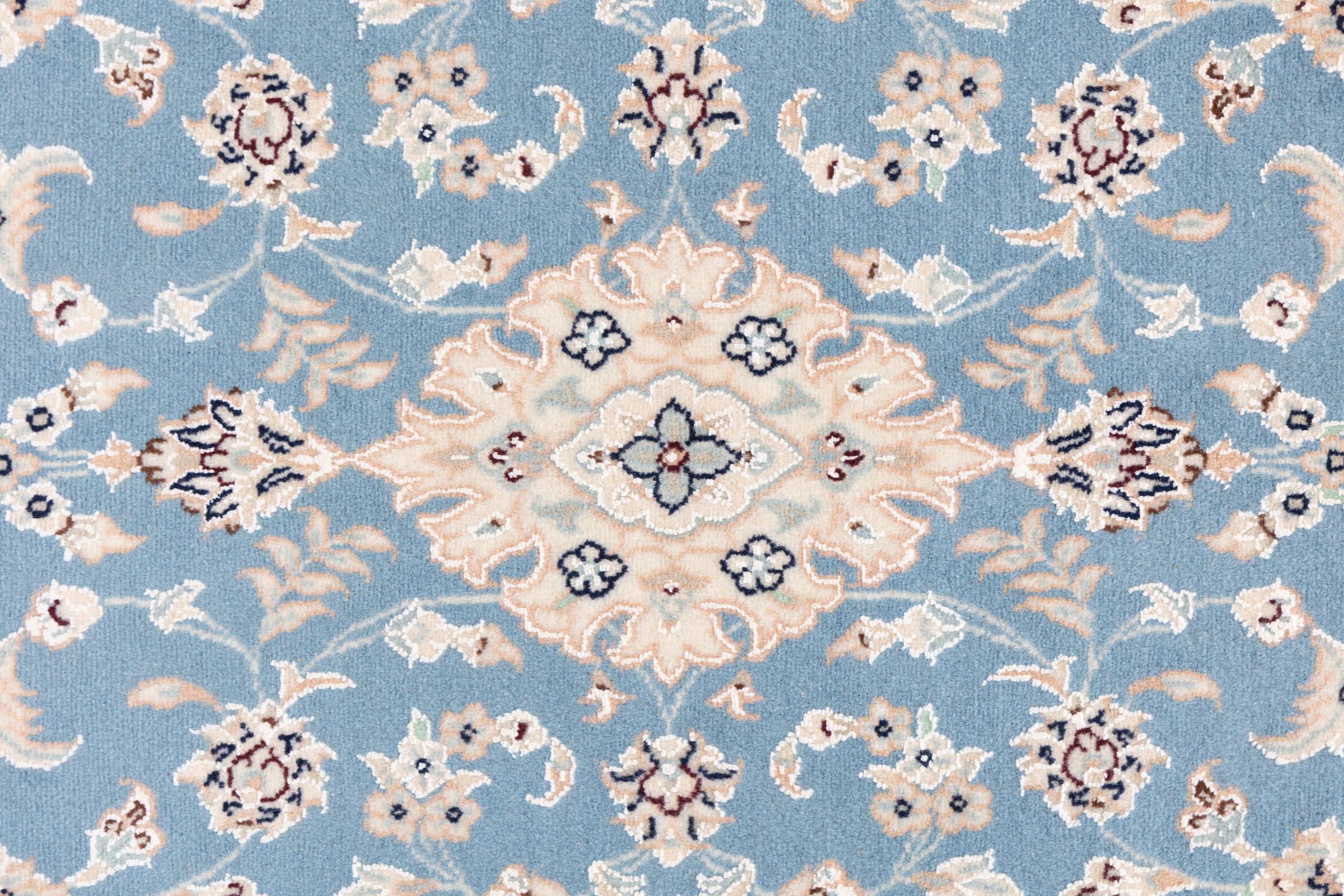 Esta alfombra Nain está clasificada como 9La. Su excelente calidad y su bello diseño oriental con motivos curvilíneos harán las delicias de cualquier comprador. Esta alfombra persa fue anudada a mano en la ciudad de Nain, situada en el extremo occidental del desierto de Dasht-e-Kavir, con lana de alta calidad y seda natural. Las alfombras Nain 9La son claramente más finas que las 12La y ya muestran bellos detalles.