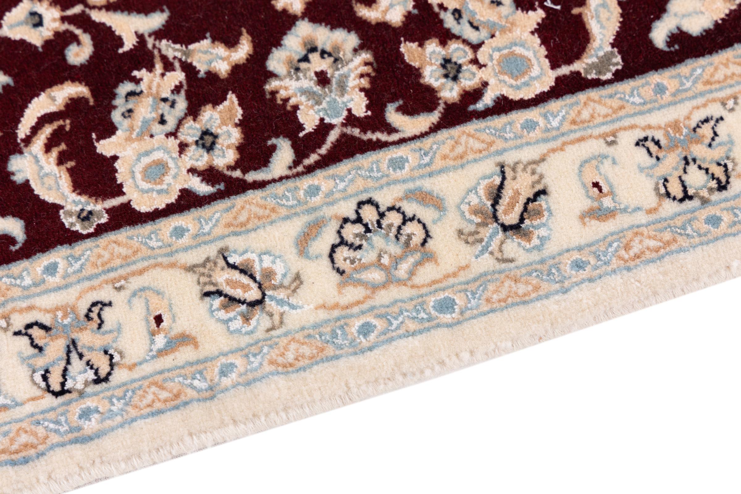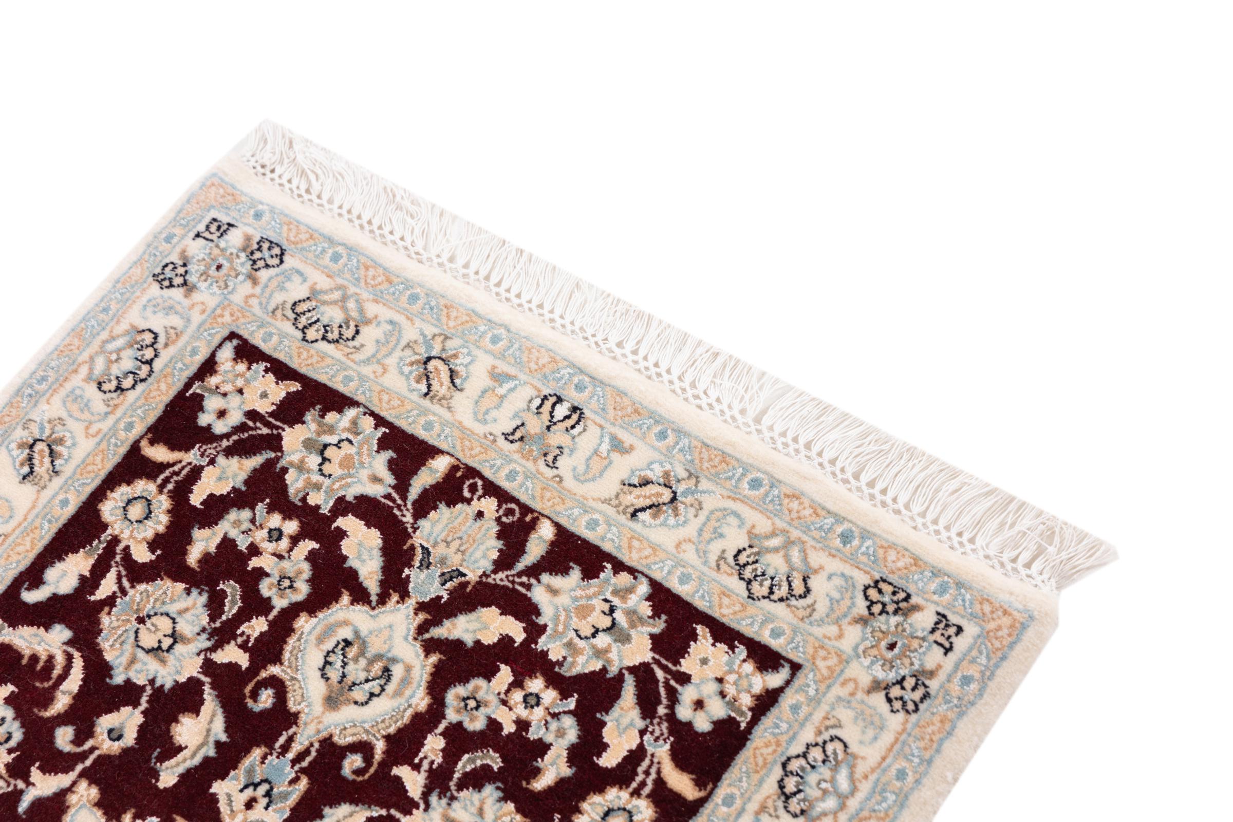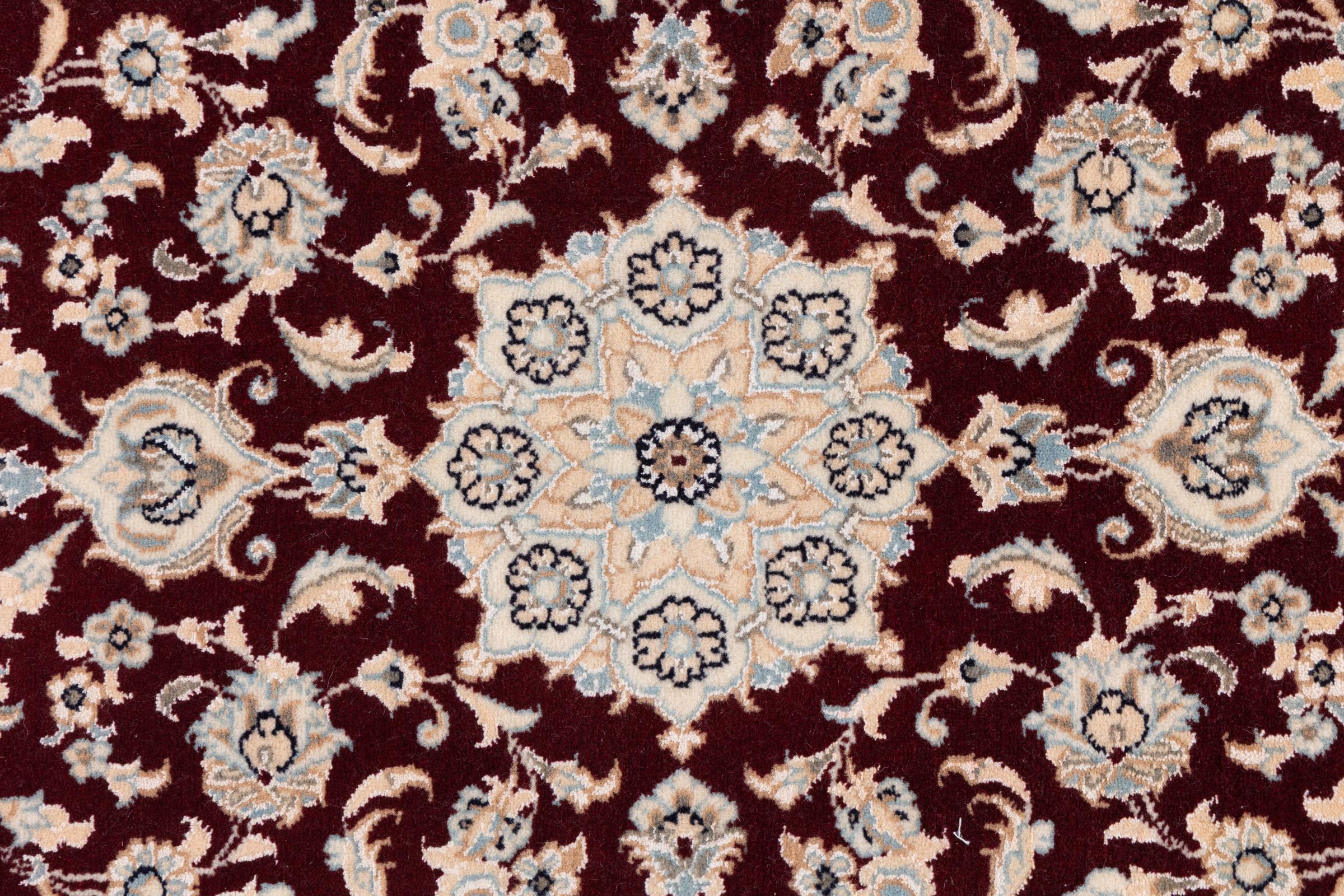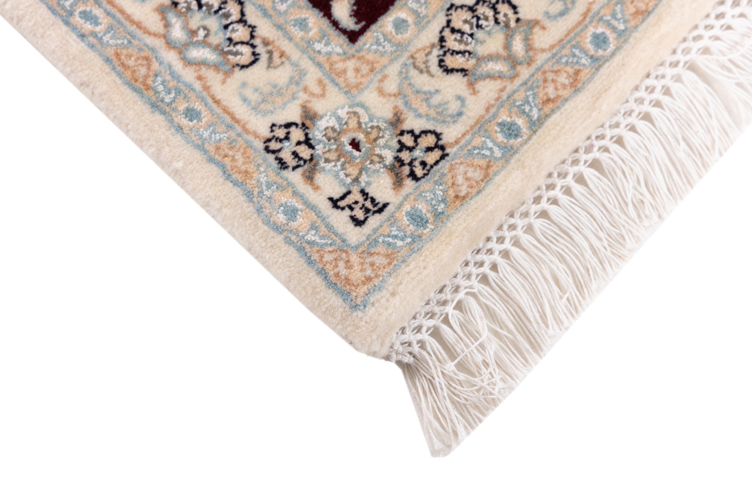 Esta alfombra Nain está clasificada como 9La. Su excelente calidad y su bello diseño oriental con motivos curvilíneos harán las delicias de cualquier comprador. Esta alfombra persa fue anudada a mano en la ciudad de Nain, situada en el extremo occidental del desierto de Dasht-e-Kavir, con lana de alta calidad y seda natural. Las alfombras Nain 9La son claramente más finas que las 12La y ya muestran bellos detalles.