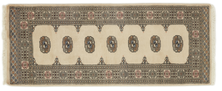 Una gran parte de la producción de alfombras pakistaníes tiene lugar en las ciudades de Lahore y Karachi y sus alrededores. Muchos de los tejedores de alfombras de esa época huyeron a Pakistán durante la guerra con la India y se establecieron allí. Hoy en día, se conocen especialmente las alfombras anudadas a mano de Pakistán Bukhara. Al igual que las alfombras orientales afganas, las alfombras paquistaníes también son de colores oscuros y en su mayoría tienen tonos rojos. También el conocido patrón de pata de elefante (patrón octogonal repetido) se puede encontrar en un pakistaní.