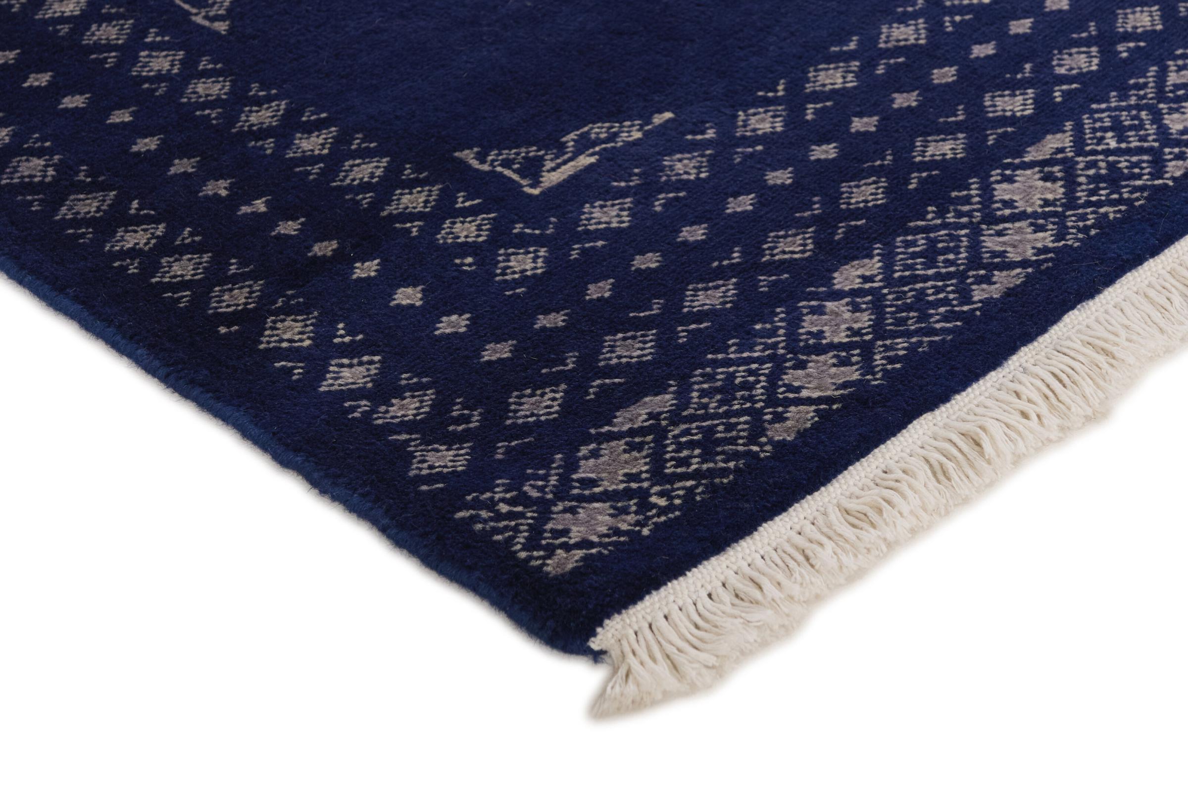 Esta alfombra anudada a mano procedente de Pakistán tiene rasgos muy típicos. Los ornamentos redondos se repiten en el suelo y conforman el tipo de alfombra. 2Ply y 3Ply son diferencias en la densidad de anudado de las alfombras. Una 3Ply suele tener un anudado más denso y, por tanto, es más costosa de producir y algo más robusta. Estas hermosas alfombras son populares por sus fascinantes colores y su diseño sereno.
