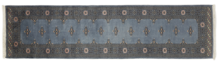 Una gran parte de la producción de alfombras pakistaníes tiene lugar en las ciudades de Lahore y Karachi y sus alrededores. Muchos de los tejedores de alfombras de esa época huyeron a Pakistán durante la guerra con la India y se establecieron allí. Hoy en día, se conocen especialmente las alfombras anudadas a mano de Pakistán Bukhara. Al igual que las alfombras orientales afganas, las alfombras paquistaníes también son de colores oscuros y en su mayoría tienen tonos rojos. También el conocido patrón de pata de elefante (patrón octogonal repetido) se puede encontrar en un pakistaní.