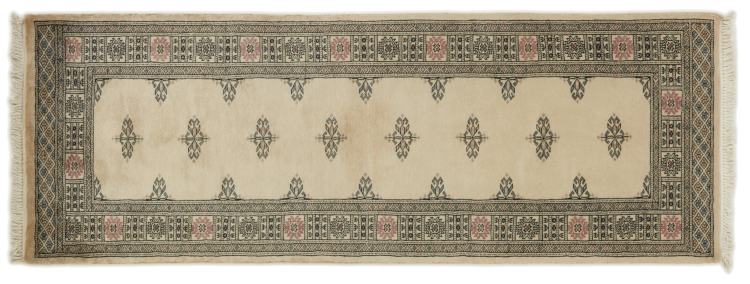 Una gran parte de la producción de alfombras pakistaníes tiene lugar en las ciudades de Lahore y Karachi y sus alrededores. Muchos de los tejedores de alfombras de esa época huyeron a Pakistán durante la guerra con la India y se establecieron allí. Hoy en día, se conocen especialmente las alfombras anudadas a mano de Pakistán Bukhara. Al igual que las alfombras orientales afganas, las alfombras paquistaníes también son de colores oscuros y en su mayoría tienen tonos rojos. También el conocido patrón de pata de elefante (patrón octogonal repetido) se puede encontrar en un pakistaní.