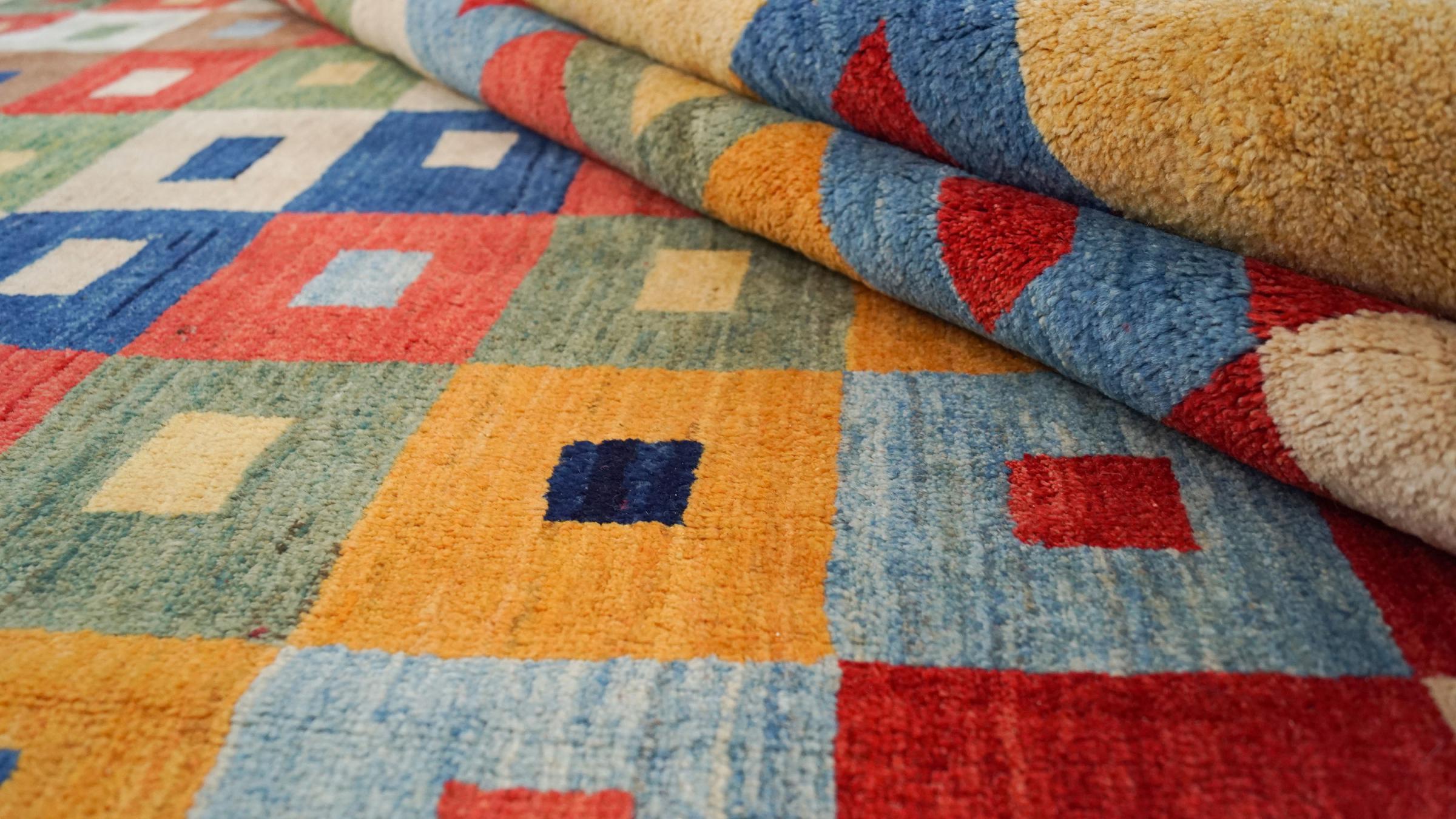 Esta alfombra Gabbeh nómada persa fue tejida a mano de manera tradicional y está hecha de lana virgen de alta calidad. Los colores intensos y los patrones sencillos hacen que cada pieza sea única. Robusta, duradera y especialmente suave: ideal para espacios de vida acogedores.