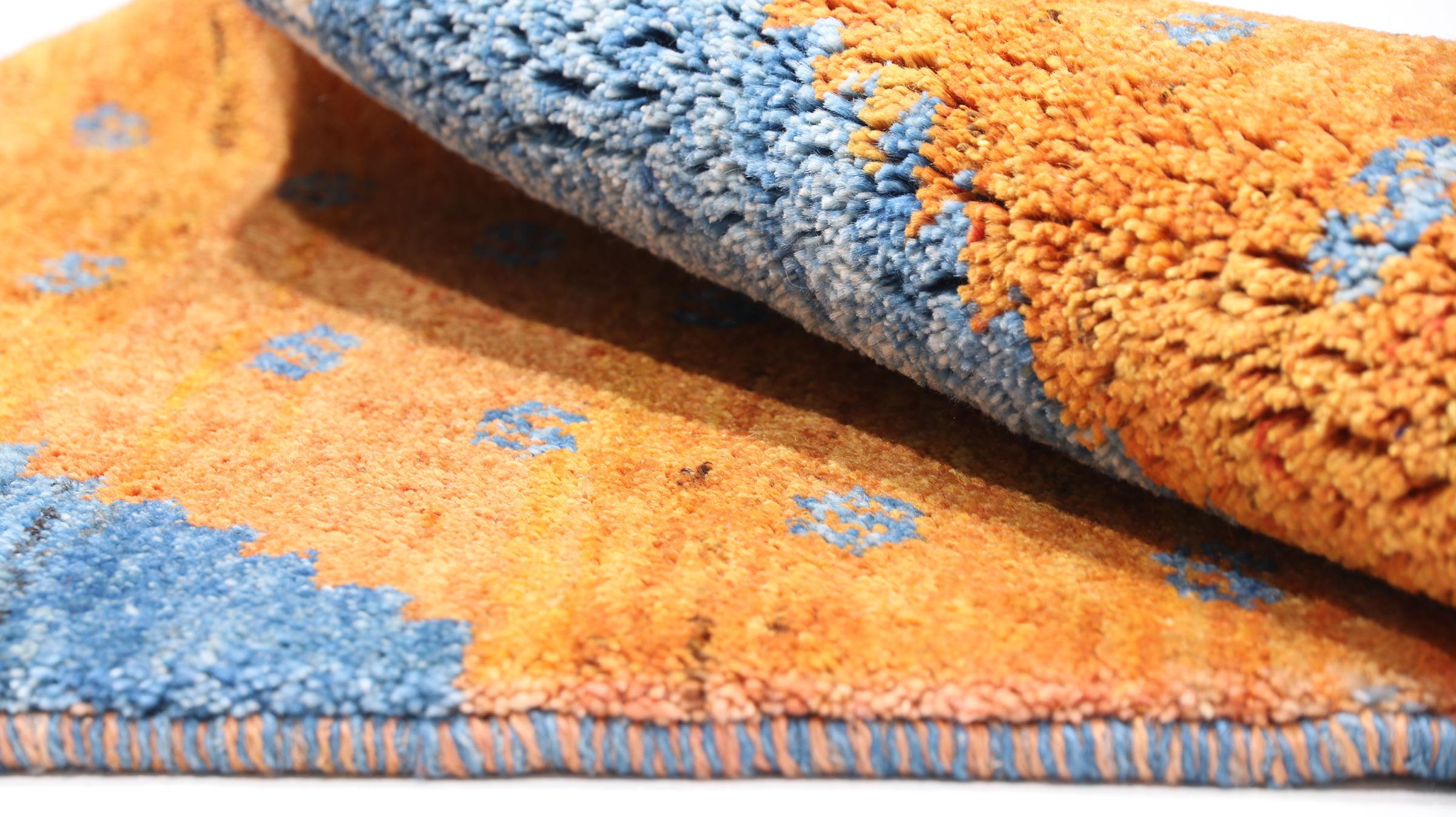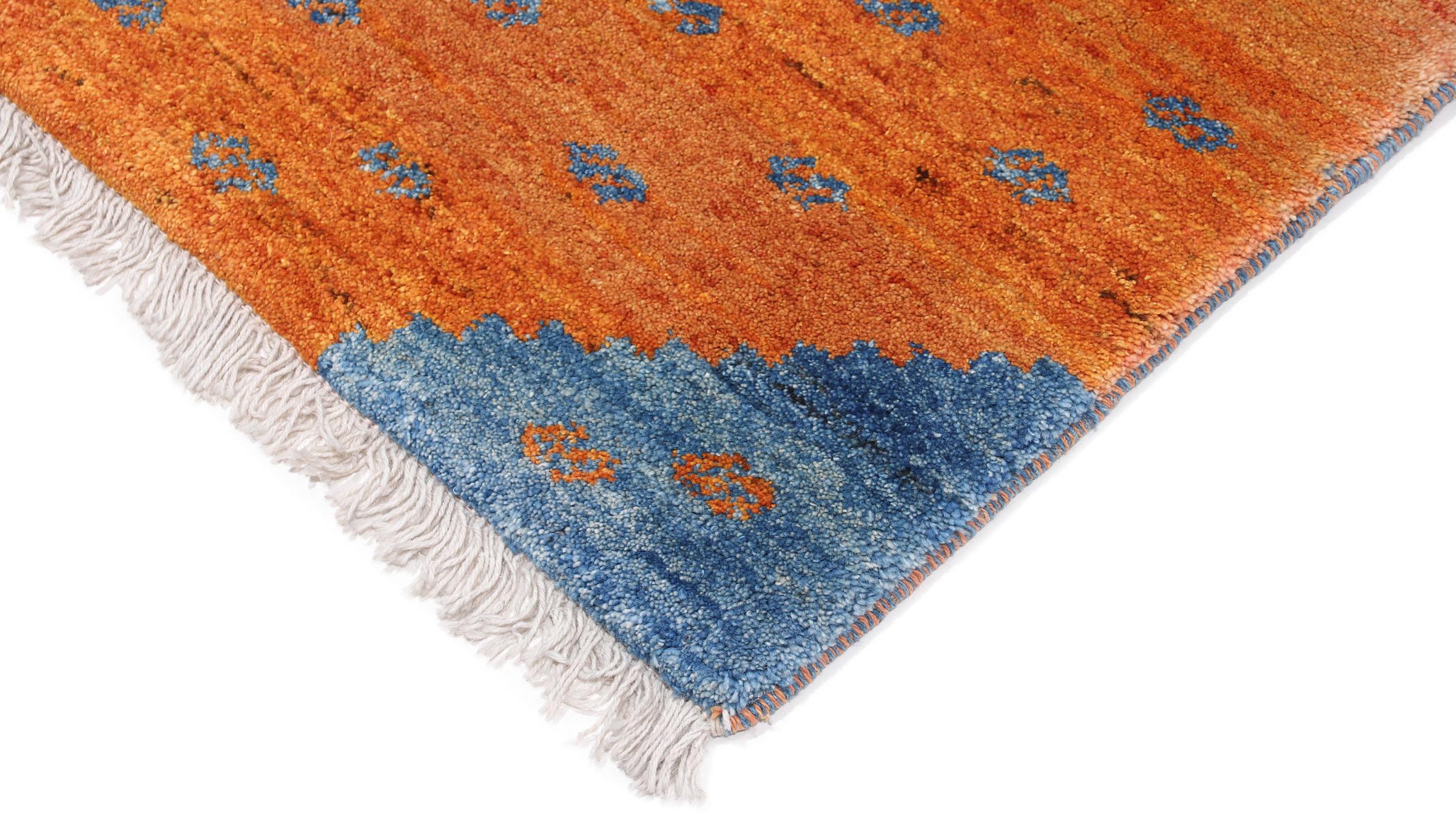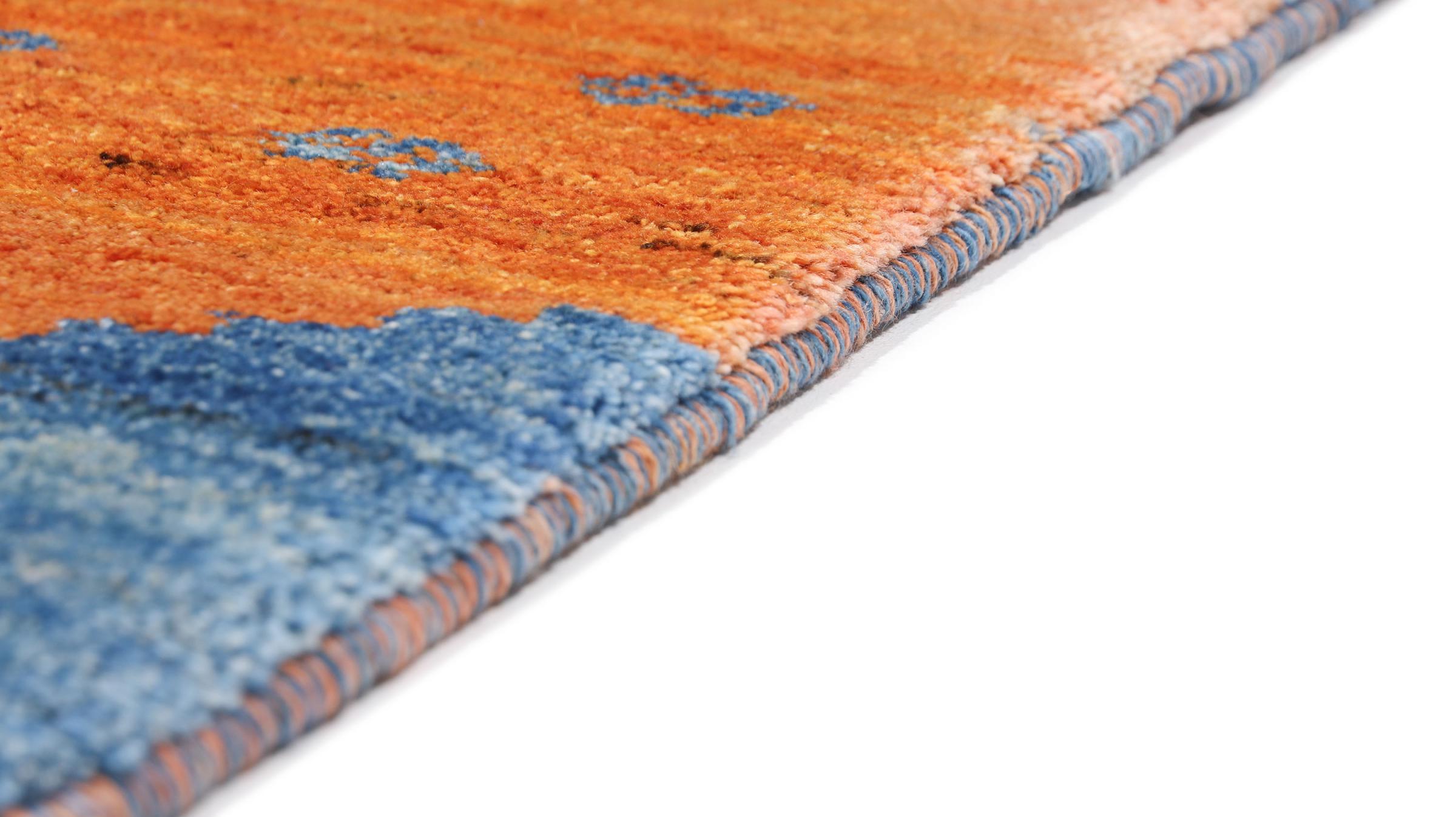 Esta hermosa alfombra es una Gabbeh persa y por lo tanto pertenece a las alfombras Gabbeh de mayor calidad. Las alfombras son anudadas por nómadas o seminómadas en Irán según la artesanía tradicional. Los motivos y patrones simples están inspirados en su mayoría por el entorno inmediato de los nómadas. Por ejemplo, los camellos, árboles o arbustos se pueden encontrar en las alfombras tradicionales. Las alfombras gabbeh persas están hechas de lana de rebaños de ovejas criados localmente. Por lo tanto, la lana se sigue hilando a mano. Así, cada una de estas alfombras orientales encarna un carácter único de la cultura de siglos de antigüedad.