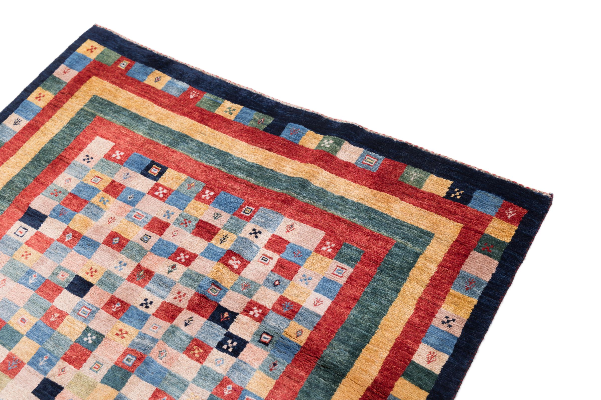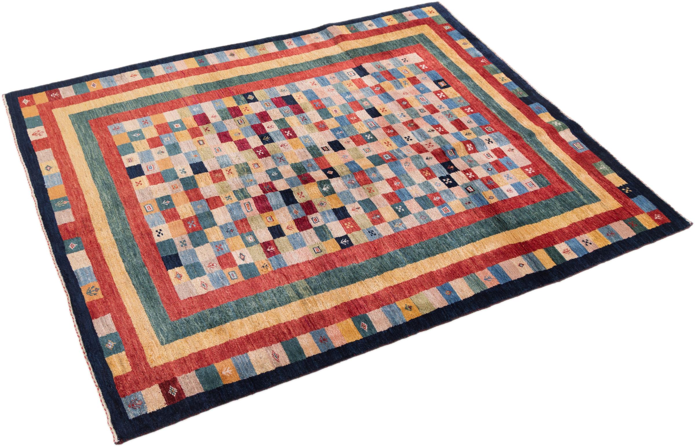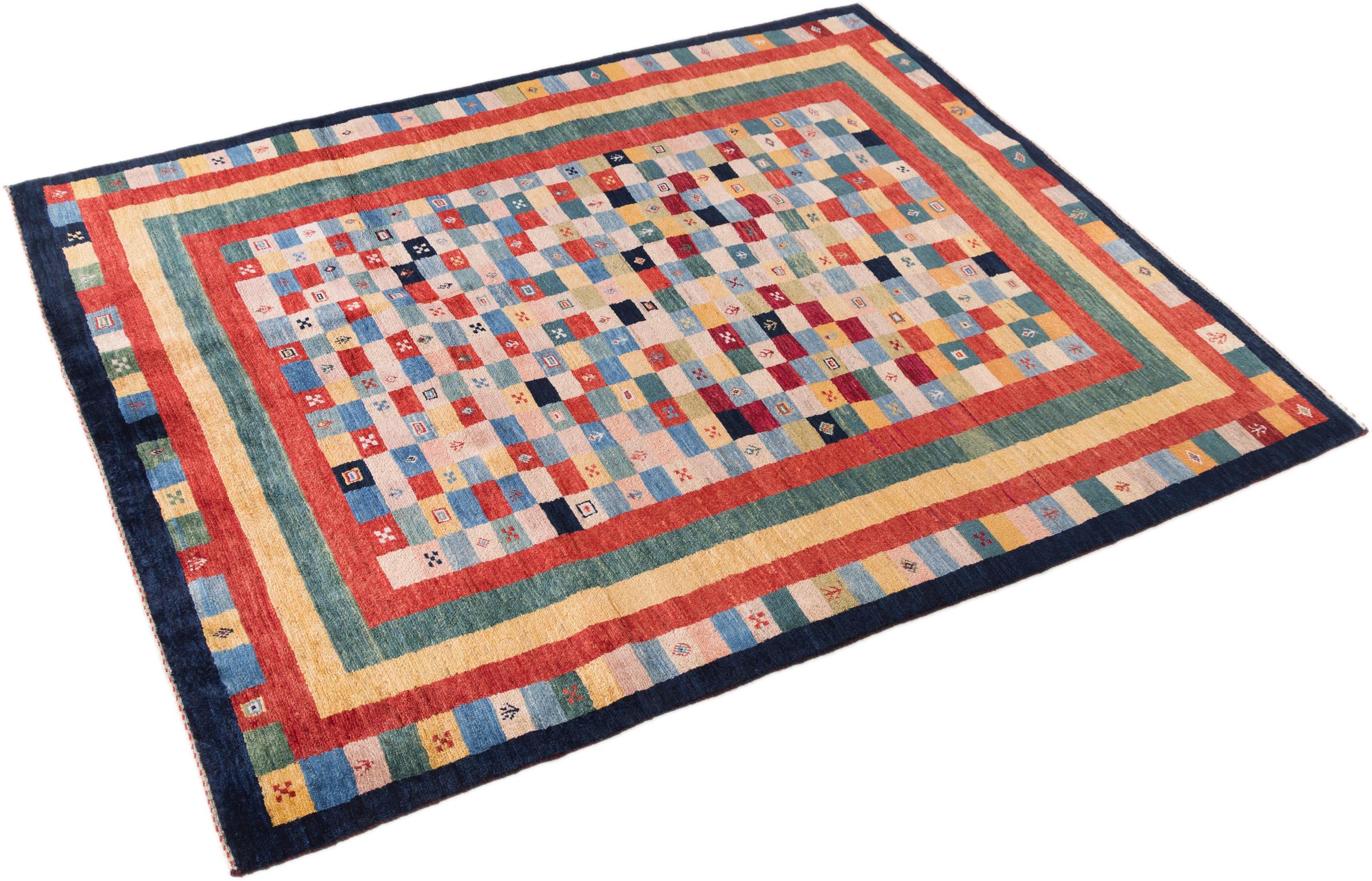 Esta hermosa alfombra es una Gabbeh persa y por lo tanto pertenece a las alfombras Gabbeh de mayor calidad. Las alfombras son anudadas por nómadas o seminómadas en Irán según la artesanía tradicional. Los motivos y patrones simples están inspirados en su mayoría por el entorno inmediato de los nómadas. Por ejemplo, los camellos, árboles o arbustos se pueden encontrar en las alfombras tradicionales. Las alfombras gabbeh persas están hechas de lana de rebaños de ovejas criados localmente. Por lo tanto, la lana se sigue hilando a mano. Así, cada una de estas alfombras orientales encarna un carácter único de la cultura de siglos de antigüedad.