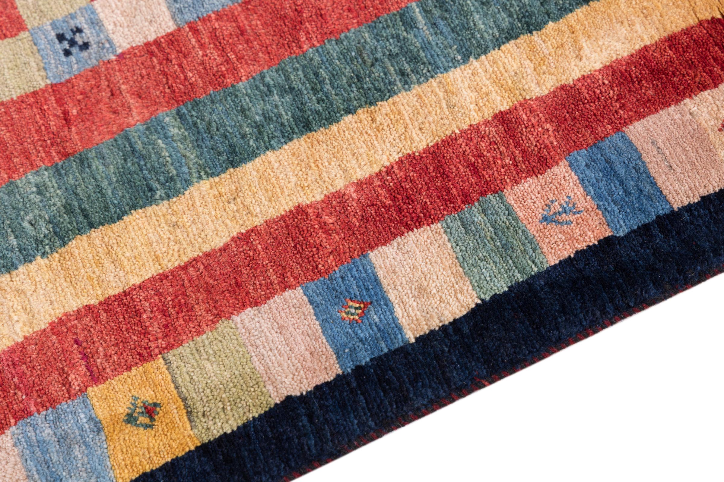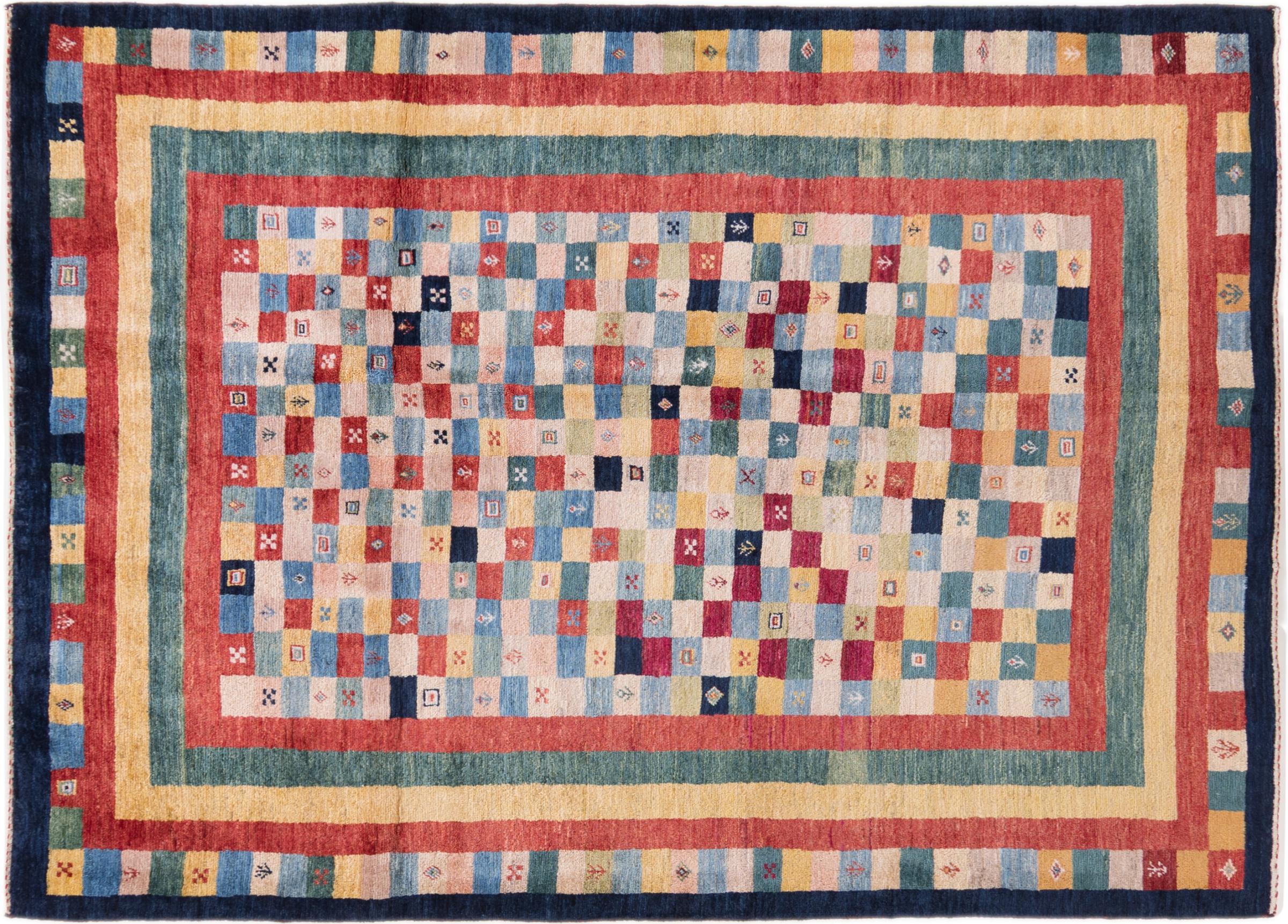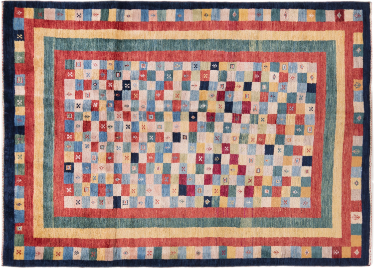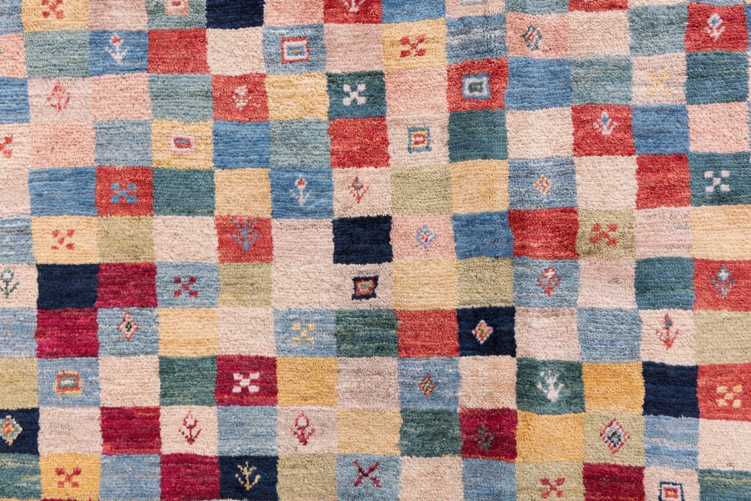 Esta hermosa alfombra es una Gabbeh persa y por lo tanto pertenece a las alfombras Gabbeh de mayor calidad. Las alfombras son anudadas por nómadas o seminómadas en Irán según la artesanía tradicional. Los motivos y patrones simples están inspirados en su mayoría por el entorno inmediato de los nómadas. Por ejemplo, los camellos, árboles o arbustos se pueden encontrar en las alfombras tradicionales. Las alfombras gabbeh persas están hechas de lana de rebaños de ovejas criados localmente. Por lo tanto, la lana se sigue hilando a mano. Así, cada una de estas alfombras orientales encarna un carácter único de la cultura de siglos de antigüedad.