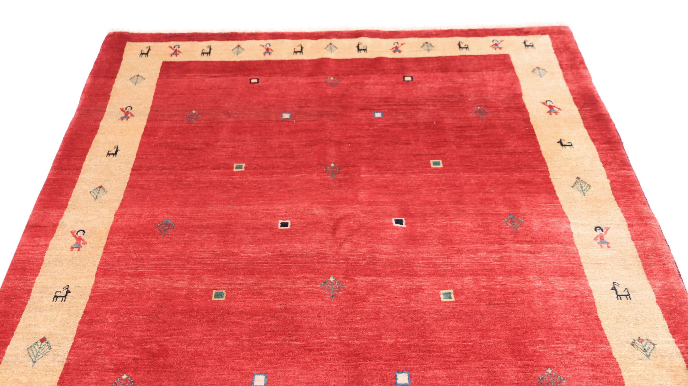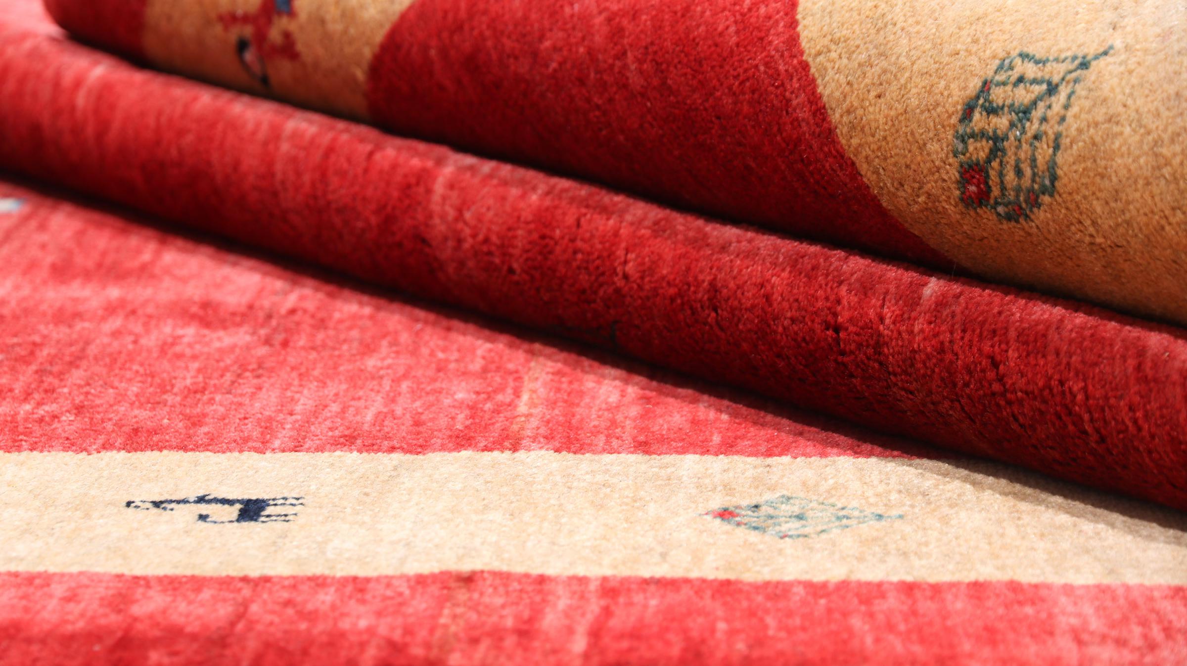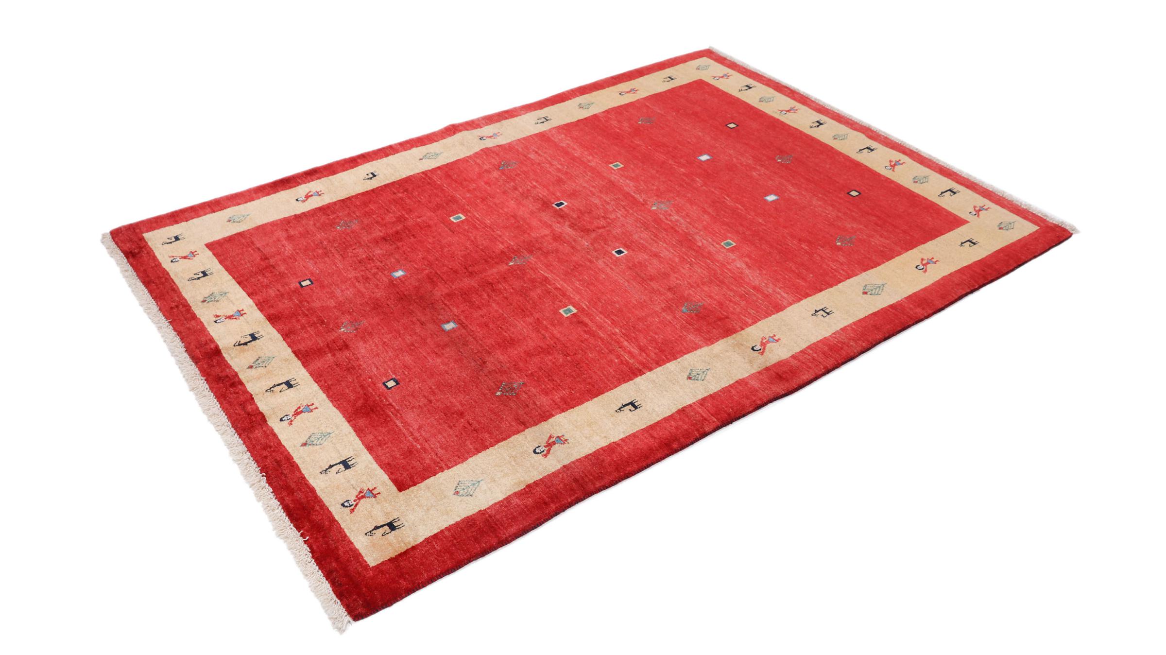 Esta hermosa alfombra es una Gabbeh persa y por lo tanto pertenece a las alfombras Gabbeh de mayor calidad. Las alfombras son anudadas por nómadas o seminómadas en Irán según la artesanía tradicional. Los motivos y patrones simples están inspirados en su mayoría por el entorno inmediato de los nómadas. Por ejemplo, los camellos, árboles o arbustos se pueden encontrar en las alfombras tradicionales. Las alfombras gabbeh persas están hechas de lana de rebaños de ovejas criados localmente. Por lo tanto, la lana se sigue hilando a mano. Así, cada una de estas alfombras orientales encarna un carácter único de la cultura de siglos de antigüedad.