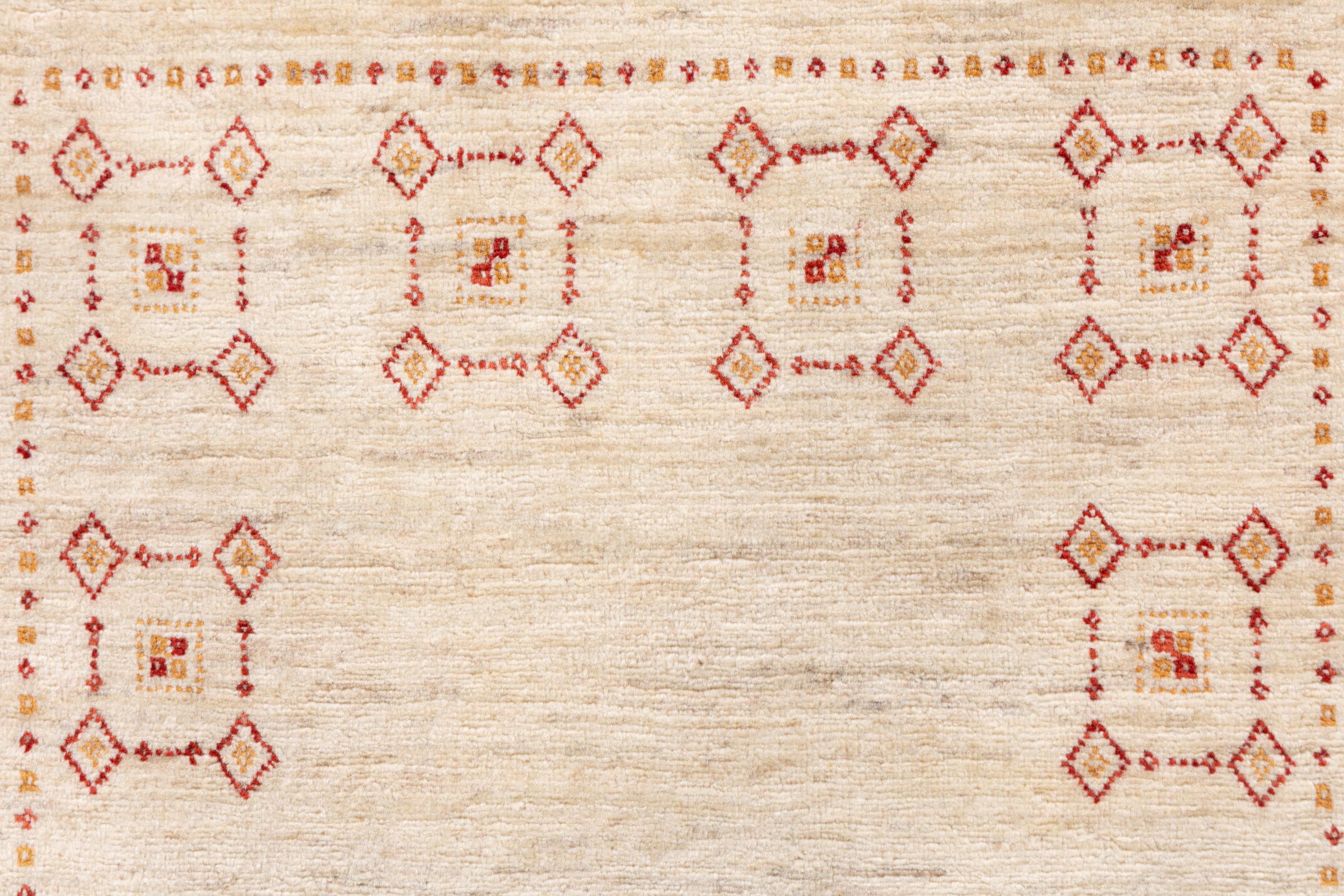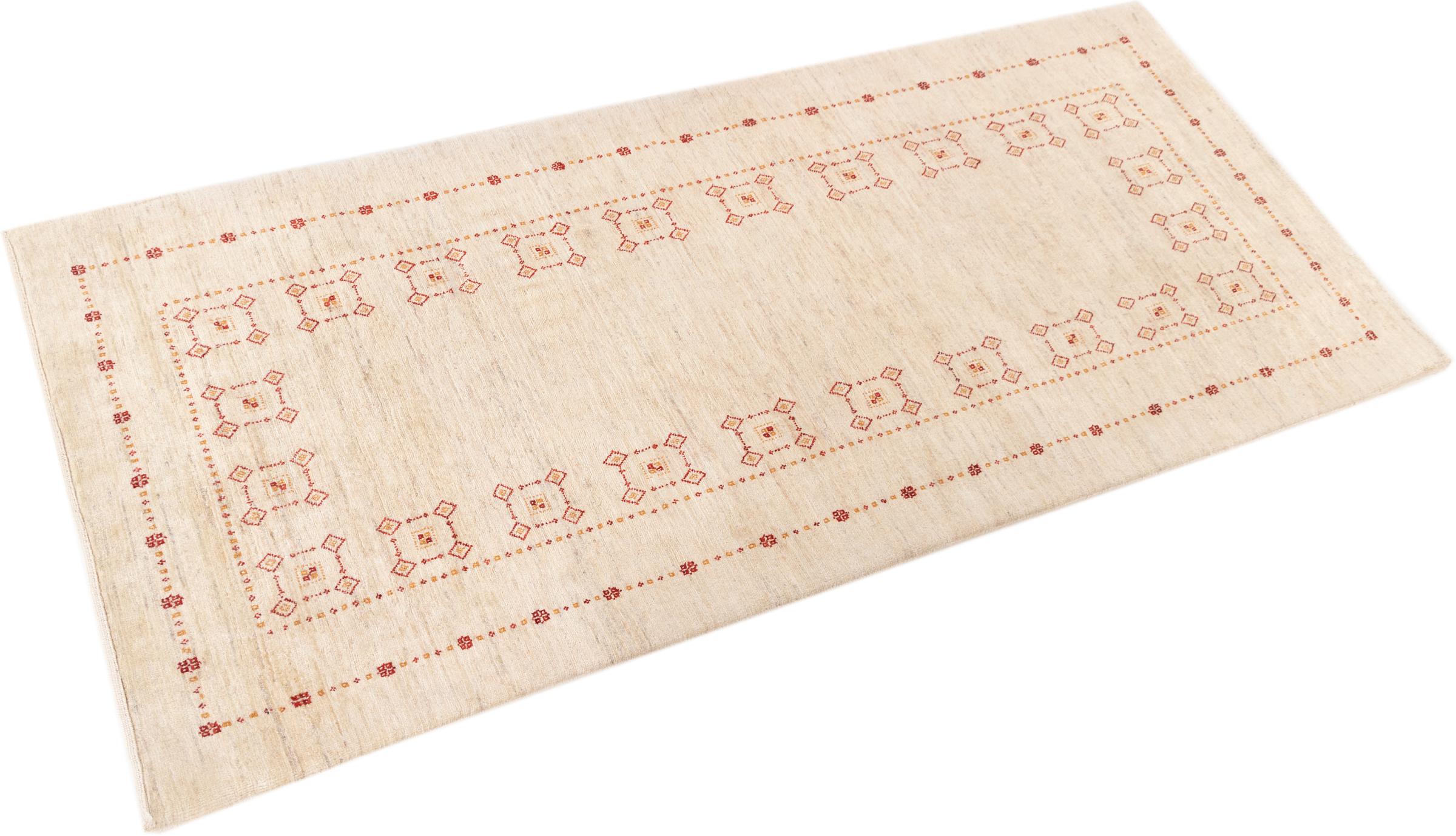 Esta hermosa alfombra es una Gabbeh persa y por lo tanto pertenece a las alfombras Gabbeh de mayor calidad. Las alfombras son anudadas por nómadas o seminómadas en Irán según la artesanía tradicional. Los motivos y patrones simples están inspirados en su mayoría por el entorno inmediato de los nómadas. Por ejemplo, los camellos, árboles o arbustos se pueden encontrar en las alfombras tradicionales. Las alfombras gabbeh persas están hechas de lana de rebaños de ovejas criados localmente. Por lo tanto, la lana se sigue hilando a mano. Así, cada una de estas alfombras orientales encarna un carácter único de la cultura de siglos de antigüedad.