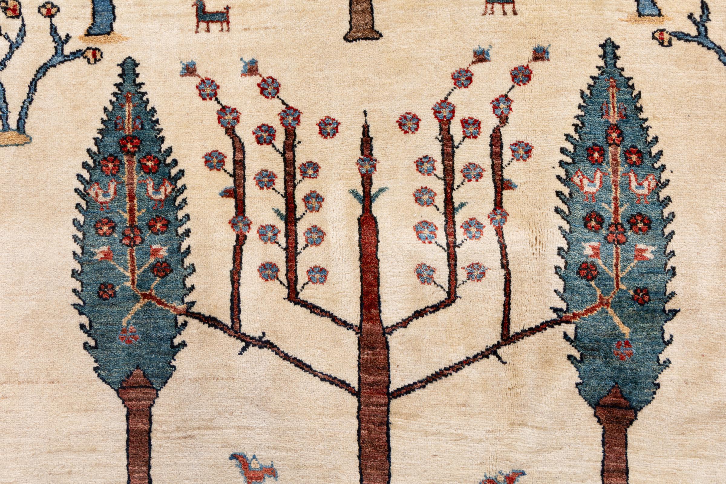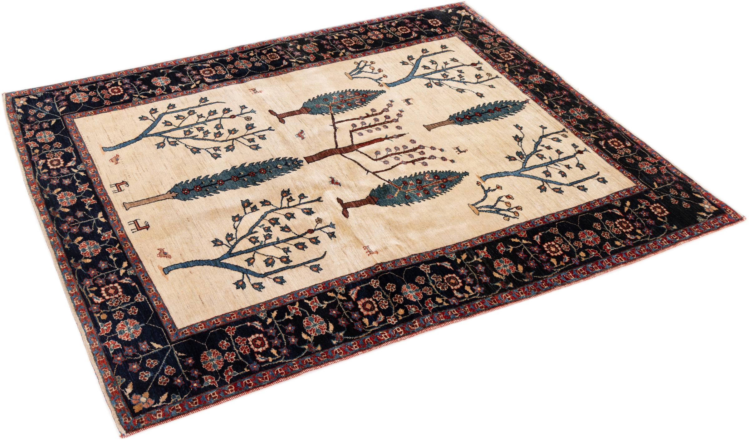 Esta hermosa alfombra es una Gabbeh persa y por lo tanto pertenece a las alfombras Gabbeh de mayor calidad. Las alfombras son anudadas por nómadas o seminómadas en Irán según la artesanía tradicional. Los motivos y patrones simples están inspirados en su mayoría por el entorno inmediato de los nómadas. Por ejemplo, los camellos, árboles o arbustos se pueden encontrar en las alfombras tradicionales. Las alfombras gabbeh persas están hechas de lana de rebaños de ovejas criados localmente. Por lo tanto, la lana se sigue hilando a mano. Así, cada una de estas alfombras orientales encarna un carácter único de la cultura de siglos de antigüedad.
