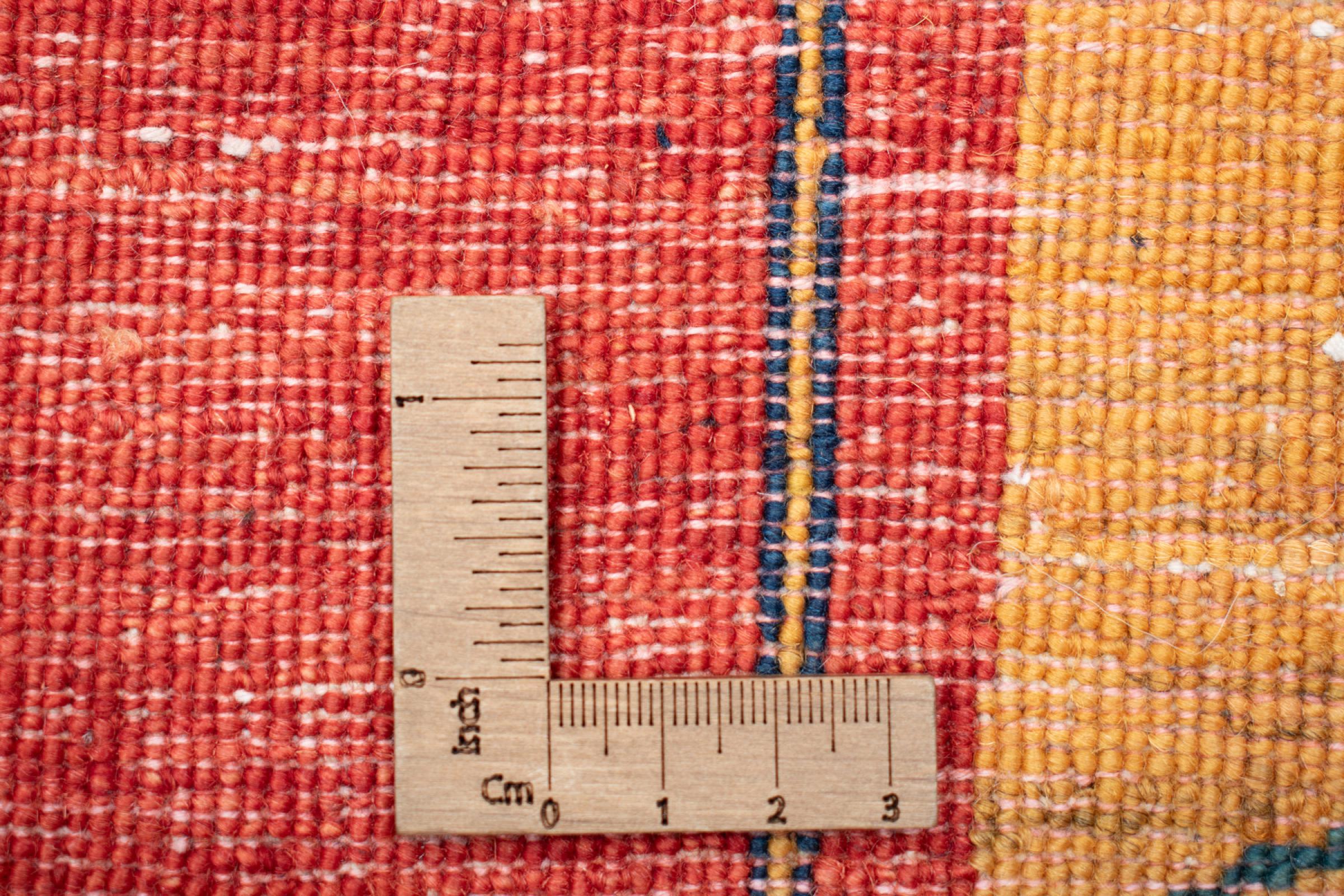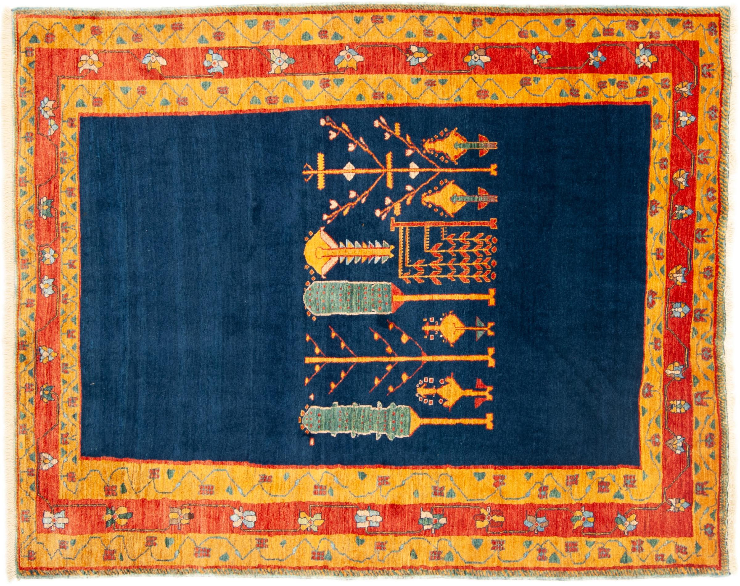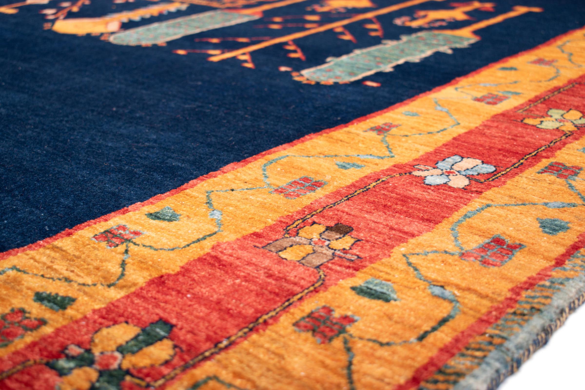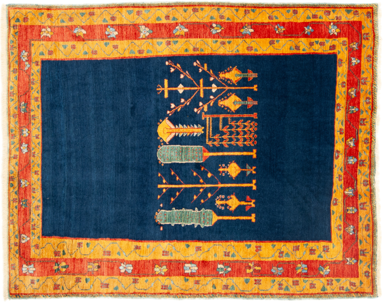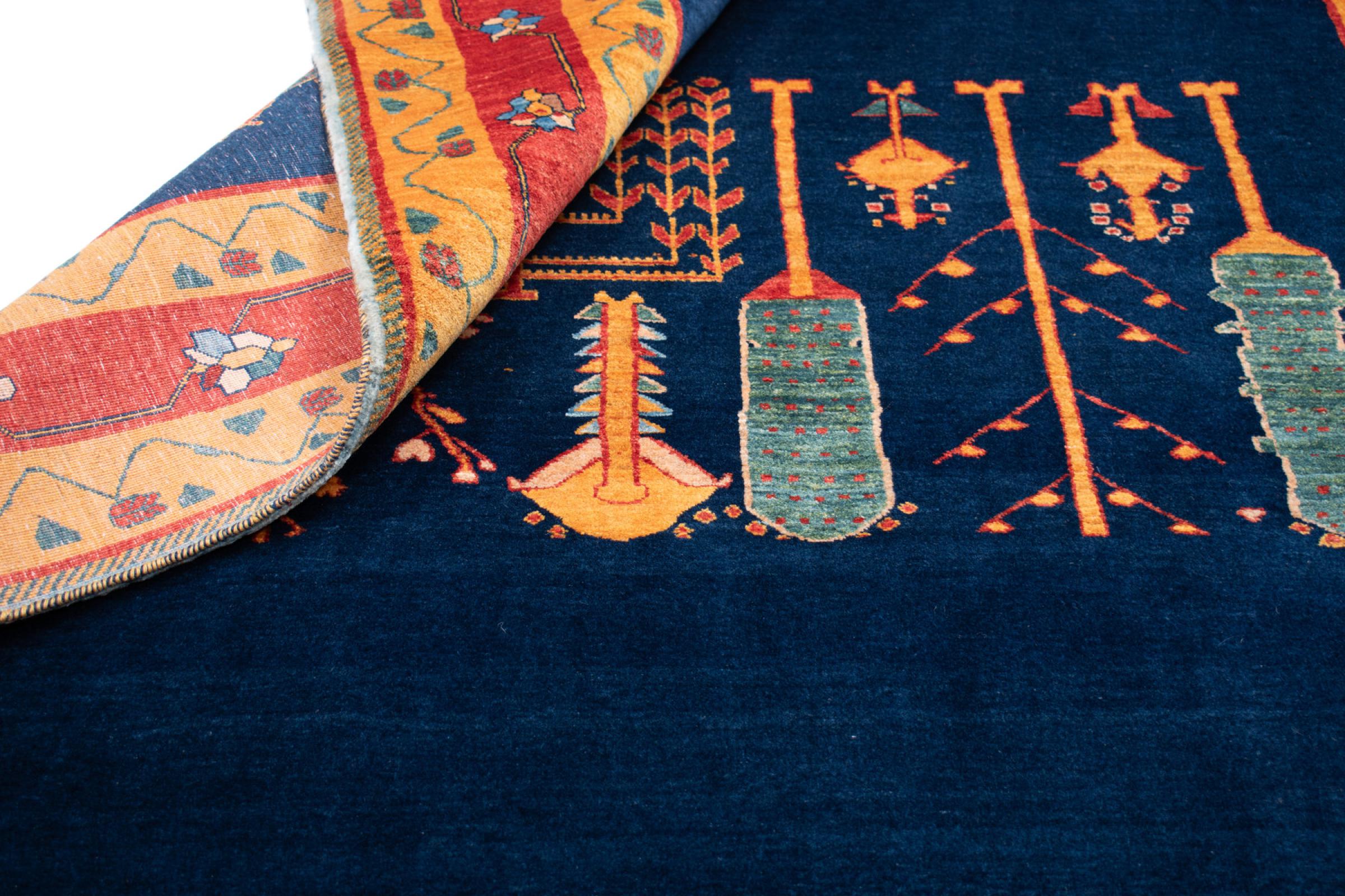 Esta hermosa alfombra es una Gabbeh persa y por lo tanto pertenece a las alfombras Gabbeh de mayor calidad. Las alfombras son anudadas por nómadas o seminómadas en Irán según la artesanía tradicional. Los motivos y patrones simples están inspirados en su mayoría por el entorno inmediato de los nómadas. Por ejemplo, los camellos, árboles o arbustos se pueden encontrar en las alfombras tradicionales. Las alfombras gabbeh persas están hechas de lana de rebaños de ovejas criados localmente. Por lo tanto, la lana se sigue hilando a mano. Así, cada una de estas alfombras orientales encarna un carácter único de la cultura de siglos de antigüedad.