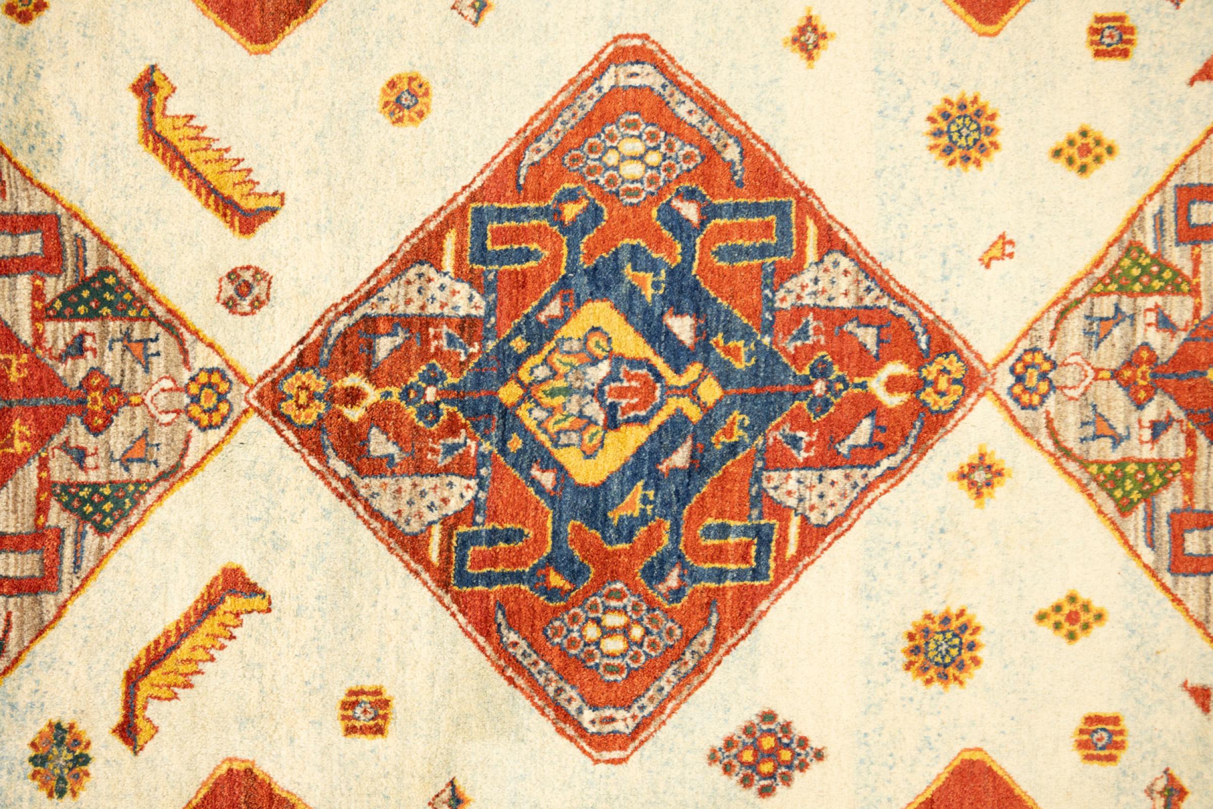 Esta alfombra está hecha de lana de oveja hilada a mano de la más alta calidad. Especialmente en Irán (antigua Persia), la lana de Afganistán y Pakistán sigue siendo hilada a mano antes de que comience el anudado de la alfombra. La lana ha demostrado ser un material natural y extremadamente resistente a lo largo de los siglos. Entre otras cosas, tiene propiedades repelentes de la suciedad y aislantes del calor. Al mismo tiempo, la lana es incomparablemente suave y tiene un brillo natural.