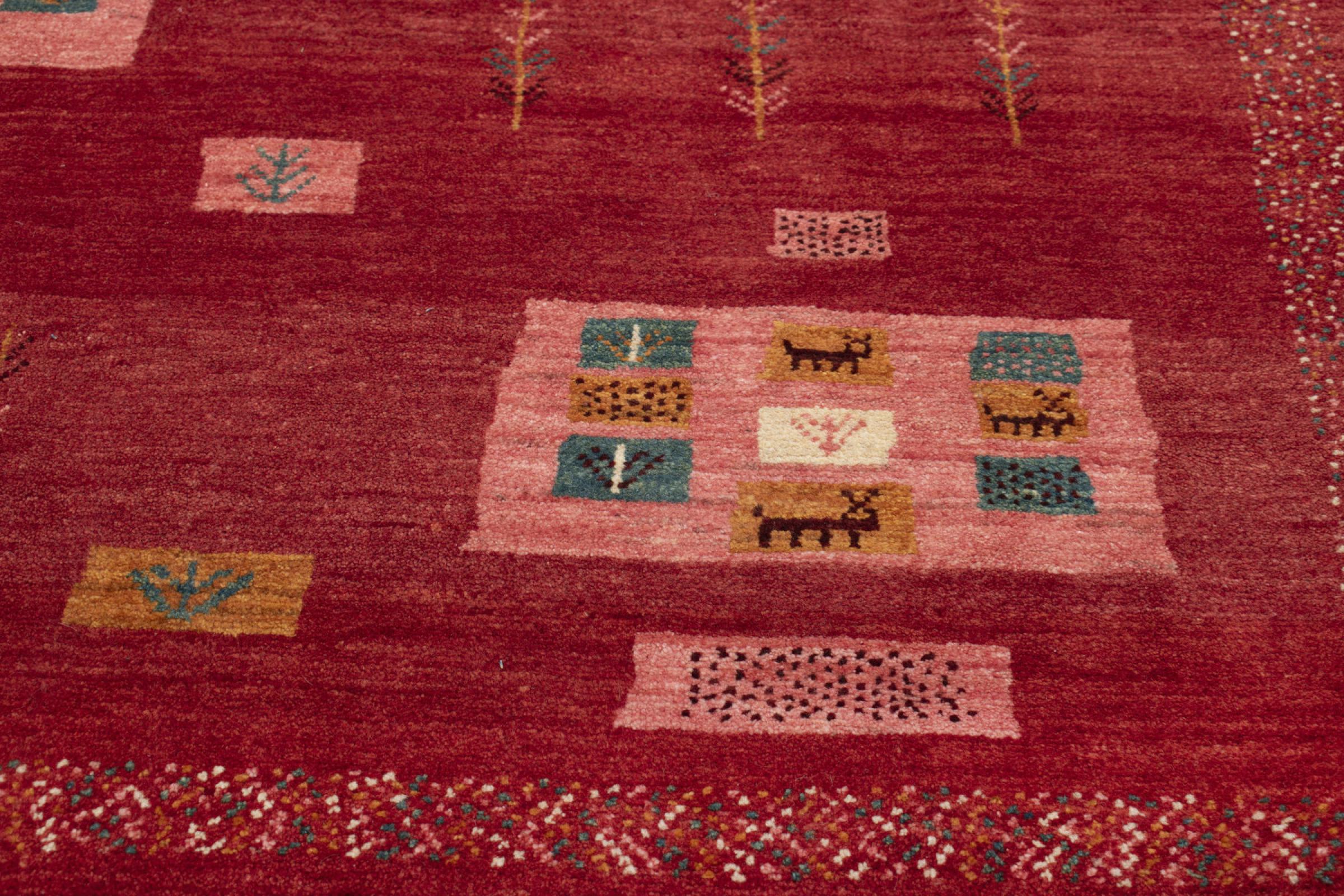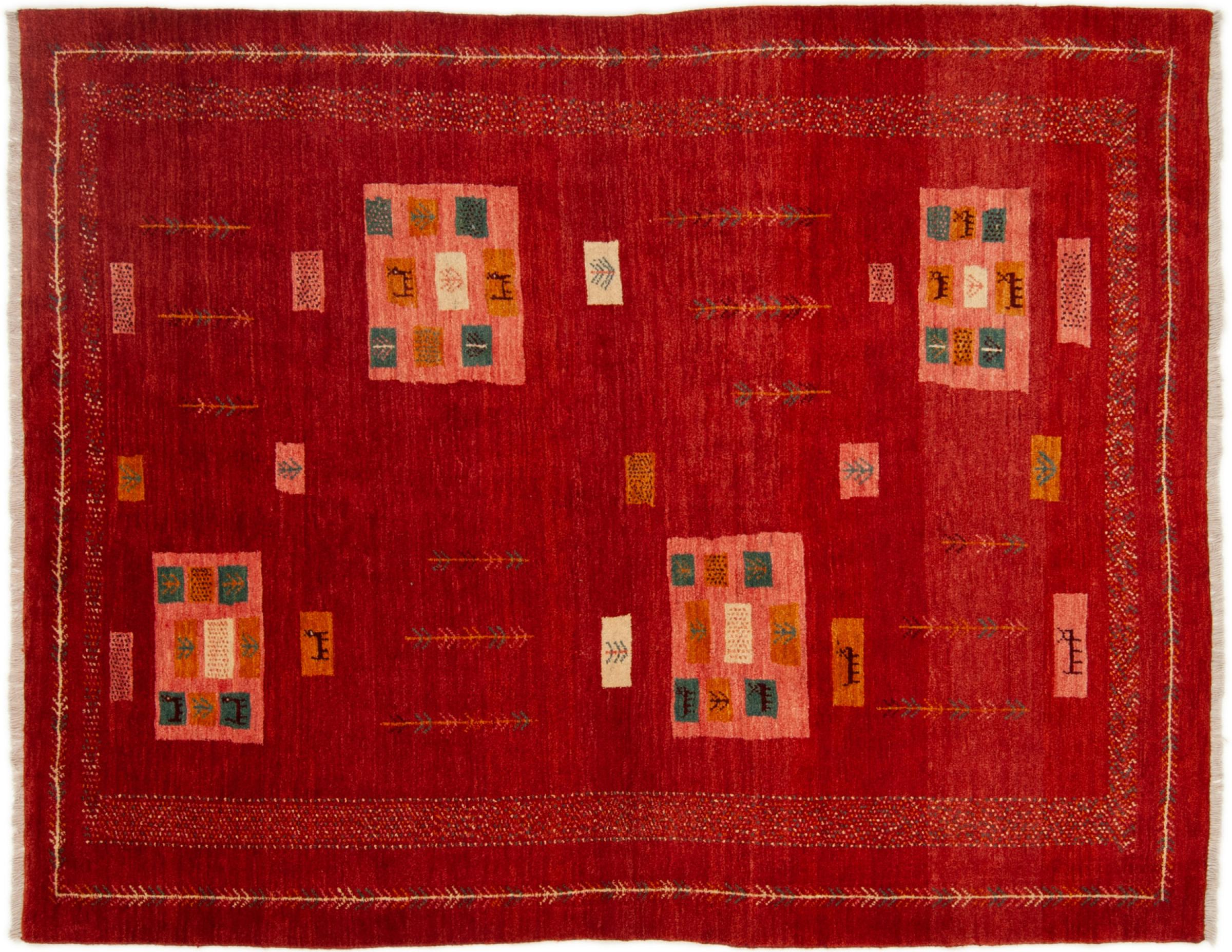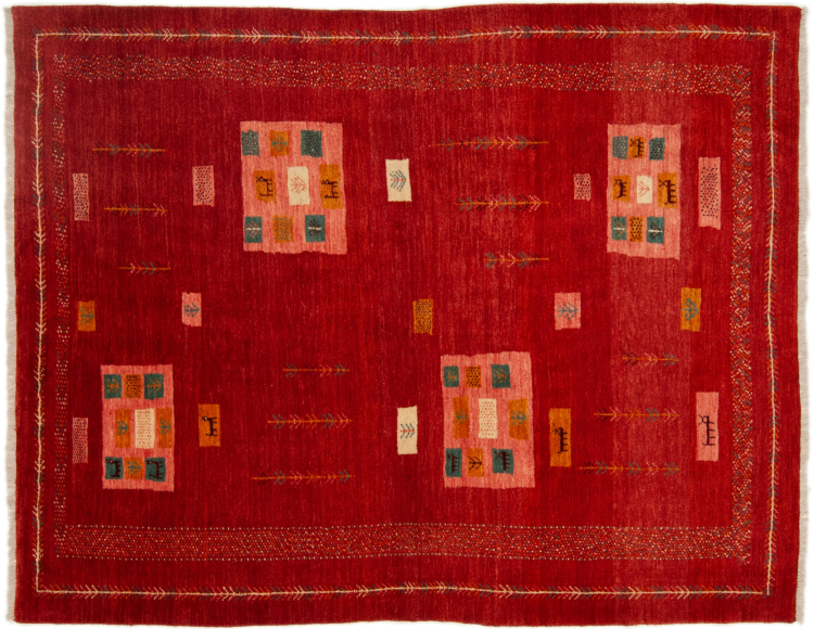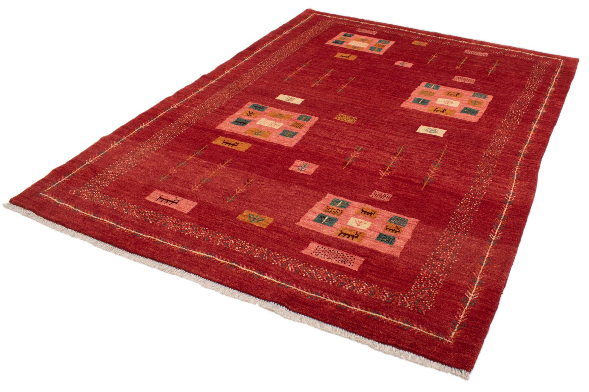 Esta hermosa alfombra es una Gabbeh persa y por lo tanto pertenece a las alfombras Gabbeh de mayor calidad. Las alfombras son anudadas por nómadas o seminómadas en Irán según la artesanía tradicional. Los motivos y patrones simples están inspirados en su mayoría por el entorno inmediato de los nómadas. Por ejemplo, los camellos, árboles o arbustos se pueden encontrar en las alfombras tradicionales. Las alfombras gabbeh persas están hechas de lana de rebaños de ovejas criados localmente. Por lo tanto, la lana se sigue hilando a mano. Así, cada una de estas alfombras orientales encarna un carácter único de la cultura de siglos de antigüedad.