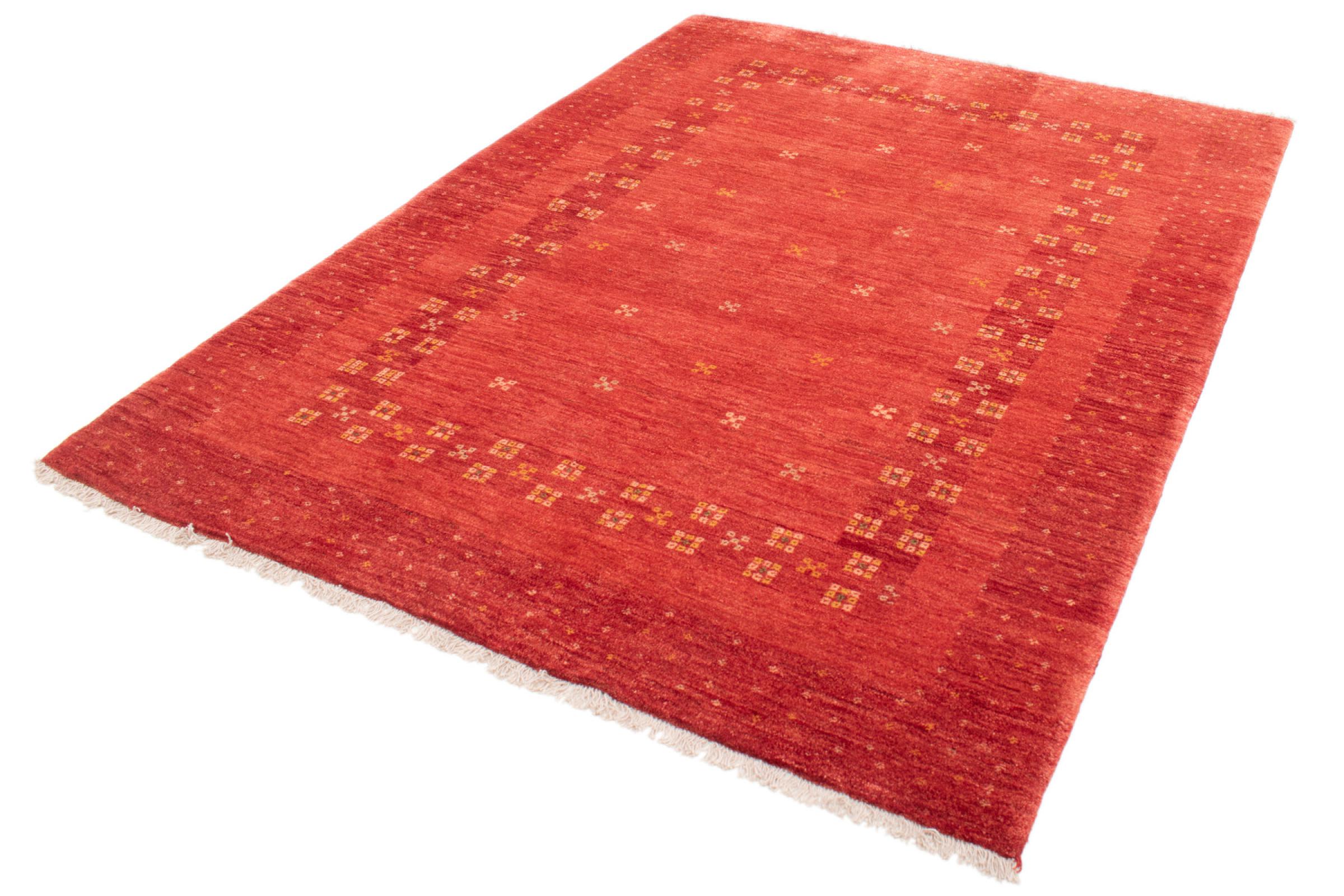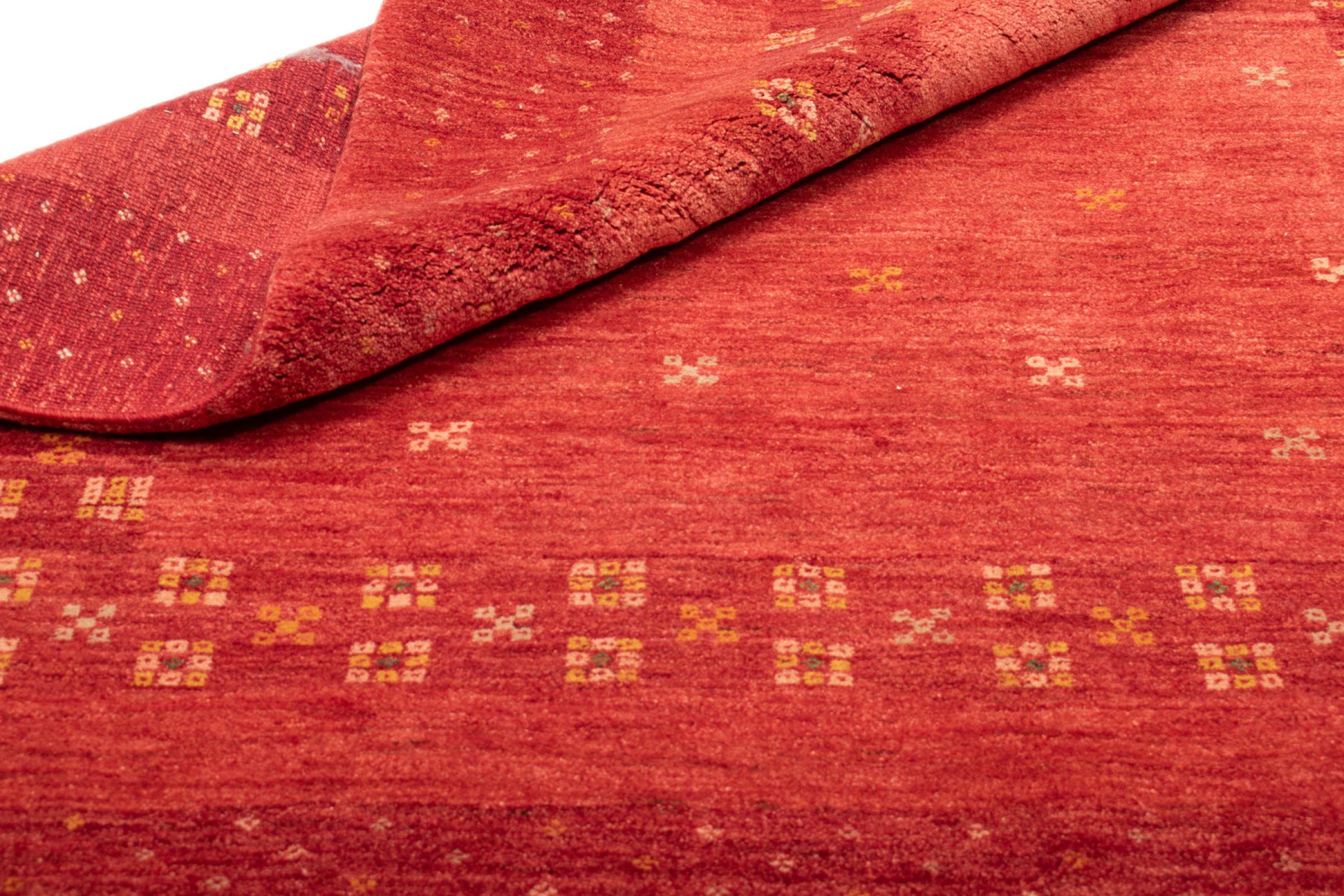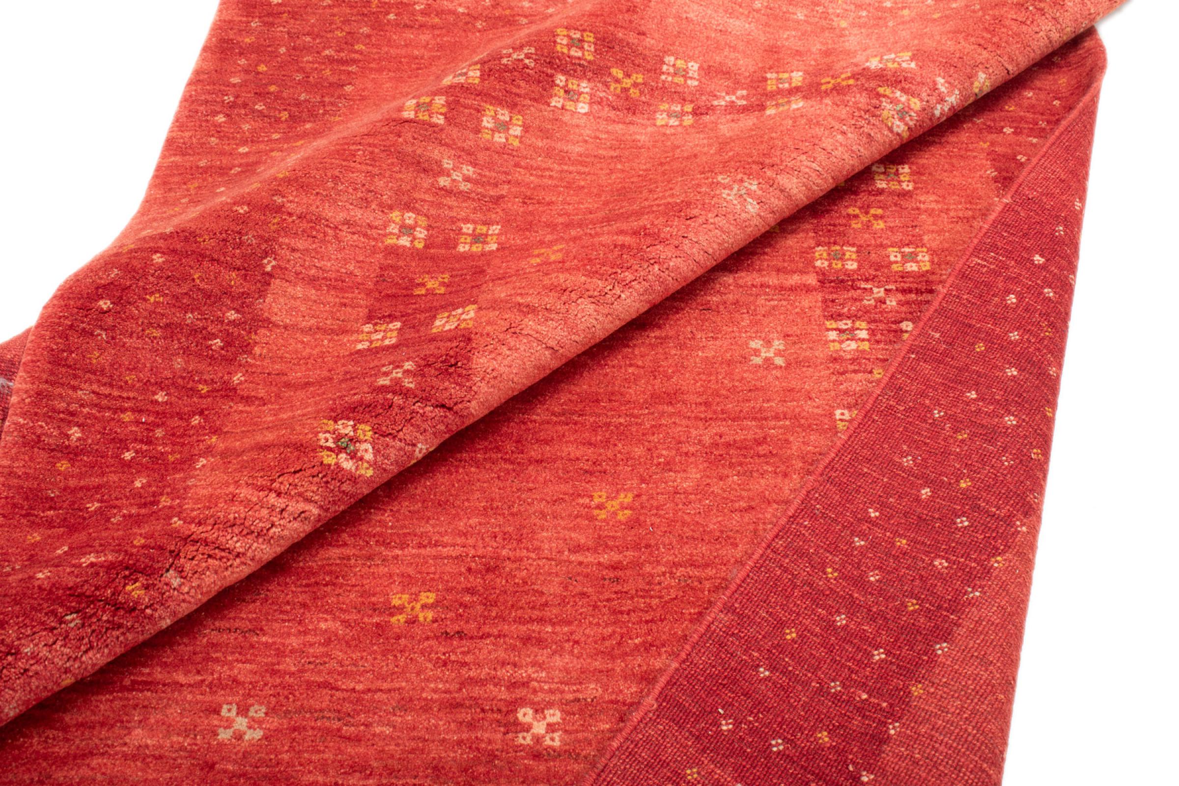 Esta hermosa alfombra es una Gabbeh persa y por lo tanto pertenece a las alfombras Gabbeh de mayor calidad. Las alfombras son anudadas por nómadas o seminómadas en Irán según la artesanía tradicional. Los motivos y patrones simples están inspirados en su mayoría por el entorno inmediato de los nómadas. Por ejemplo, los camellos, árboles o arbustos se pueden encontrar en las alfombras tradicionales. Las alfombras gabbeh persas están hechas de lana de rebaños de ovejas criados localmente. Por lo tanto, la lana se sigue hilando a mano. Así, cada una de estas alfombras orientales encarna un carácter único de la cultura de siglos de antigüedad.
