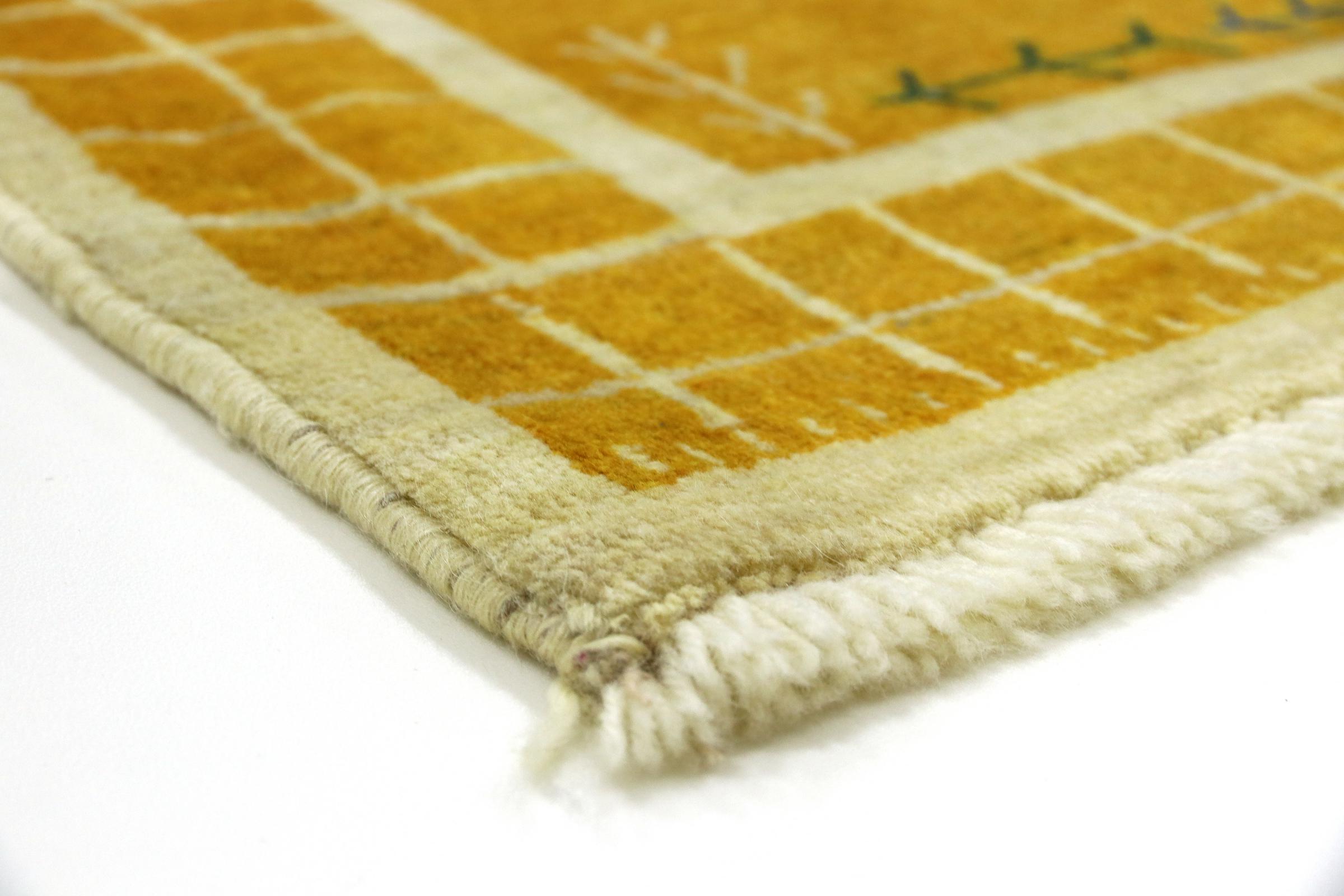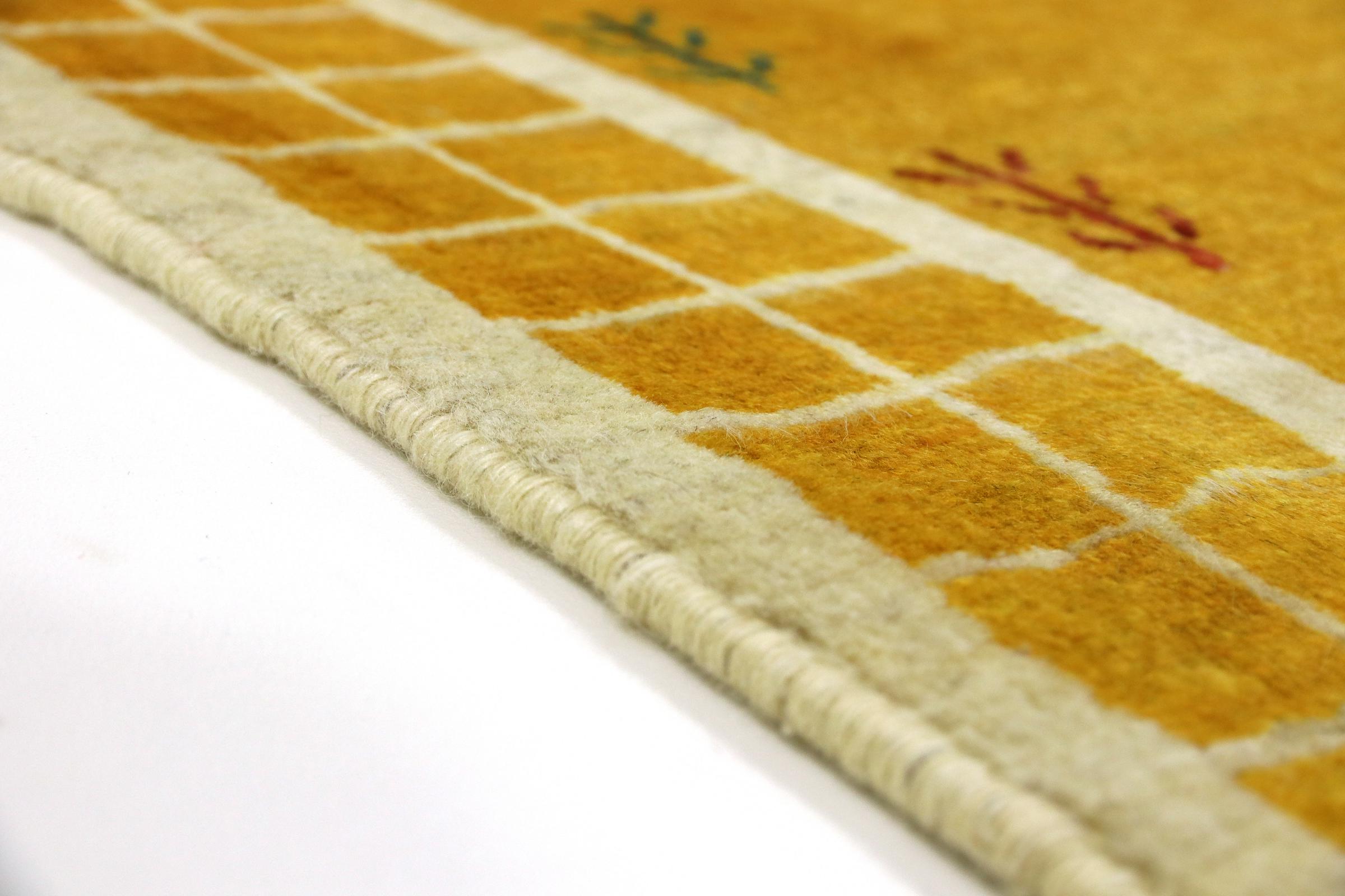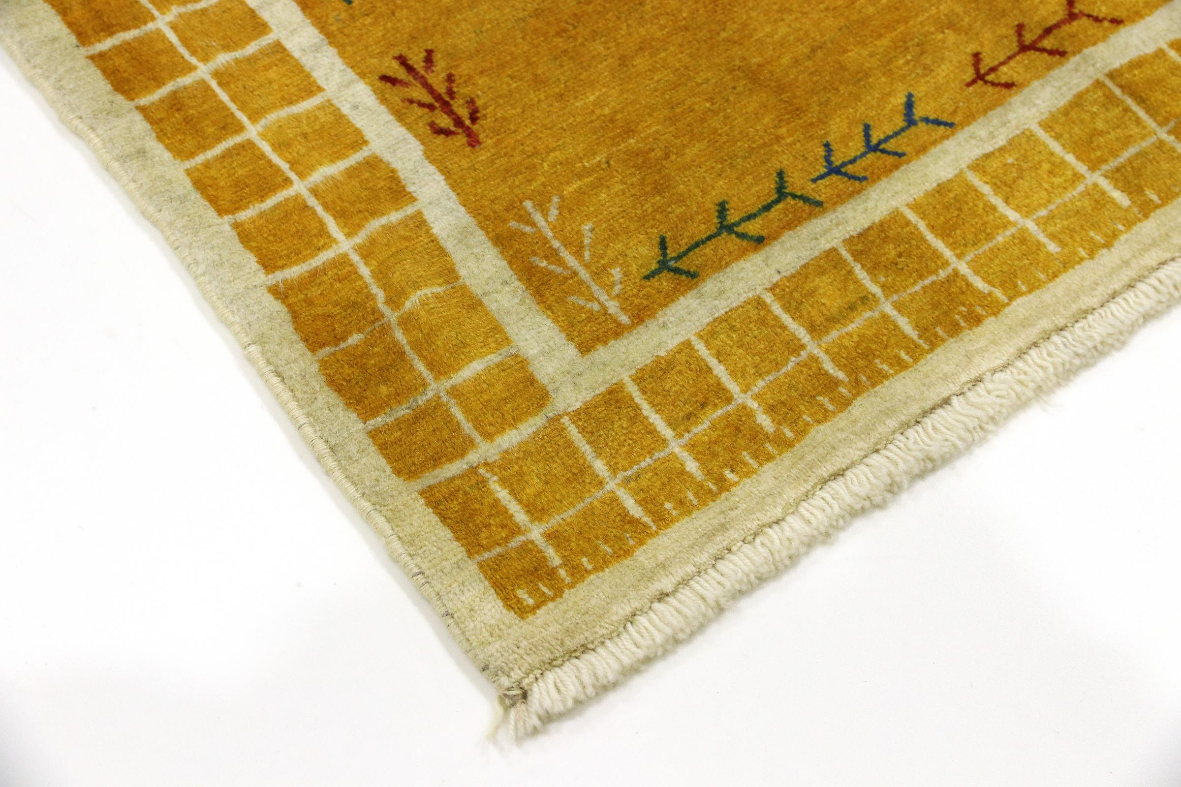 Esta hermosa alfombra es una Gabbeh persa y por lo tanto pertenece a las alfombras Gabbeh de mayor calidad. Las alfombras son anudadas por nómadas o seminómadas en Irán según la artesanía tradicional. Los motivos y patrones simples están inspirados en su mayoría por el entorno inmediato de los nómadas. Por ejemplo, los camellos, árboles o arbustos se pueden encontrar en las alfombras tradicionales. Las alfombras gabbeh persas están hechas de lana de rebaños de ovejas criados localmente. Por lo tanto, la lana se sigue hilando a mano. Así, cada una de estas alfombras orientales encarna un carácter único de la cultura de siglos de antigüedad.