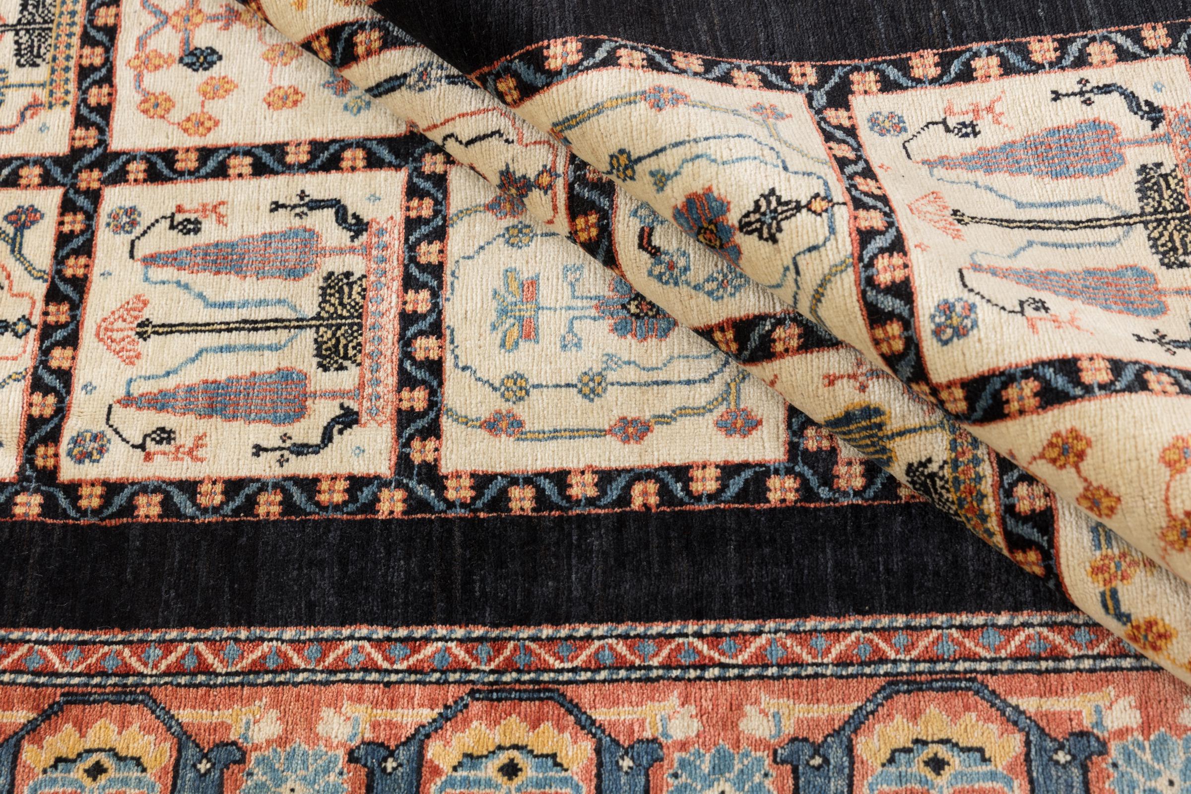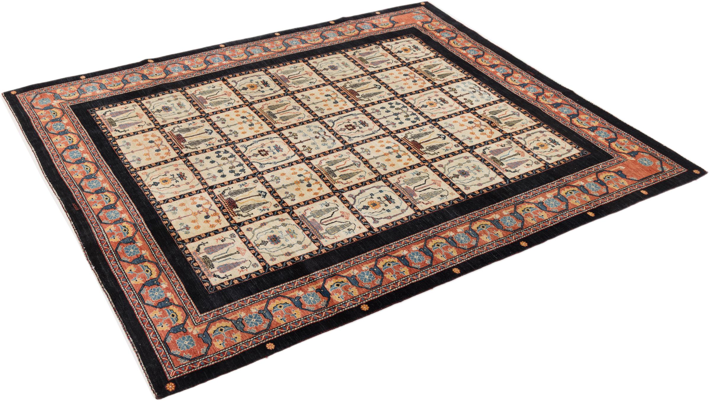 Esta hermosa alfombra es una Gabbeh persa y por lo tanto pertenece a las alfombras Gabbeh de mayor calidad. Las alfombras son anudadas por nómadas o seminómadas en Irán según la artesanía tradicional. Los motivos y patrones simples están inspirados en su mayoría por el entorno inmediato de los nómadas. Por ejemplo, los camellos, árboles o arbustos se pueden encontrar en las alfombras tradicionales. Las alfombras gabbeh persas están hechas de lana de rebaños de ovejas criados localmente. Por lo tanto, la lana se sigue hilando a mano. Así, cada una de estas alfombras orientales encarna un carácter único de la cultura de siglos de antigüedad.