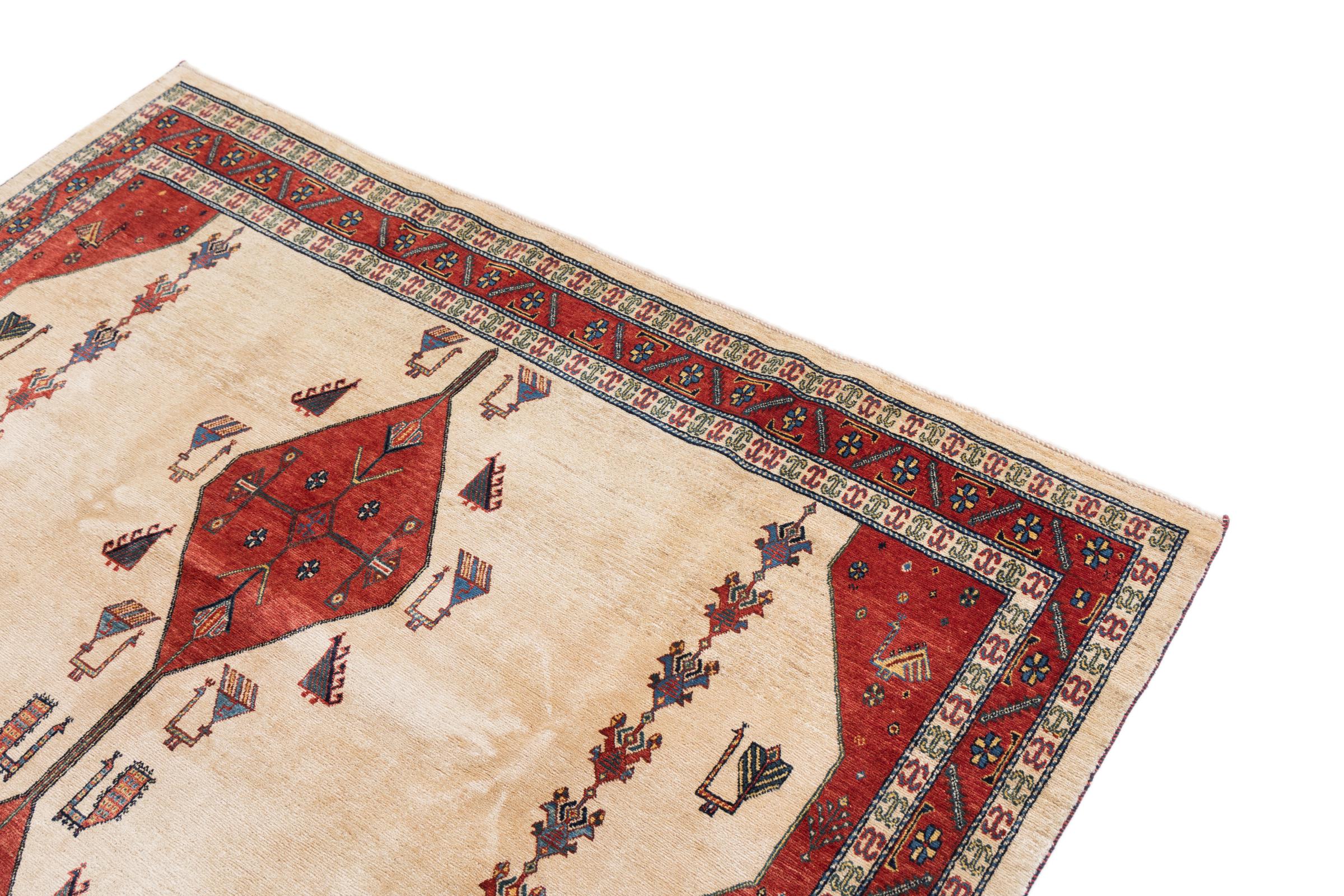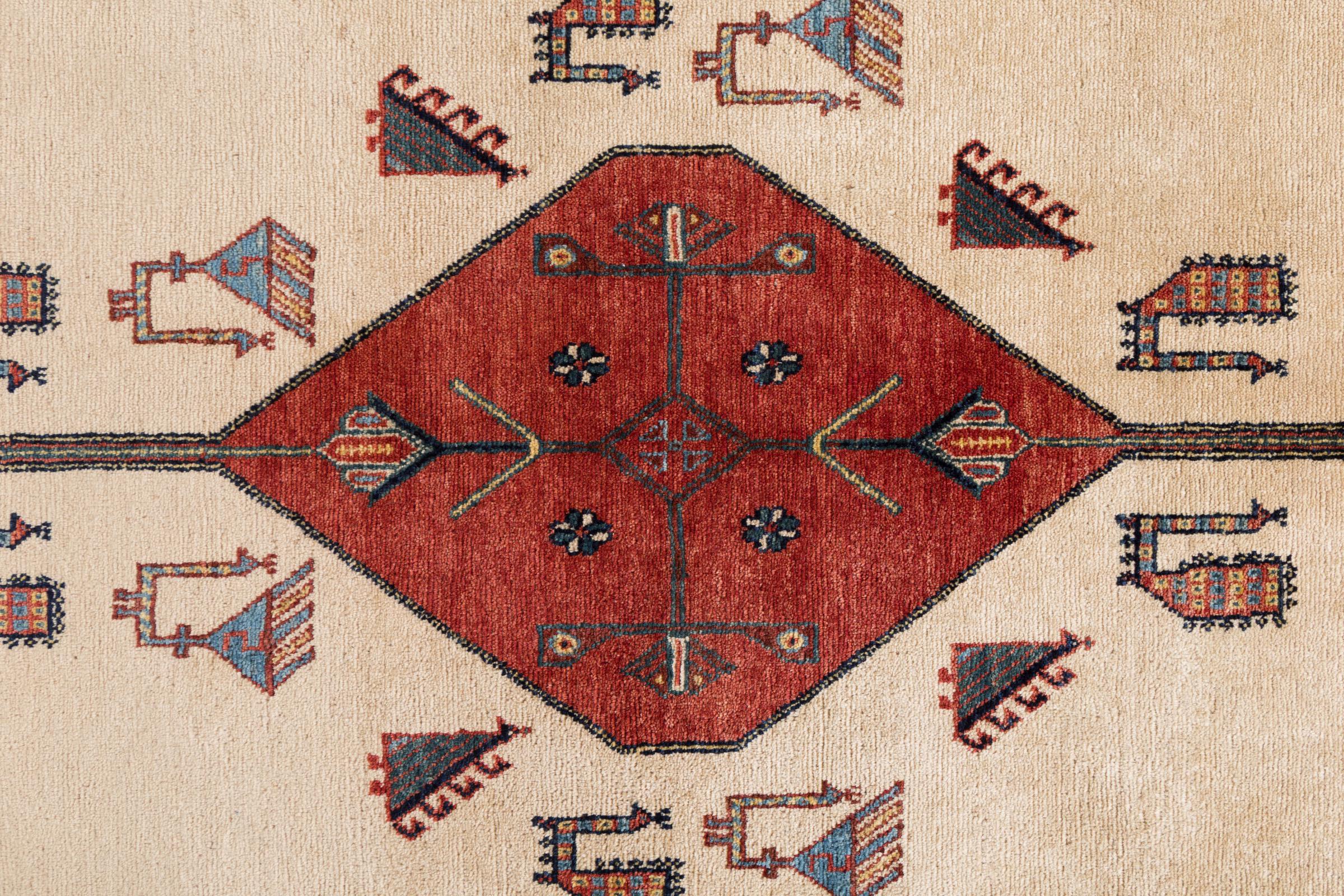 Esta hermosa alfombra es una Gabbeh persa y por lo tanto pertenece a las alfombras Gabbeh de mayor calidad. Las alfombras son anudadas por nómadas o seminómadas en Irán según la artesanía tradicional. Los motivos y patrones simples están inspirados en su mayoría por el entorno inmediato de los nómadas. Por ejemplo, los camellos, árboles o arbustos se pueden encontrar en las alfombras tradicionales. Las alfombras gabbeh persas están hechas de lana de rebaños de ovejas criados localmente. Por lo tanto, la lana se sigue hilando a mano. Así, cada una de estas alfombras orientales encarna un carácter único de la cultura de siglos de antigüedad.