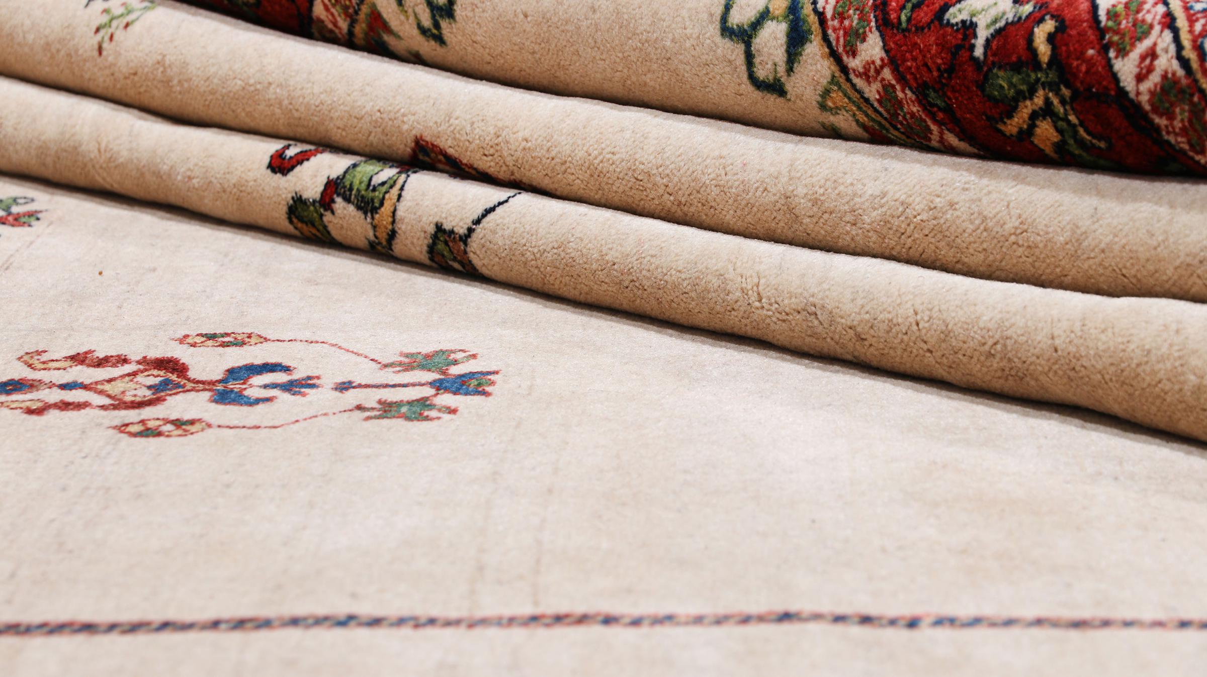Esta alfombra está hecha de lana de oveja hilada a mano de la más alta calidad. Especialmente en Irán (antigua Persia), la lana de Afganistán y Pakistán sigue siendo hilada a mano antes de que comience el anudado de la alfombra. La lana ha demostrado ser un material natural y extremadamente resistente a lo largo de los siglos. Entre otras cosas, tiene propiedades repelentes de la suciedad y aislantes del calor. Al mismo tiempo, la lana es incomparablemente suave y tiene un brillo natural.