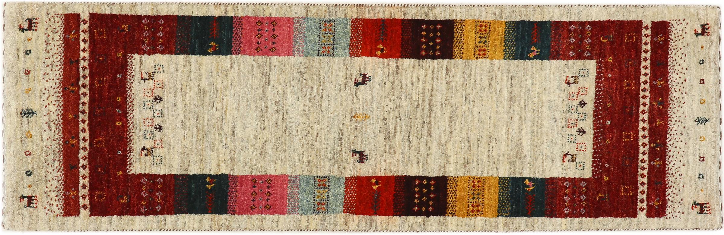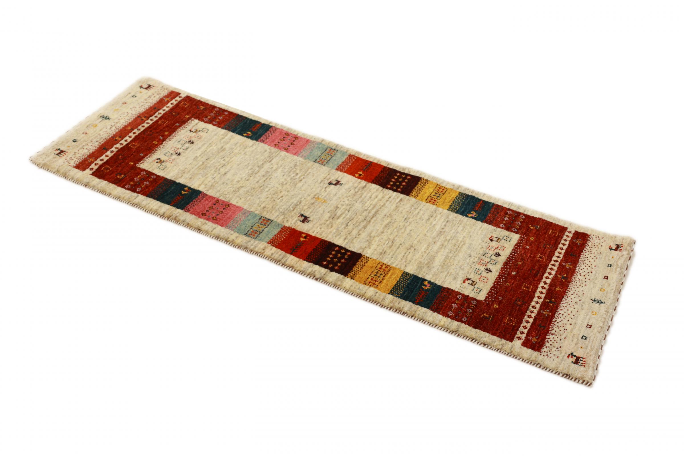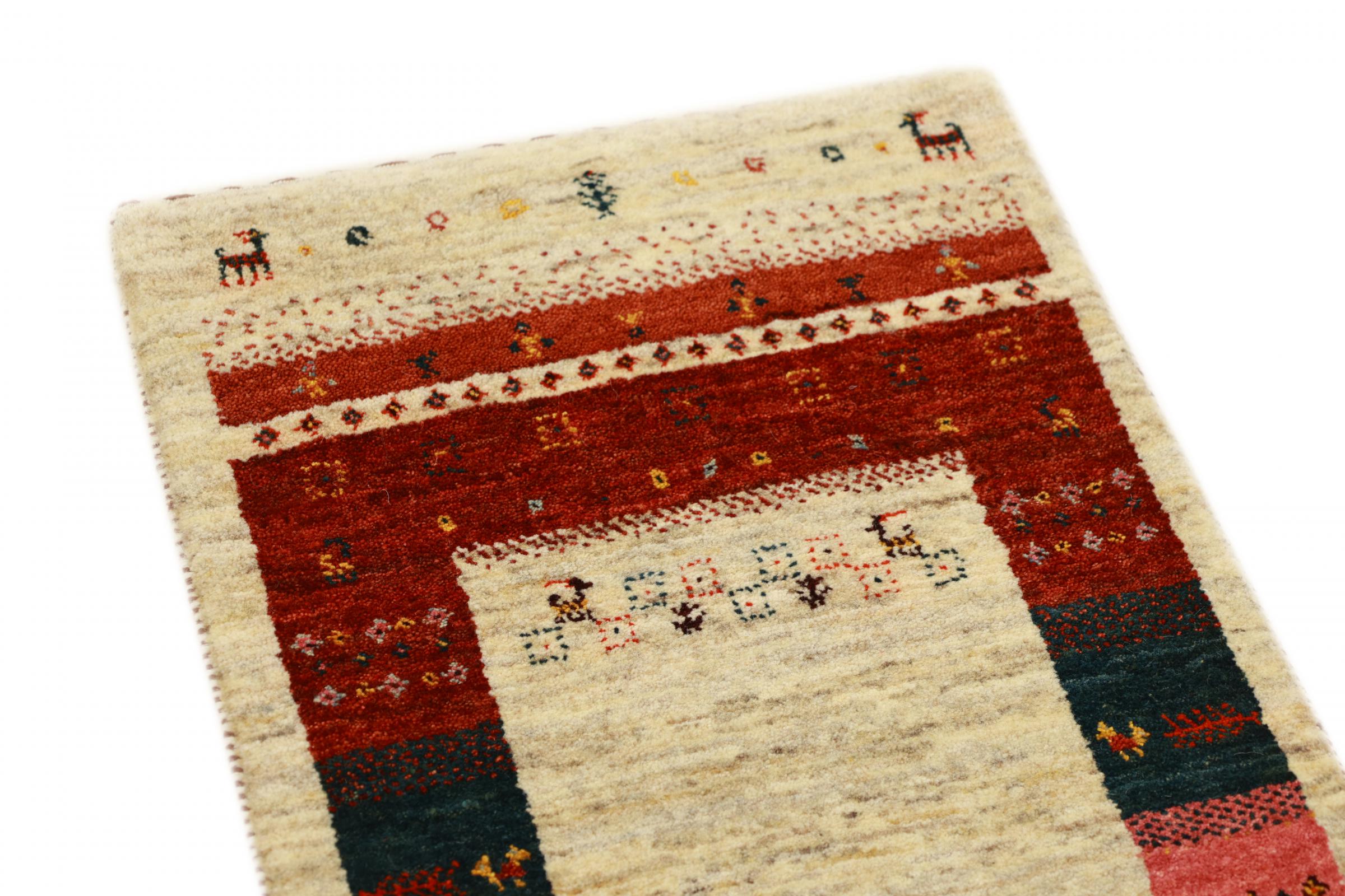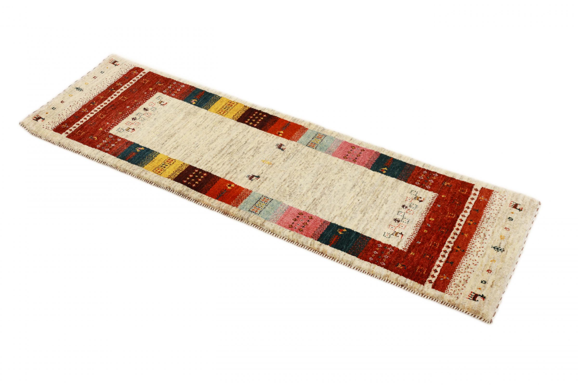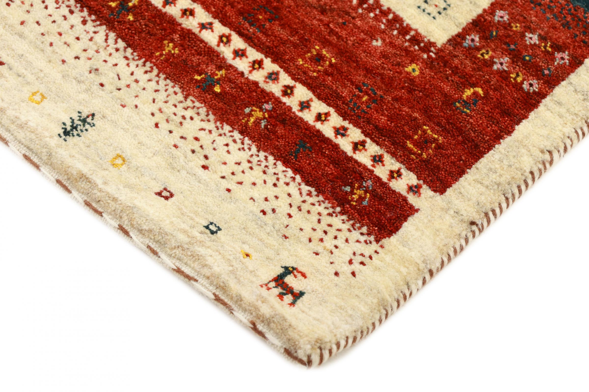 Esta hermosa alfombra es una Gabbeh persa y por lo tanto pertenece a las alfombras Gabbeh de mayor calidad. Las alfombras son anudadas por nómadas o seminómadas en Irán según la artesanía tradicional. Los motivos y patrones simples están inspirados en su mayoría por el entorno inmediato de los nómadas. Por ejemplo, los camellos, árboles o arbustos se pueden encontrar en las alfombras tradicionales. Las alfombras gabbeh persas están hechas de lana de rebaños de ovejas criados localmente. Por lo tanto, la lana se sigue hilando a mano. Así, cada una de estas alfombras orientales encarna un carácter único de la cultura de siglos de antigüedad.