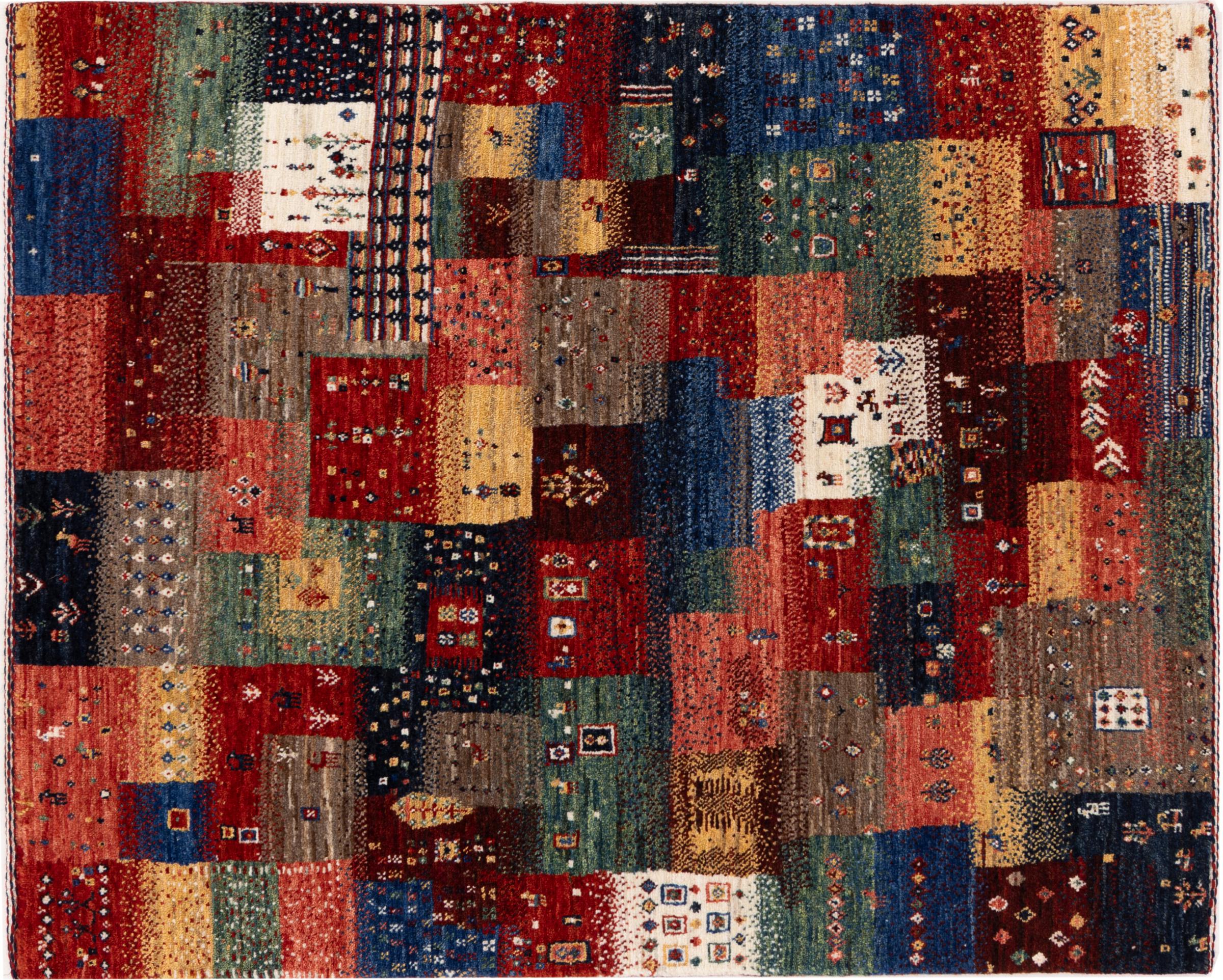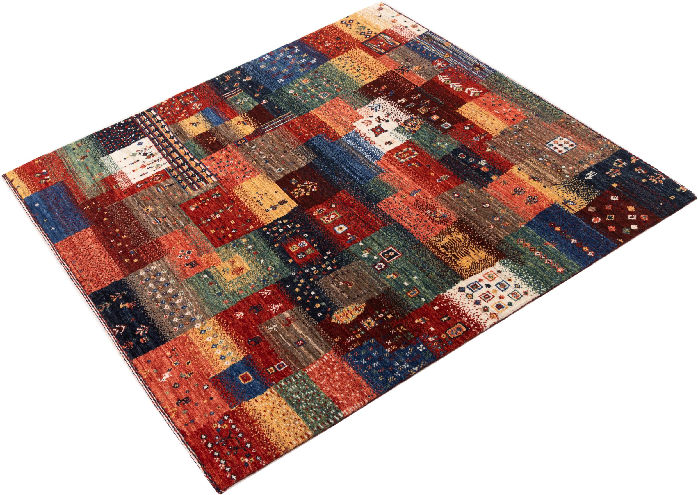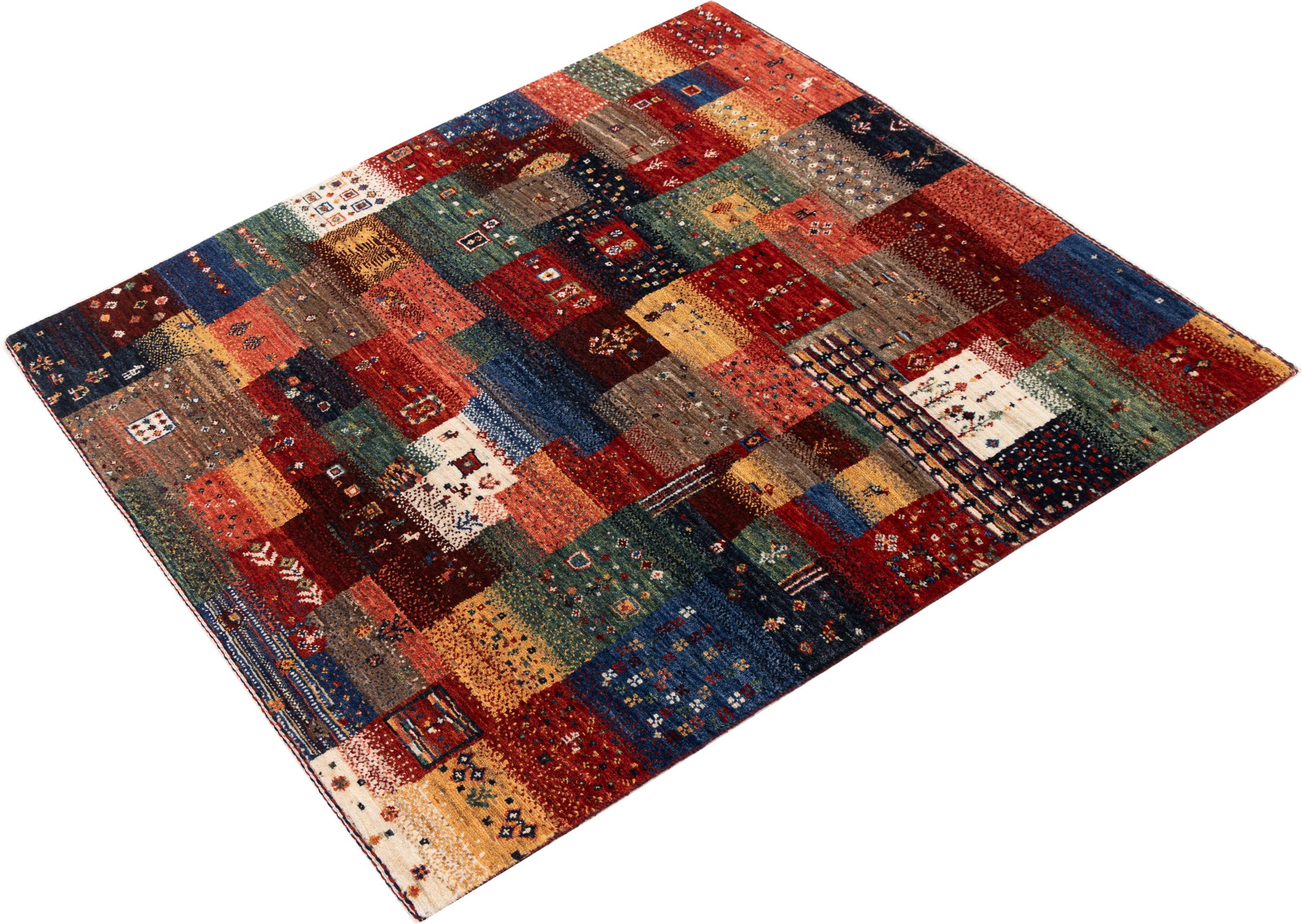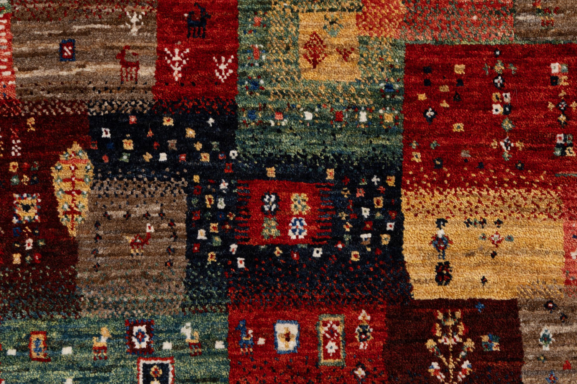 Esta hermosa alfombra es una Gabbeh persa y por lo tanto pertenece a las alfombras Gabbeh de mayor calidad. Las alfombras son anudadas por nómadas o seminómadas en Irán según la artesanía tradicional. Los motivos y patrones simples están inspirados en su mayoría por el entorno inmediato de los nómadas. Por ejemplo, los camellos, árboles o arbustos se pueden encontrar en las alfombras tradicionales. Las alfombras gabbeh persas están hechas de lana de rebaños de ovejas criados localmente. Por lo tanto, la lana se sigue hilando a mano. Así, cada una de estas alfombras orientales encarna un carácter único de la cultura de siglos de antigüedad.