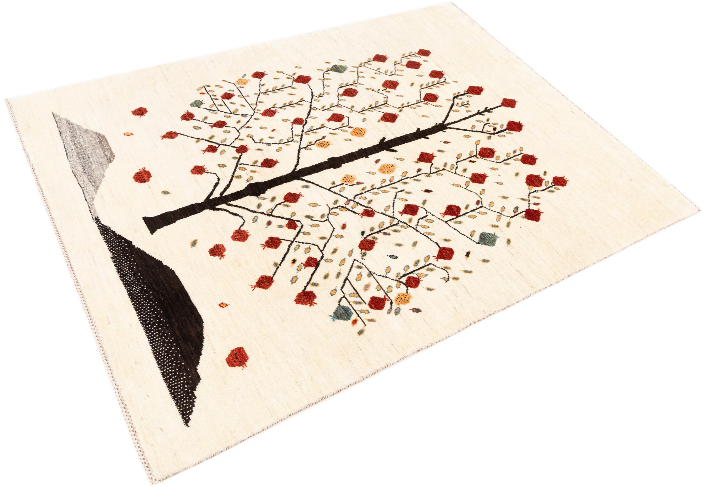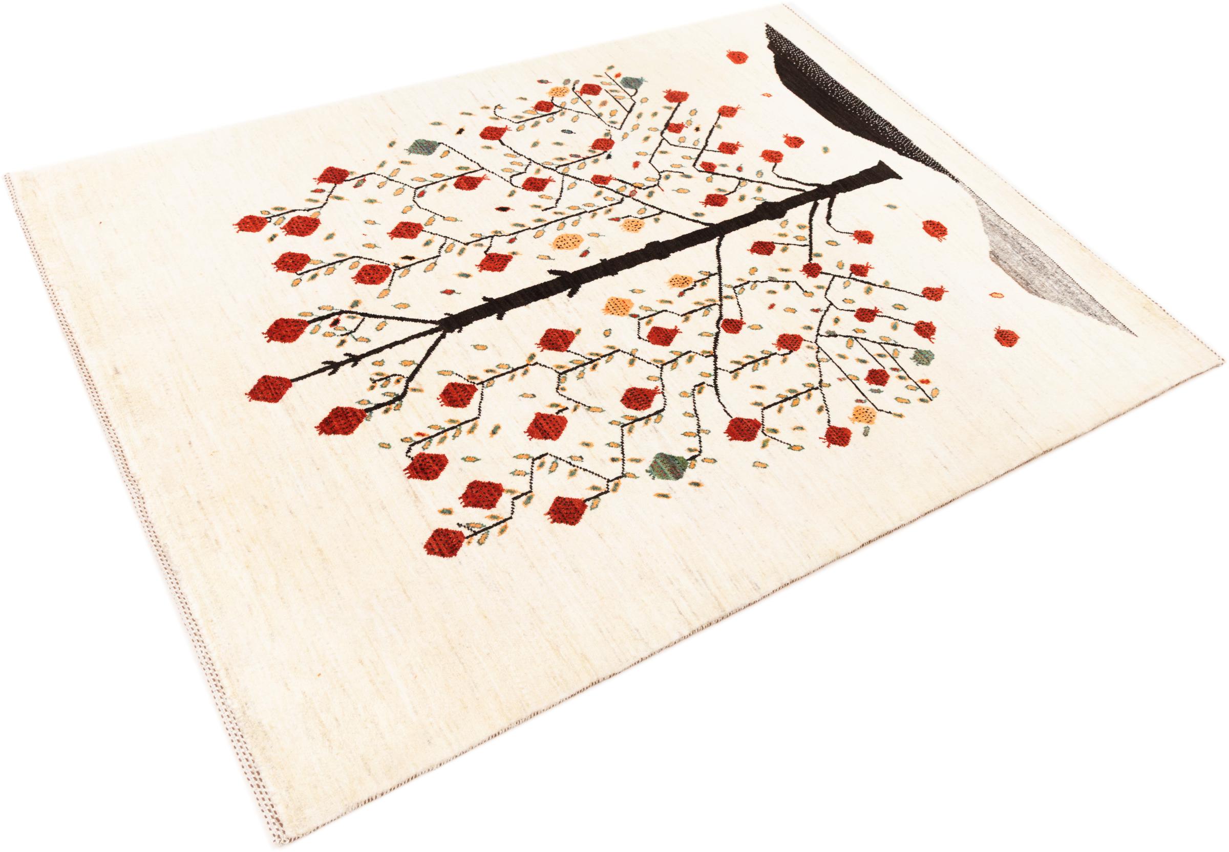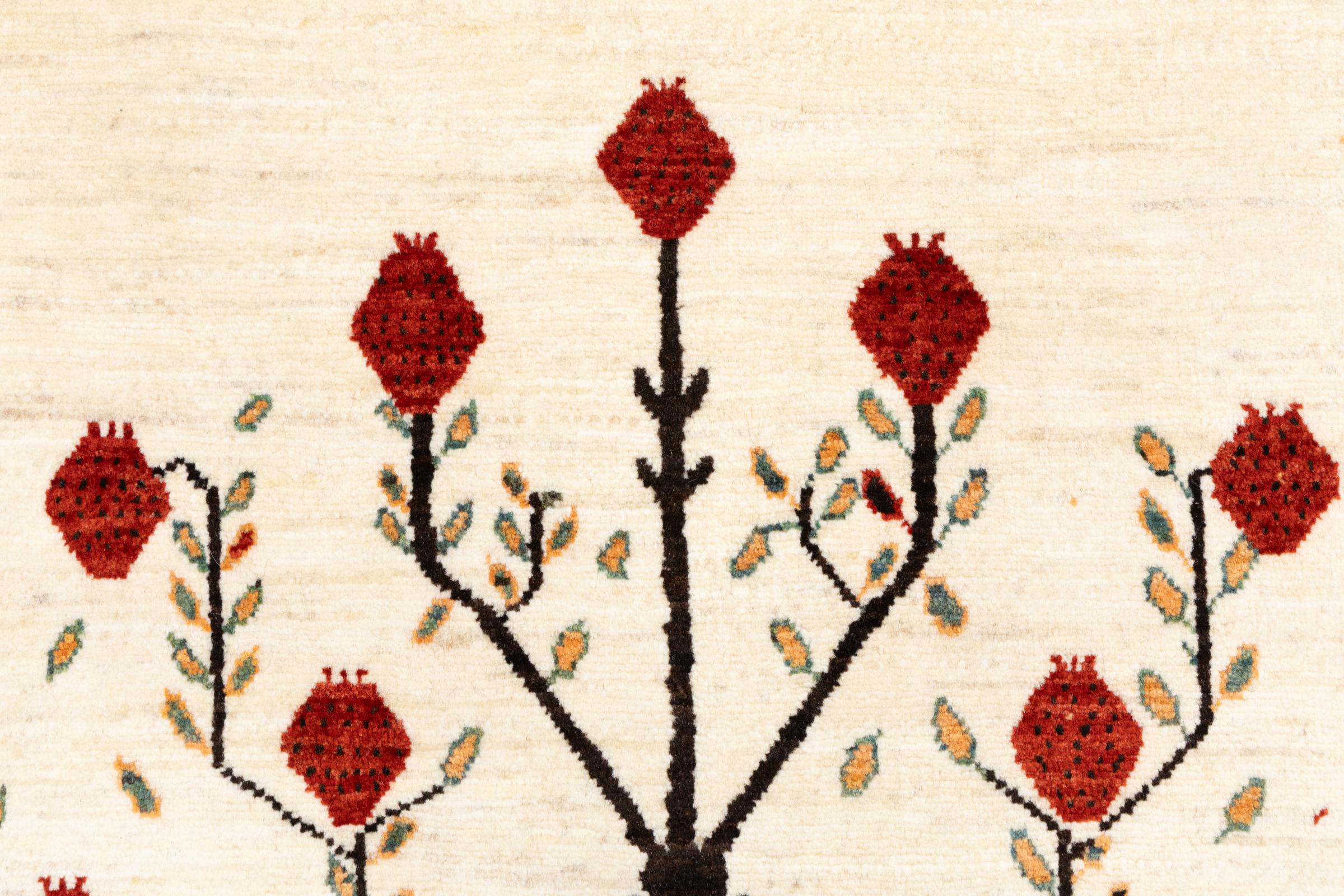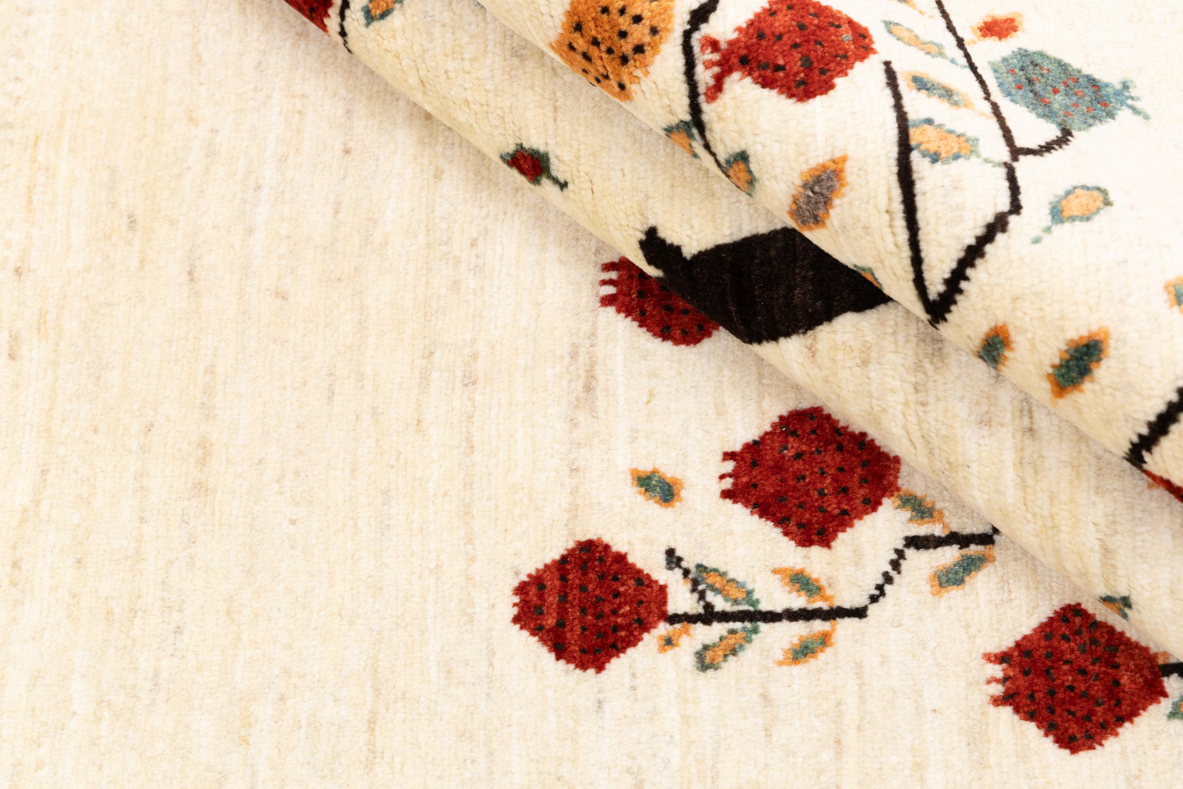Esta hermosa alfombra es una Gabbeh persa y por lo tanto pertenece a las alfombras Gabbeh de mayor calidad. Las alfombras son anudadas por nómadas o seminómadas en Irán según la artesanía tradicional. Los motivos y patrones simples están inspirados en su mayoría por el entorno inmediato de los nómadas. Por ejemplo, los camellos, árboles o arbustos se pueden encontrar en las alfombras tradicionales. Las alfombras gabbeh persas están hechas de lana de rebaños de ovejas criados localmente. Por lo tanto, la lana se sigue hilando a mano. Así, cada una de estas alfombras orientales encarna un carácter único de la cultura de siglos de antigüedad.
