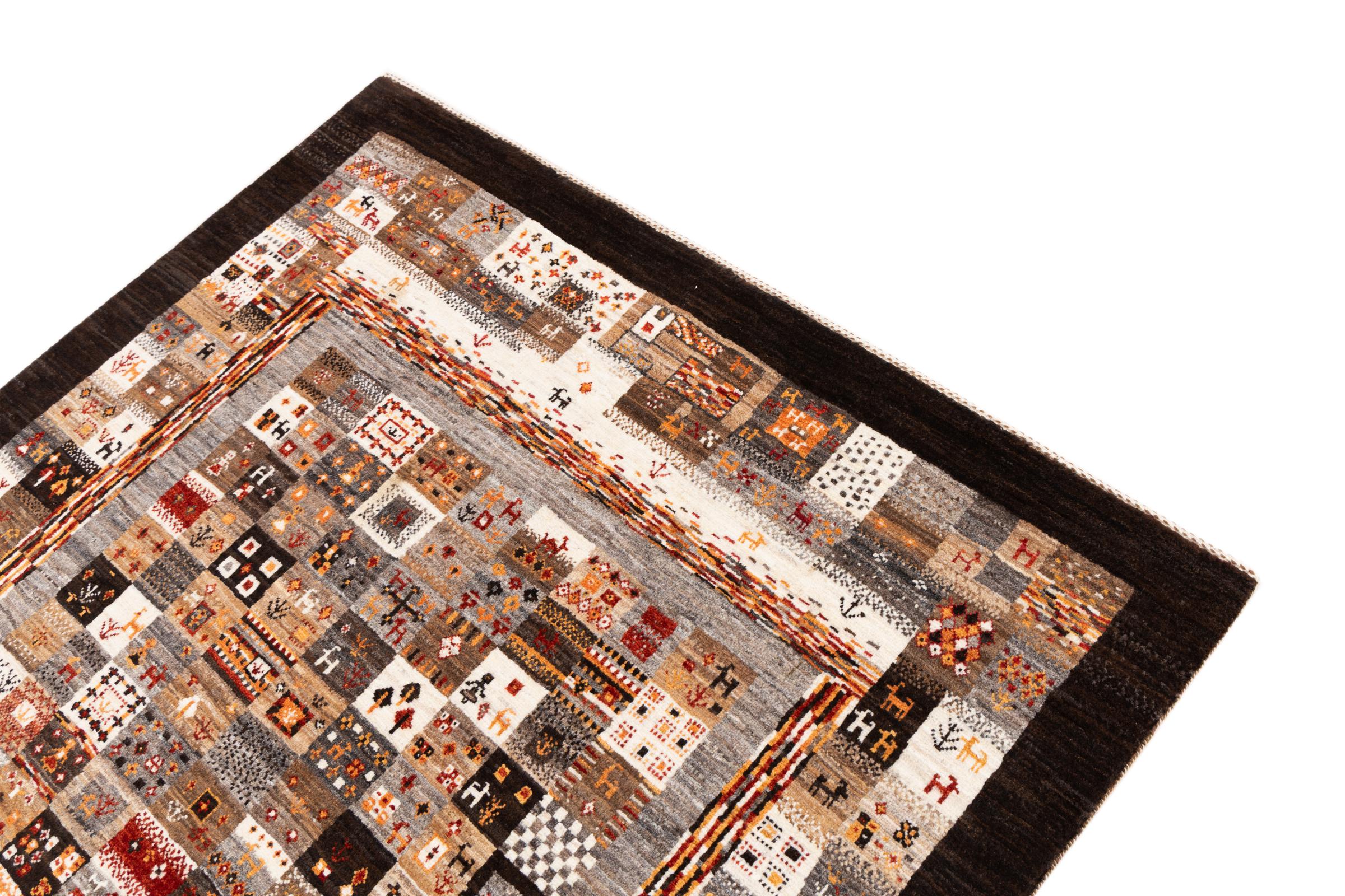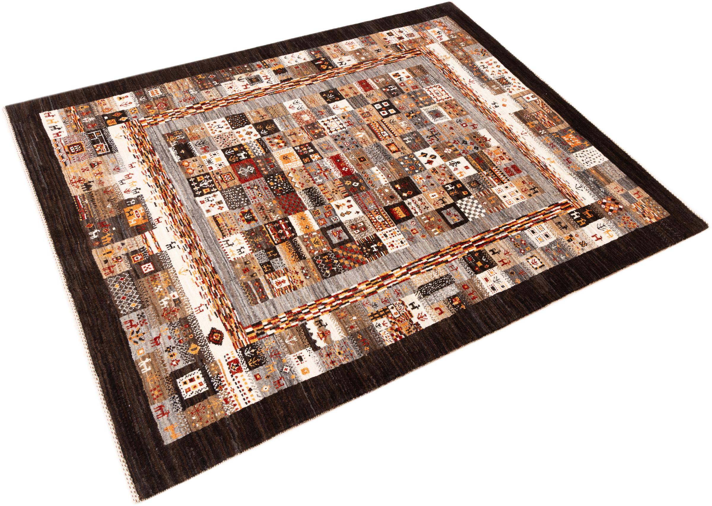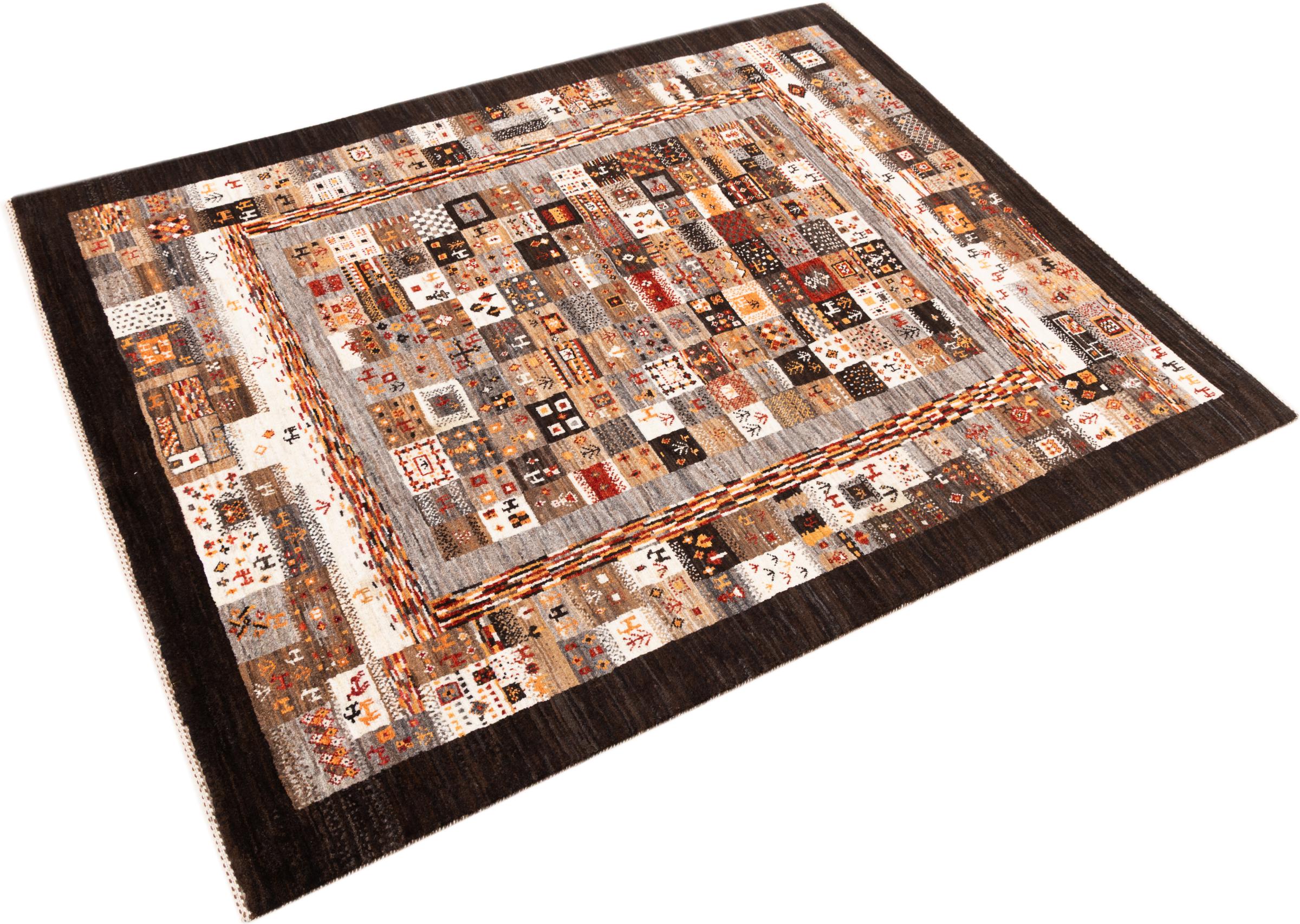 Esta hermosa alfombra es una Gabbeh persa y por lo tanto pertenece a las alfombras Gabbeh de mayor calidad. Las alfombras son anudadas por nómadas o seminómadas en Irán según la artesanía tradicional. Los motivos y patrones simples están inspirados en su mayoría por el entorno inmediato de los nómadas. Por ejemplo, los camellos, árboles o arbustos se pueden encontrar en las alfombras tradicionales. Las alfombras gabbeh persas están hechas de lana de rebaños de ovejas criados localmente. Por lo tanto, la lana se sigue hilando a mano. Así, cada una de estas alfombras orientales encarna un carácter único de la cultura de siglos de antigüedad.
